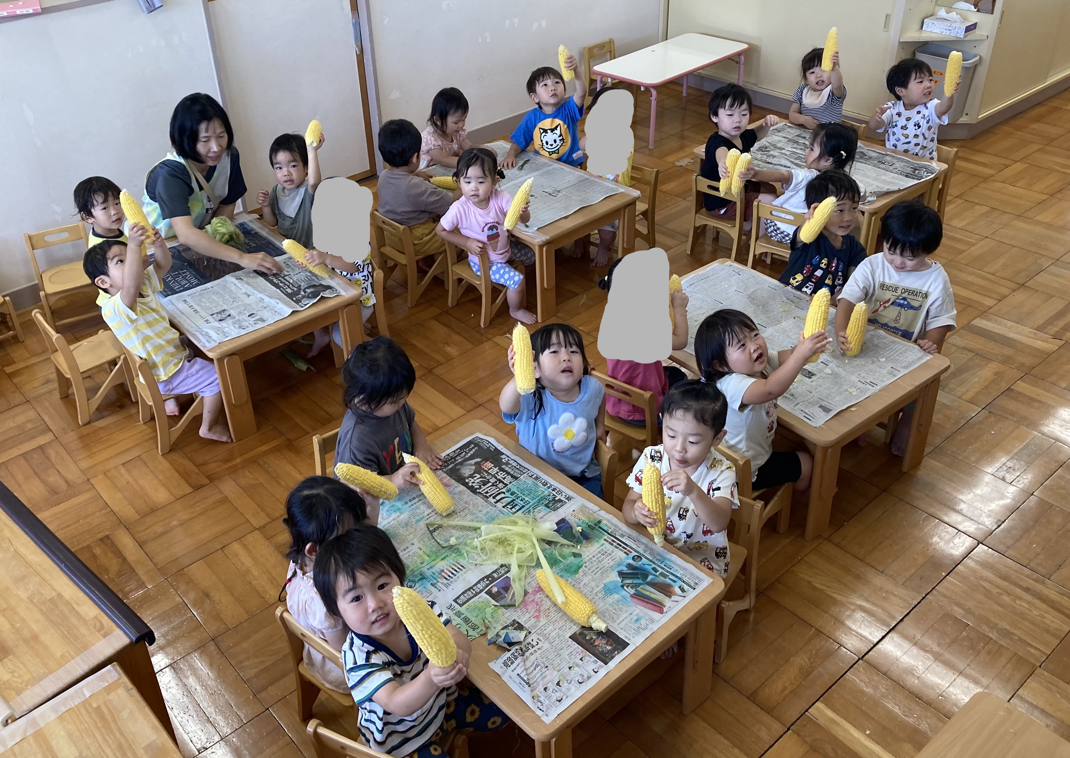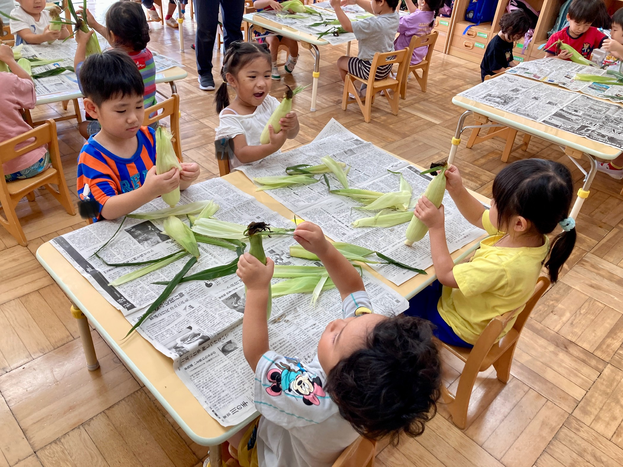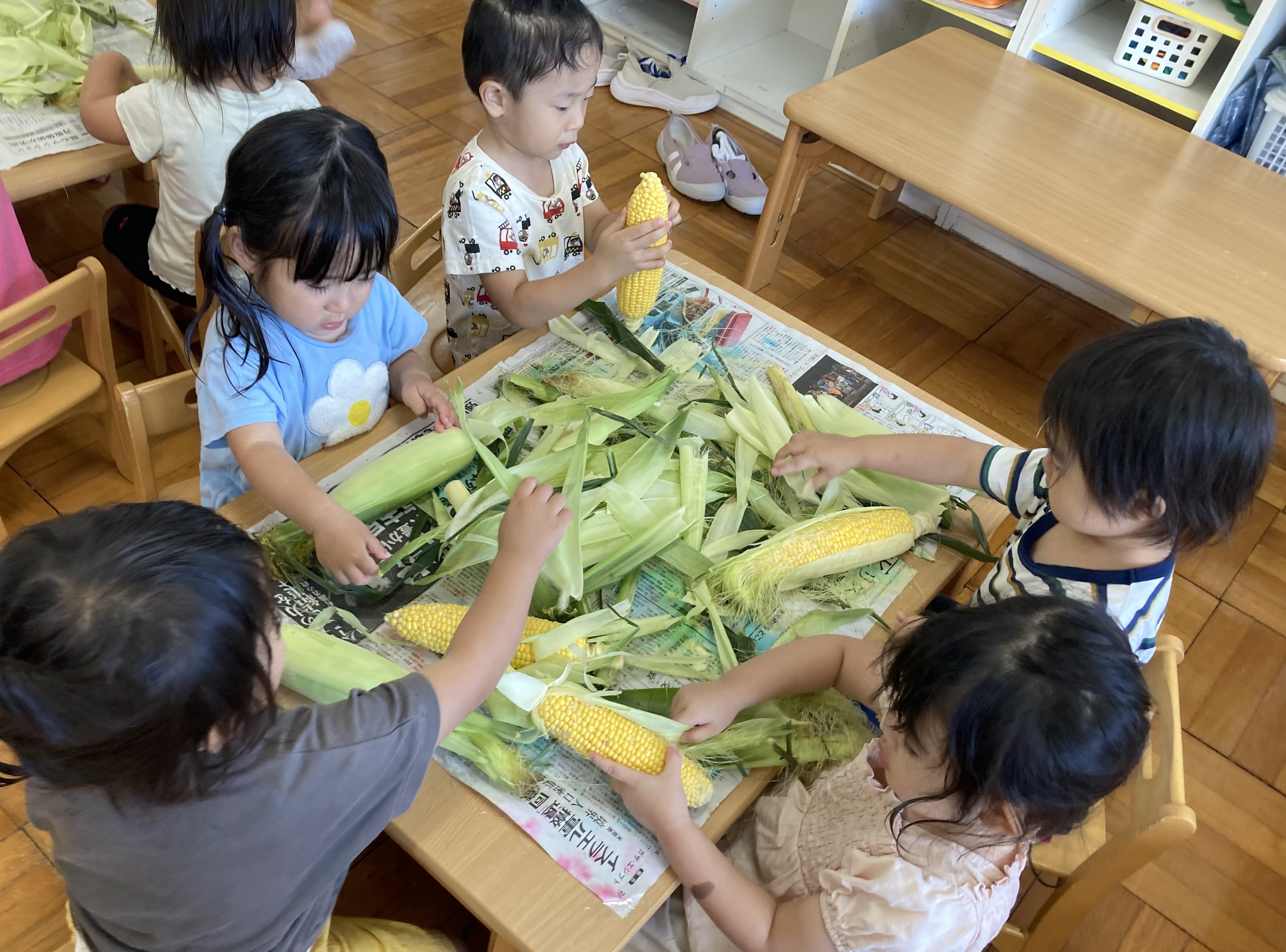 7月から9月に行った食育活動です。7月に2歳うさぎ組、8月に3歳ぱんだ組がとうもろこしの皮むきを行いました。皮をむいていくとだんだんと黄色い実が見えてきて大喜びの子どもたちでした。