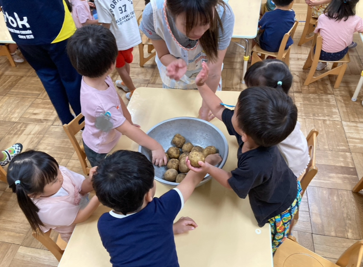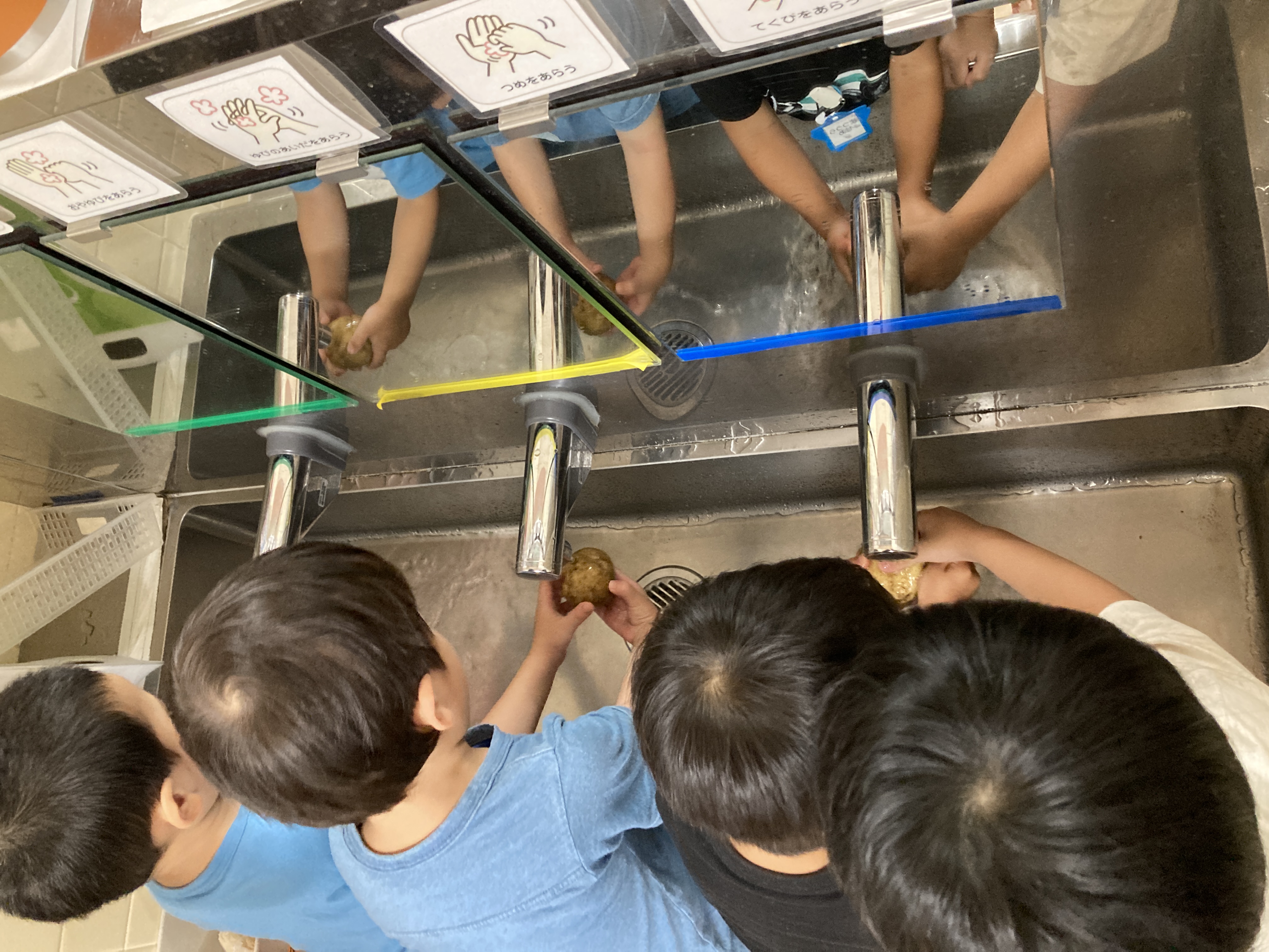 9月には3歳児ぱんだ組がじゃがいも洗いを行いました。翌日の給食に出るじゃがいもをとても丁寧に洗ってくれました。ハヤシライスにじゃがいもが入っていて、嬉しそうにモリモリ食べていました。
