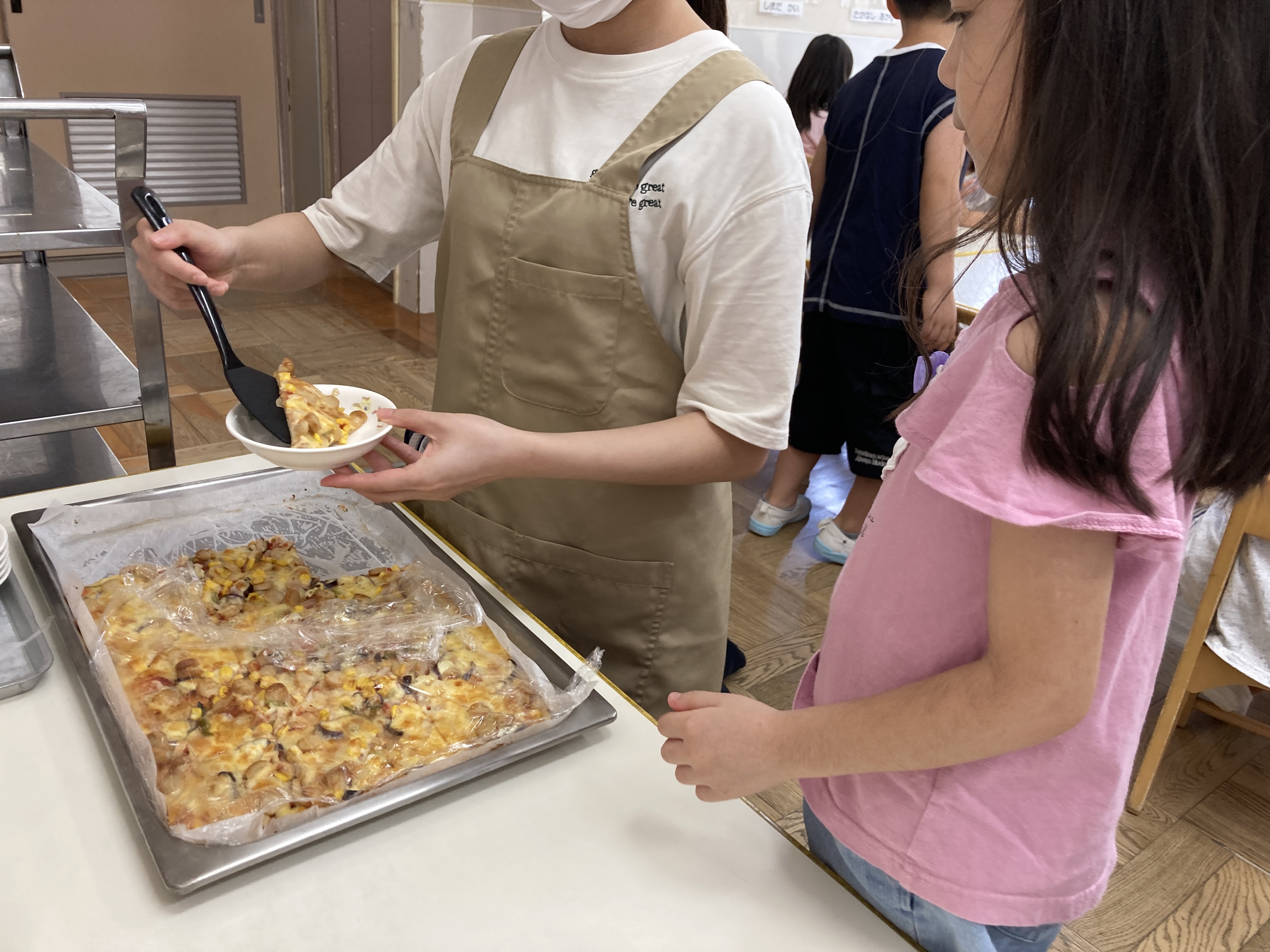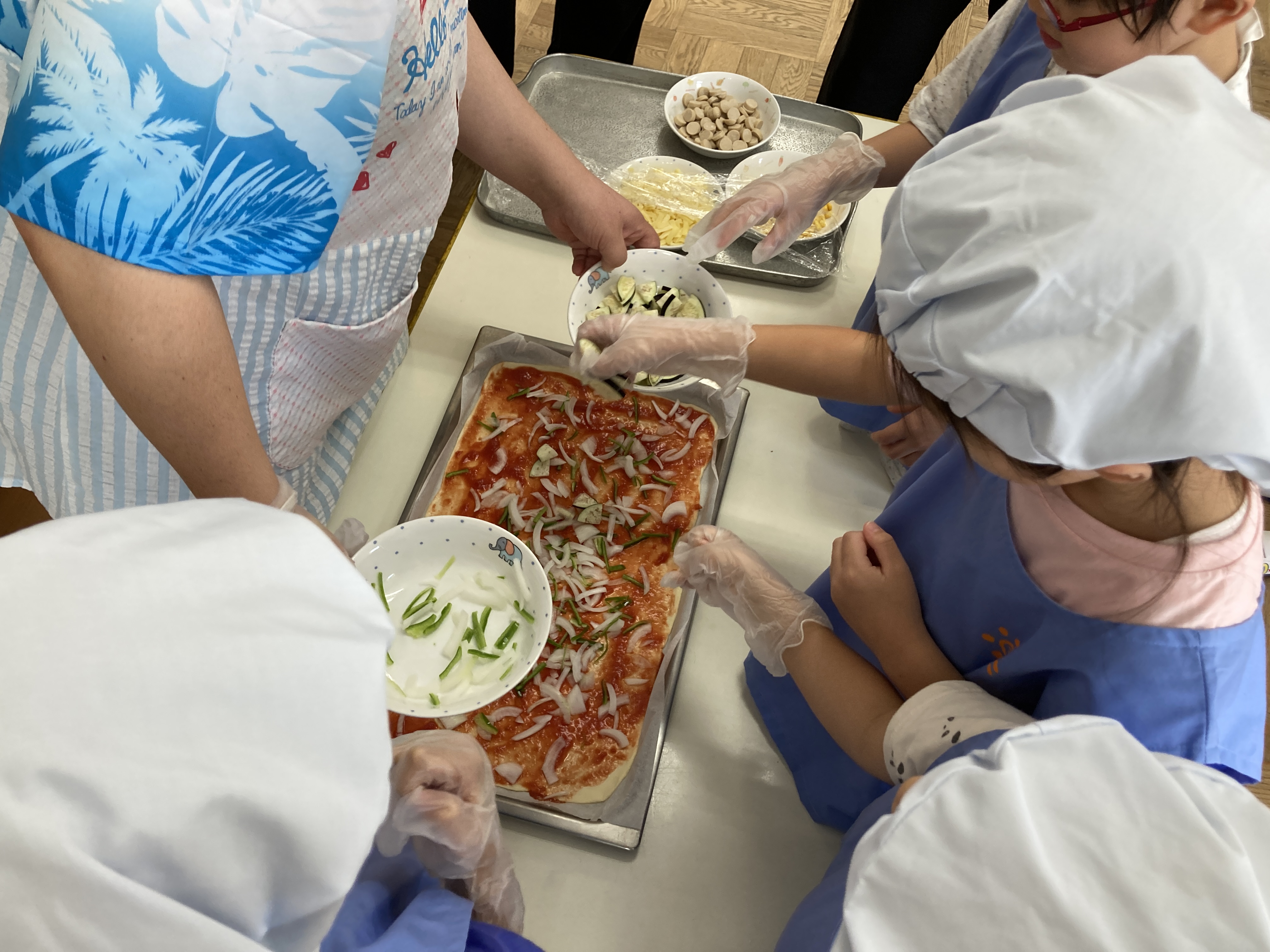 8月下旬のおやつで5歳児くじら組さんがピザ作りを行いました。生地をこねて具材を乗せるところを行ってくれました。具材は各クラスが畑で育てた、ナス・トマト・とうもろこしを入れていただき具だくさんの美味しいピザが出来上がりました。どのクラスもニコニコで食べていてあっという間に完食したお友達もいました。