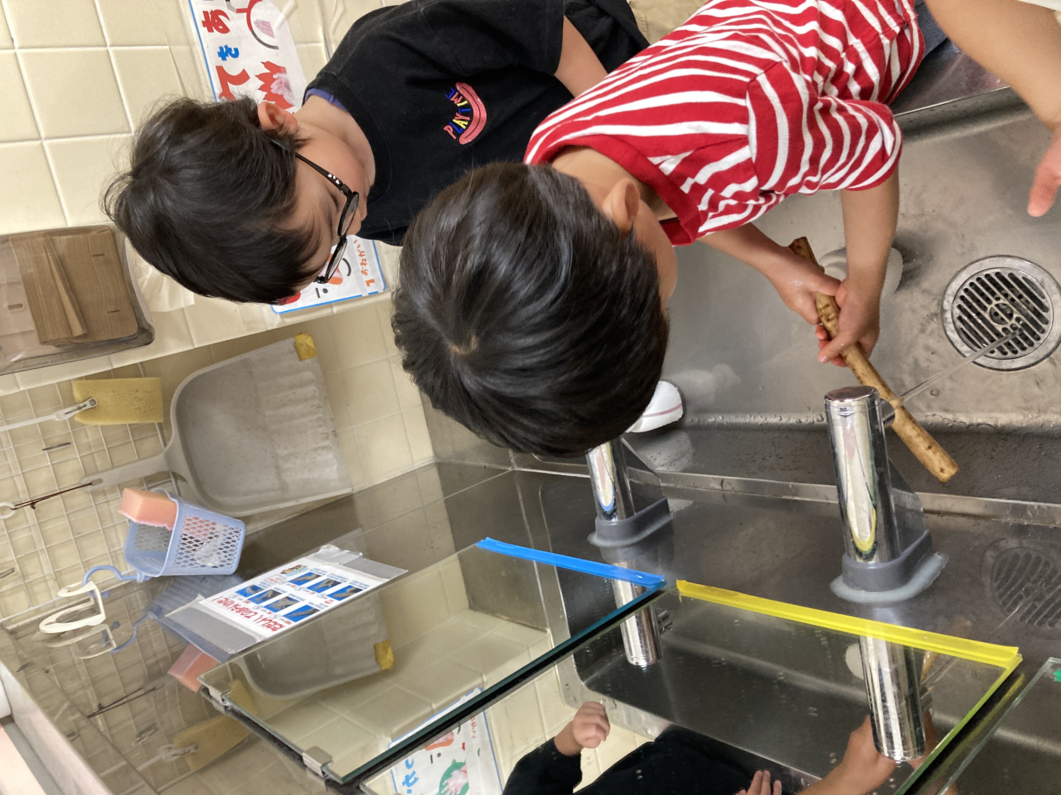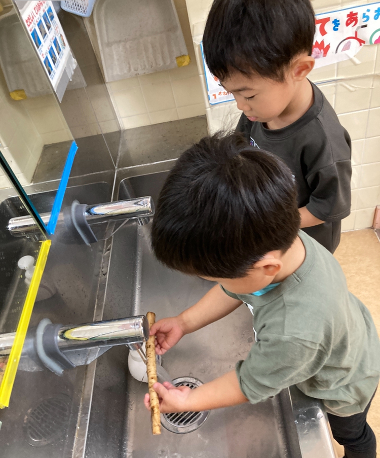 3人一組になって一本のごぼうを丁寧に洗っていきました。泥が落ちて白くきれいになったことを喜んでいて、「みんなに見せる!」と嬉しそうに見せていました。