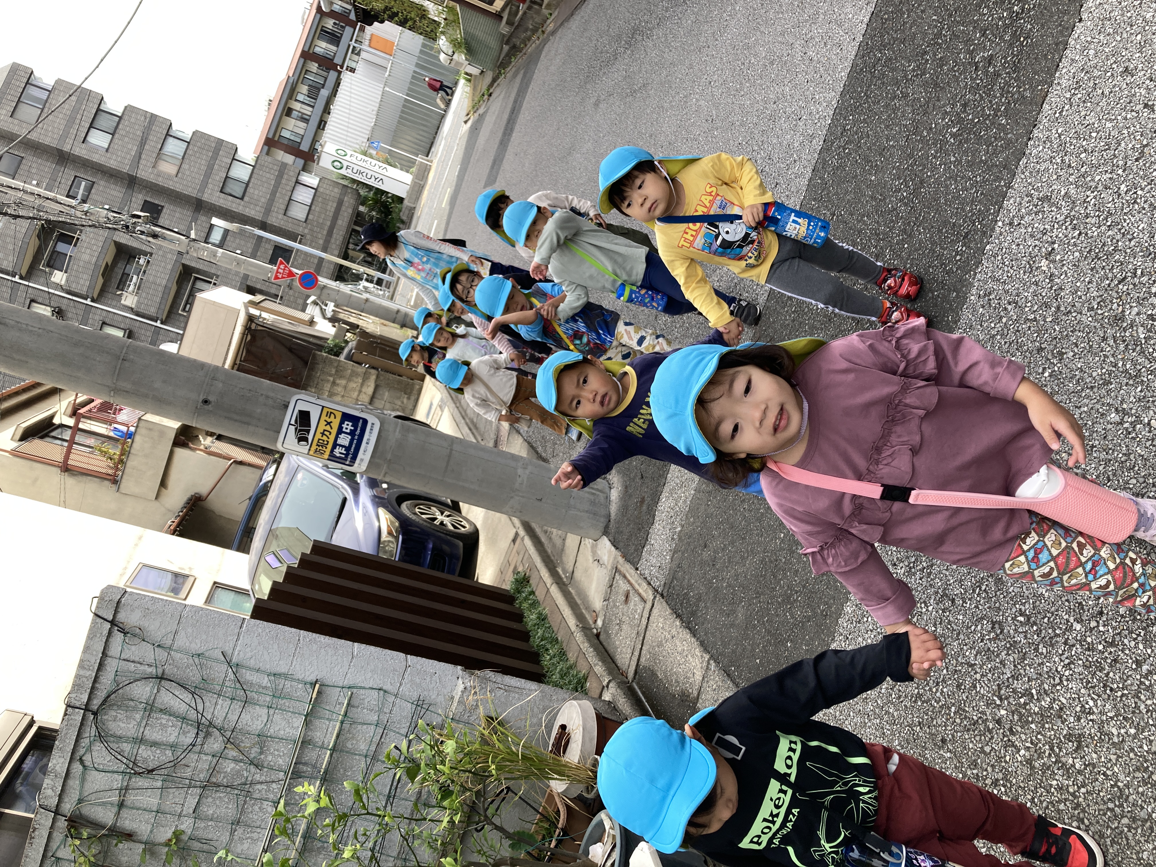 「いってきまーす!」と園舎側を向いて声を掛けると、事務所の先生はもちろん、全クラスのお友達が「いってらっしゃーい!」と返事をしてくれて温かく送り出してくれました。