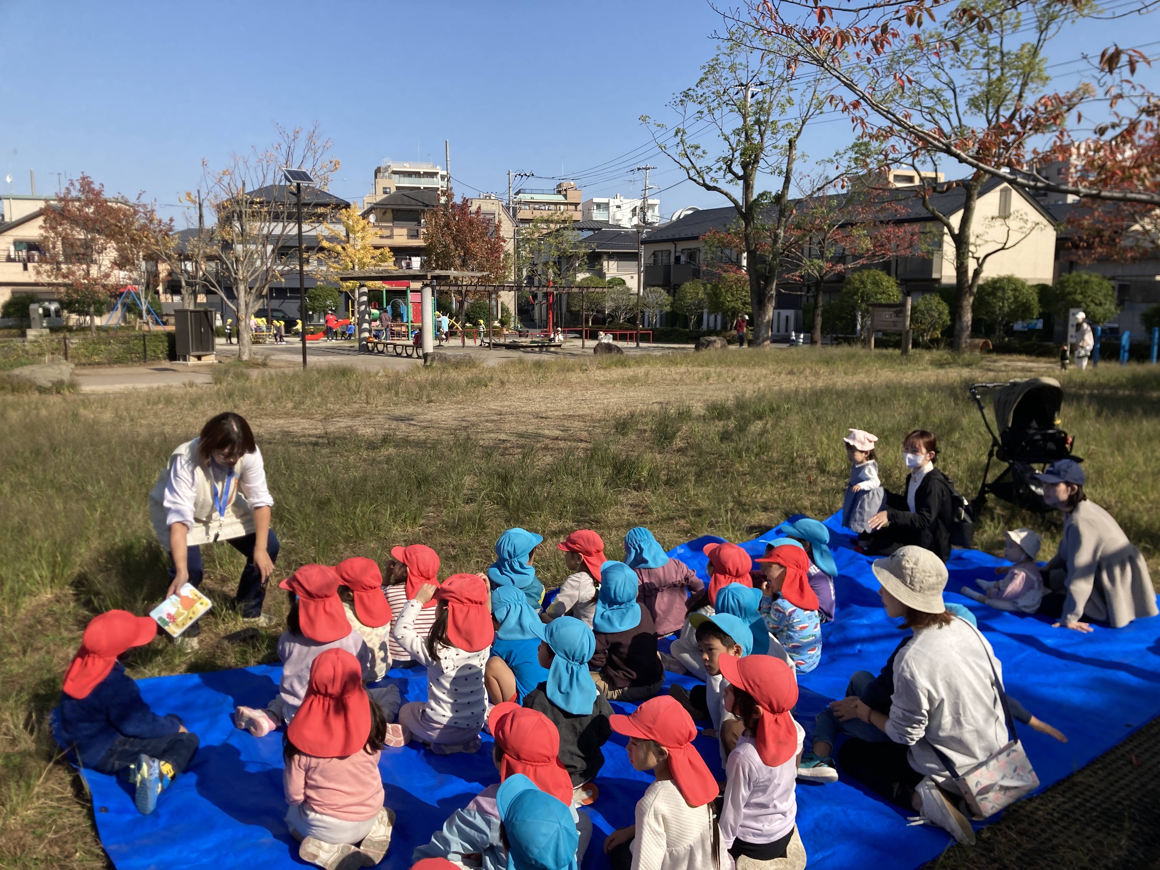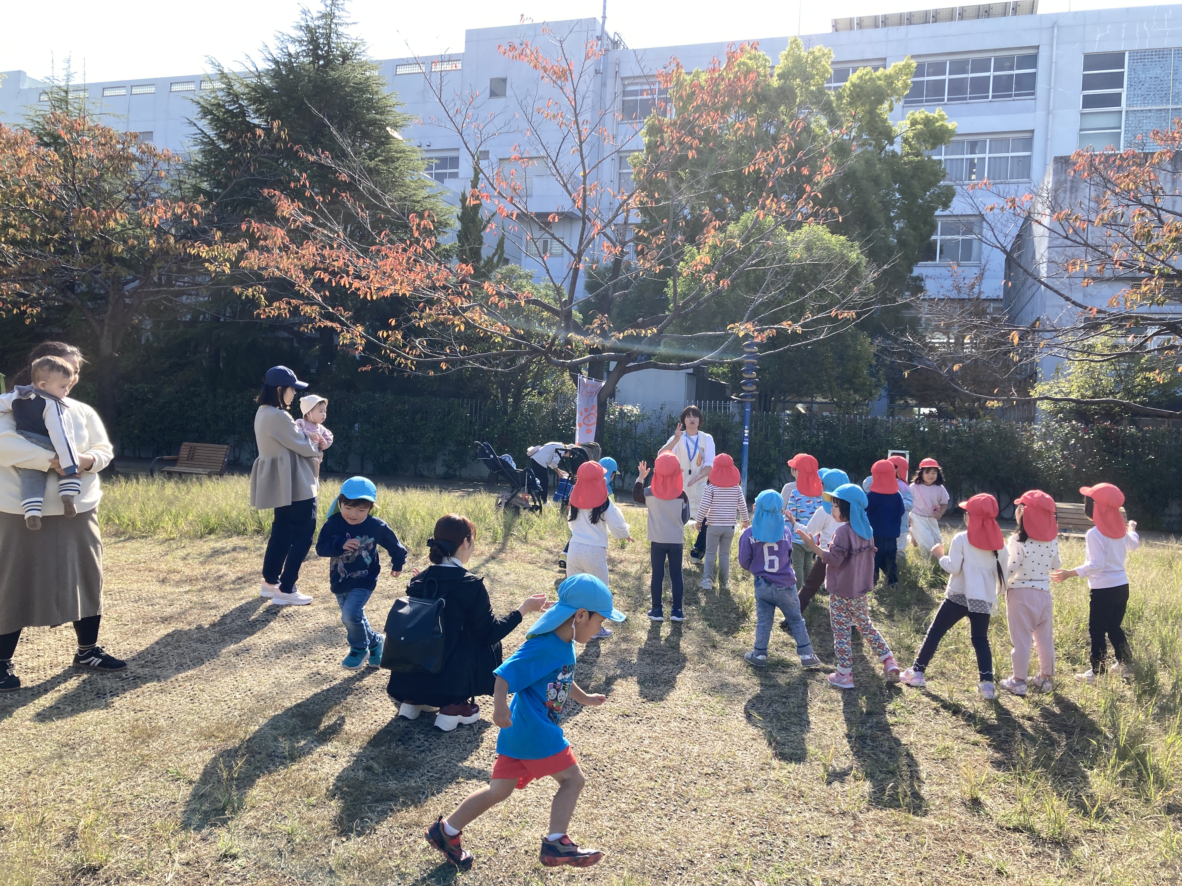 まず最初に『秋のしりとり歌』とパネルを見ながら、4歳児きりん組さん、3歳児ぱんだ組さんがしりとり歌を歌ってくれました。くり→りんご→ごぼう→うんどうかい→いか→かつお→おおさわぎ→ぎんなんという流れを歌っていきます。子育てひろばのお友達も楽しそうに見て聞いてくれていました!