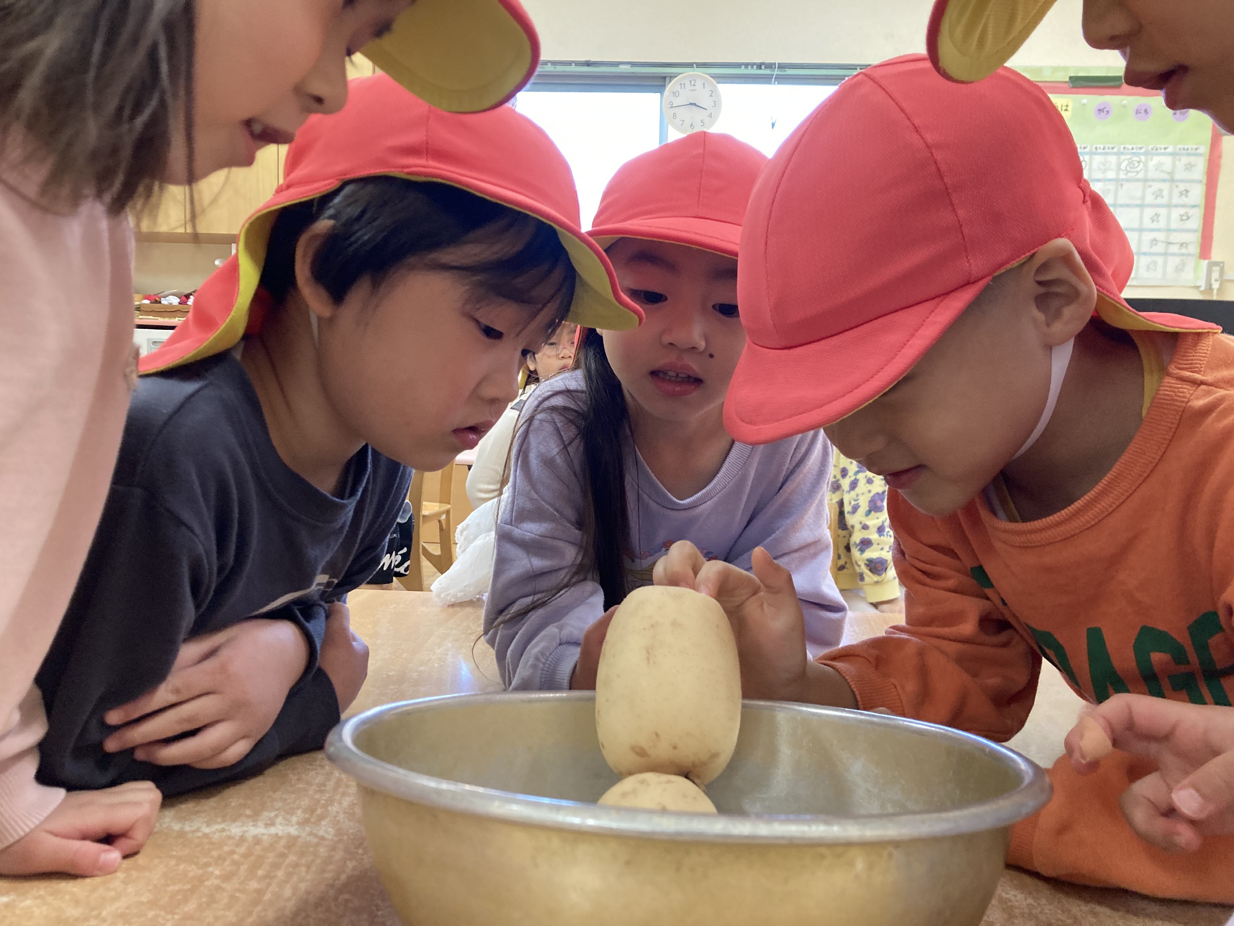 れんこんに触ったり、穴が開いていることに気付いたり、匂いを嗅いだりとじっくりと観察する姿が見られました。翌日17日の給食でトナカイの角の部分として使われ、喜んで食べていた子ども達でした!