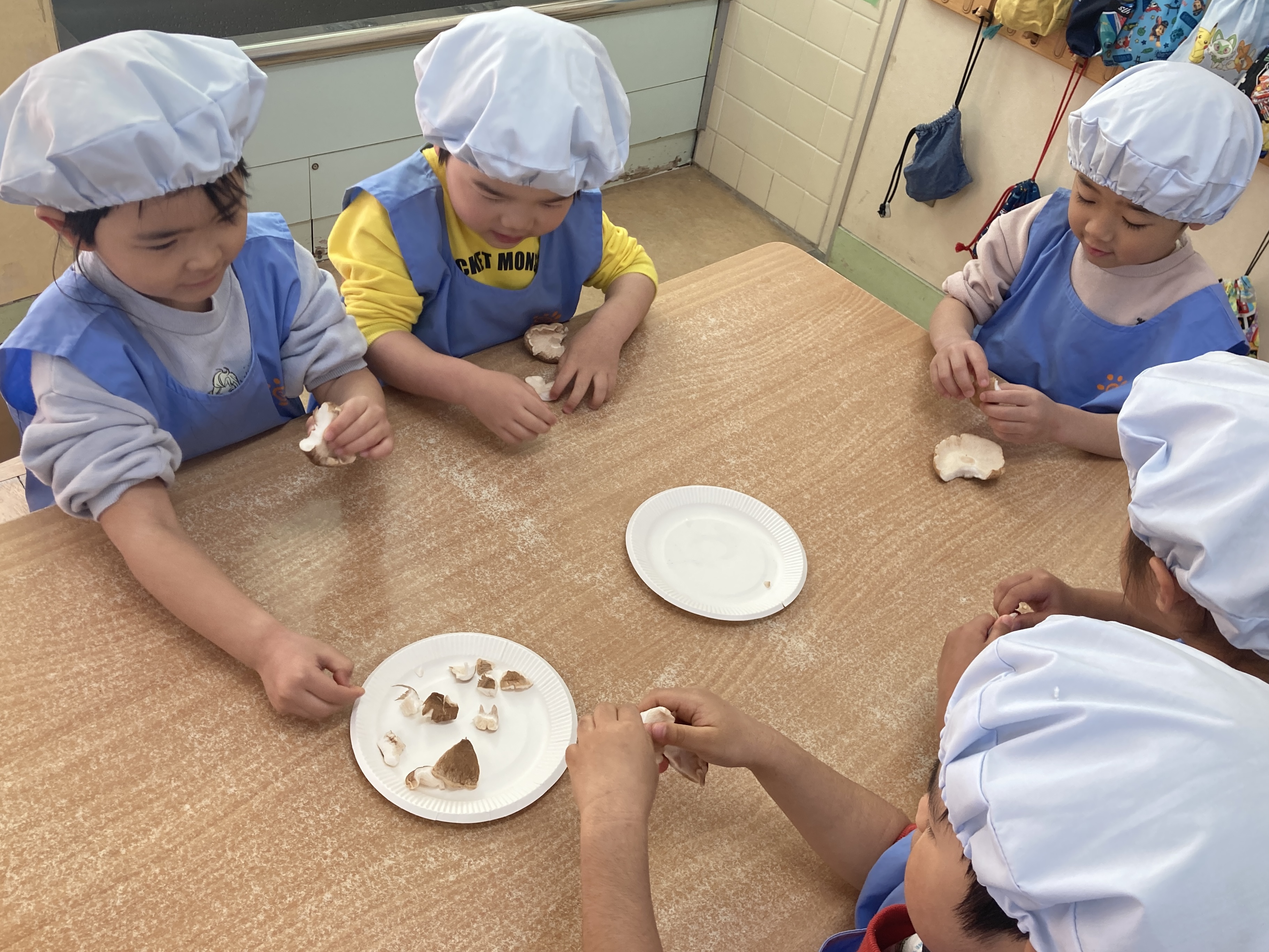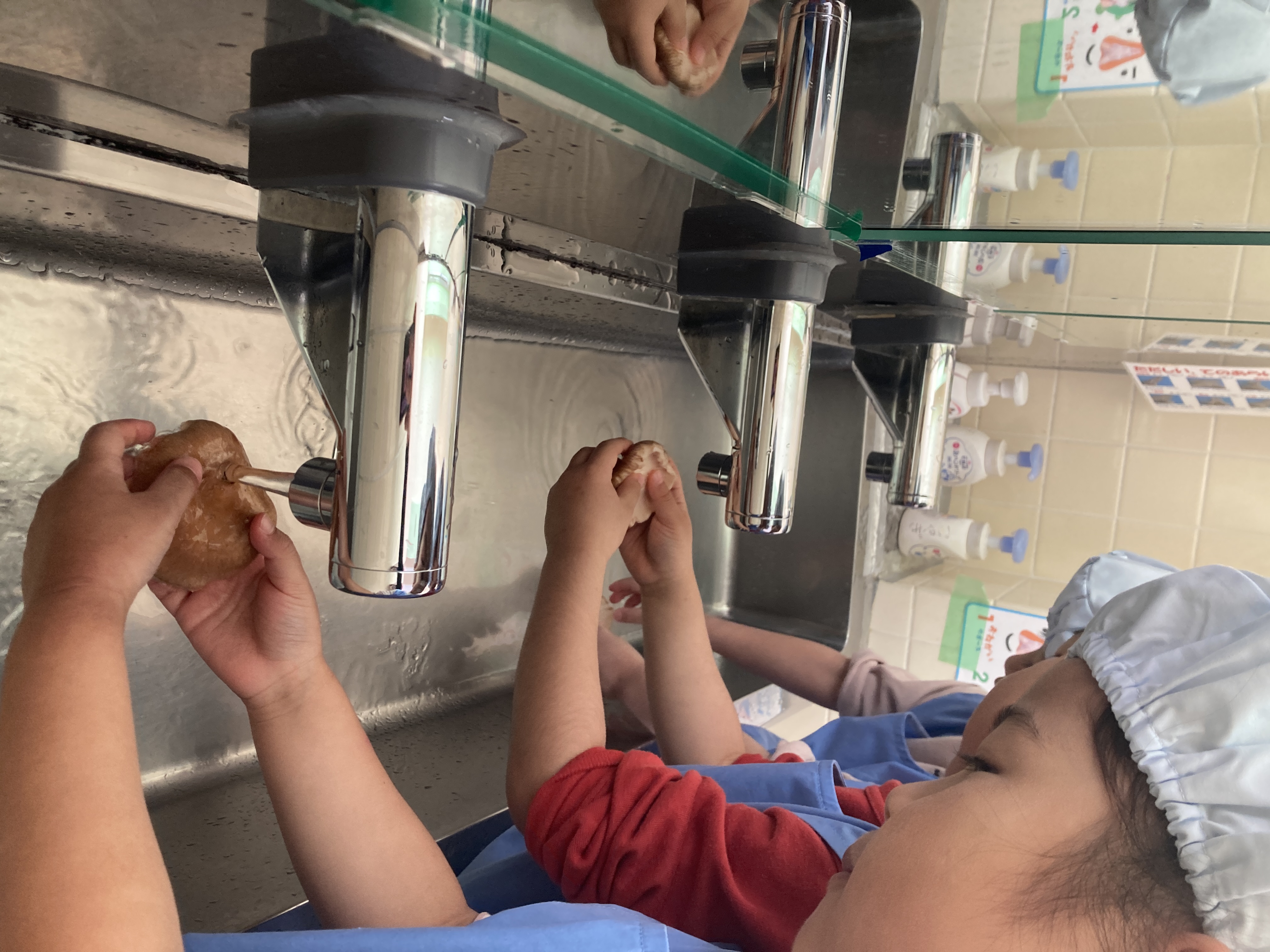 一人一つしいたけを丁寧に洗い、食べやす大きさに裂きました。