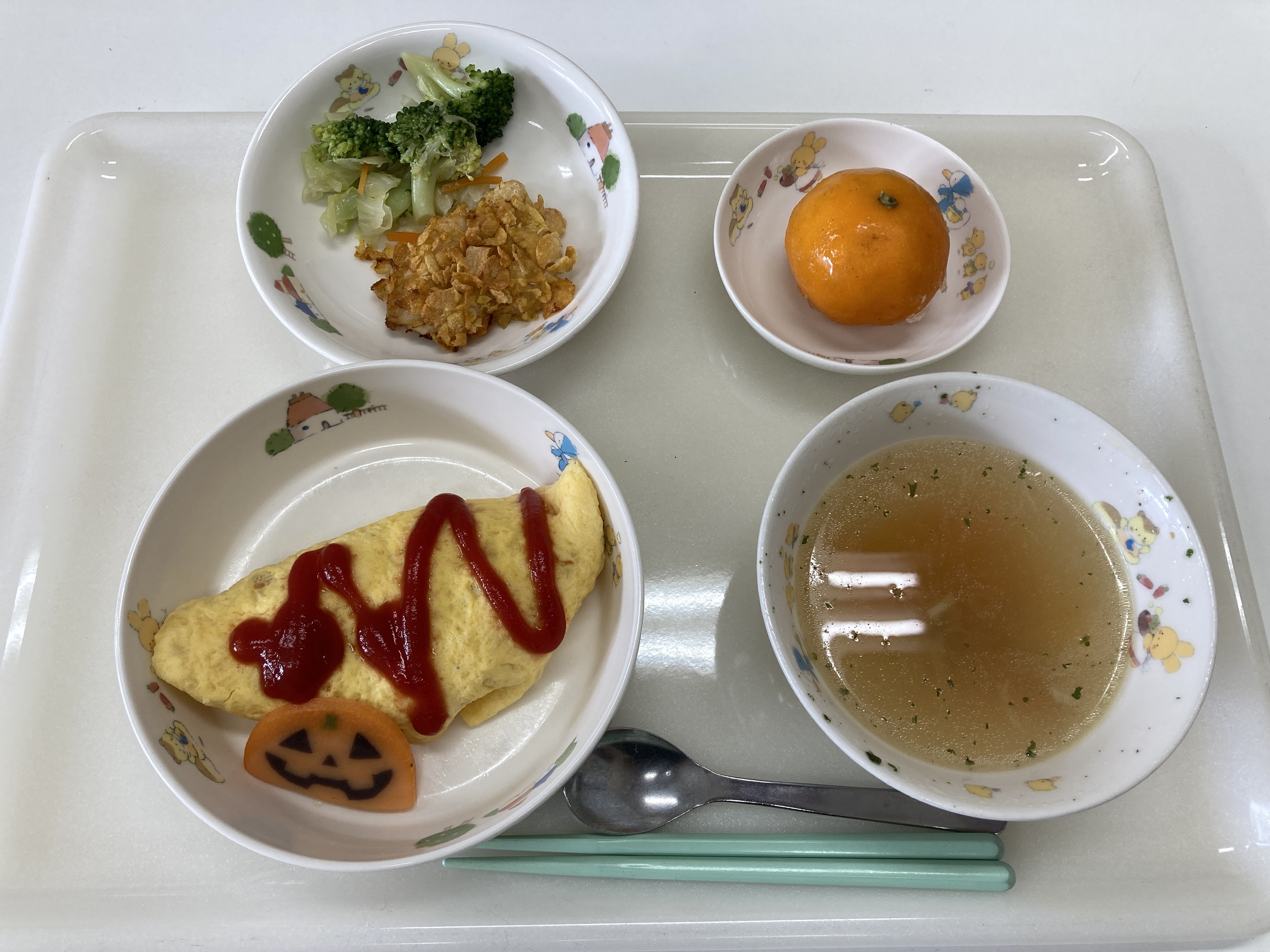 オムライスの横には、可愛らしいパンプキンお化けのかまぼこ!