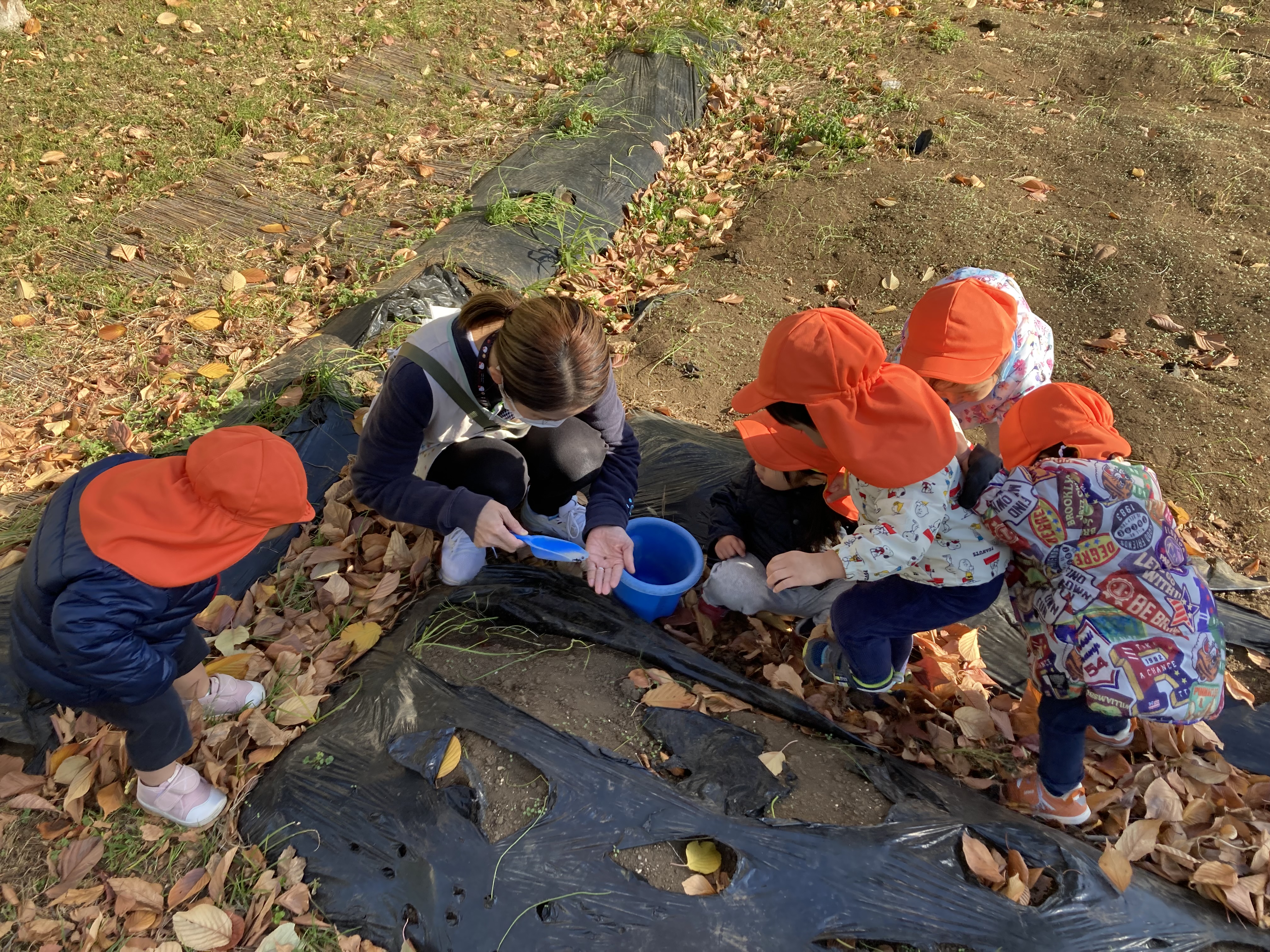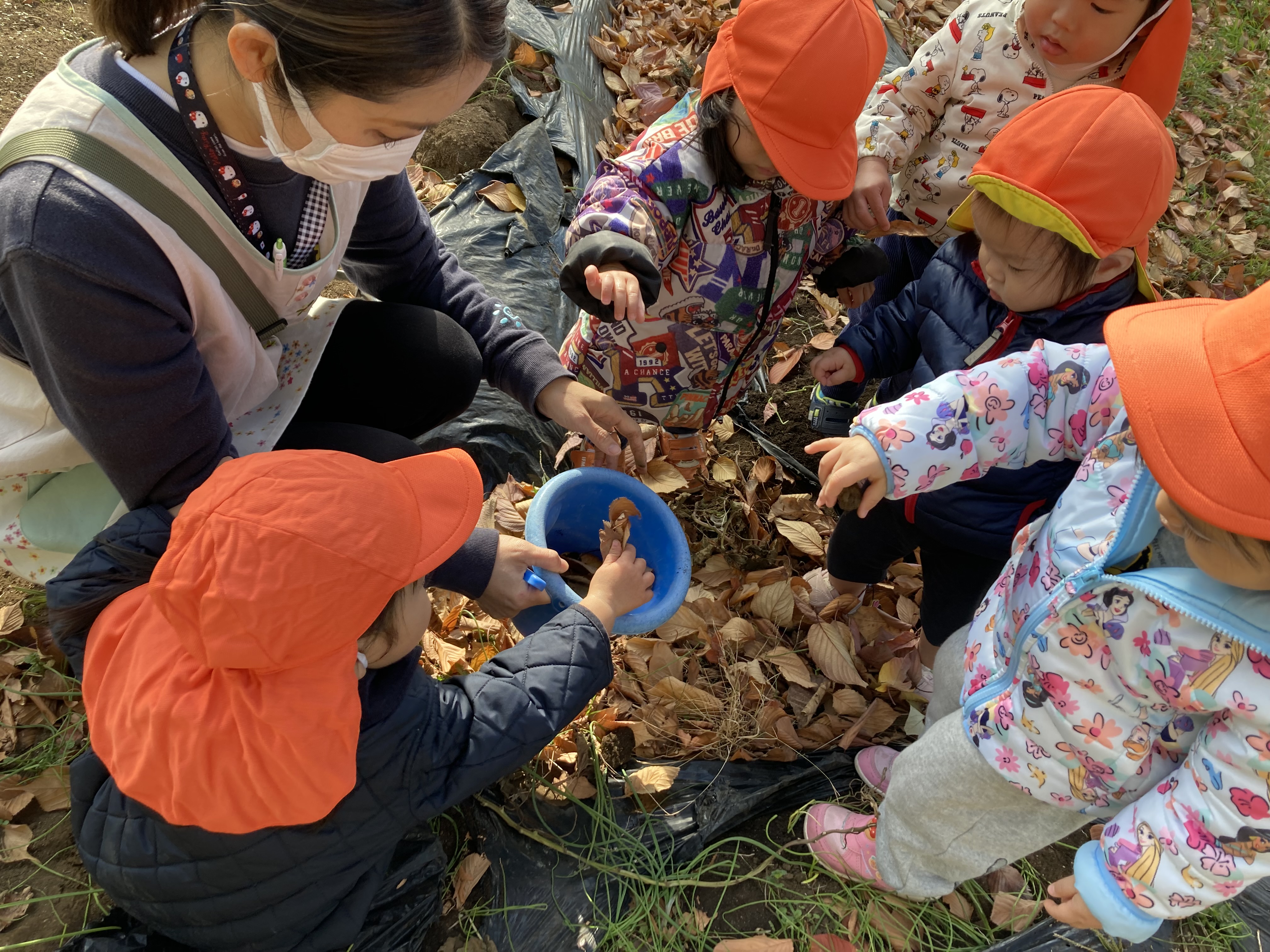 畑に行き野菜などを見ていると土に興味を持ち始めたひよこ組の子どもたち。