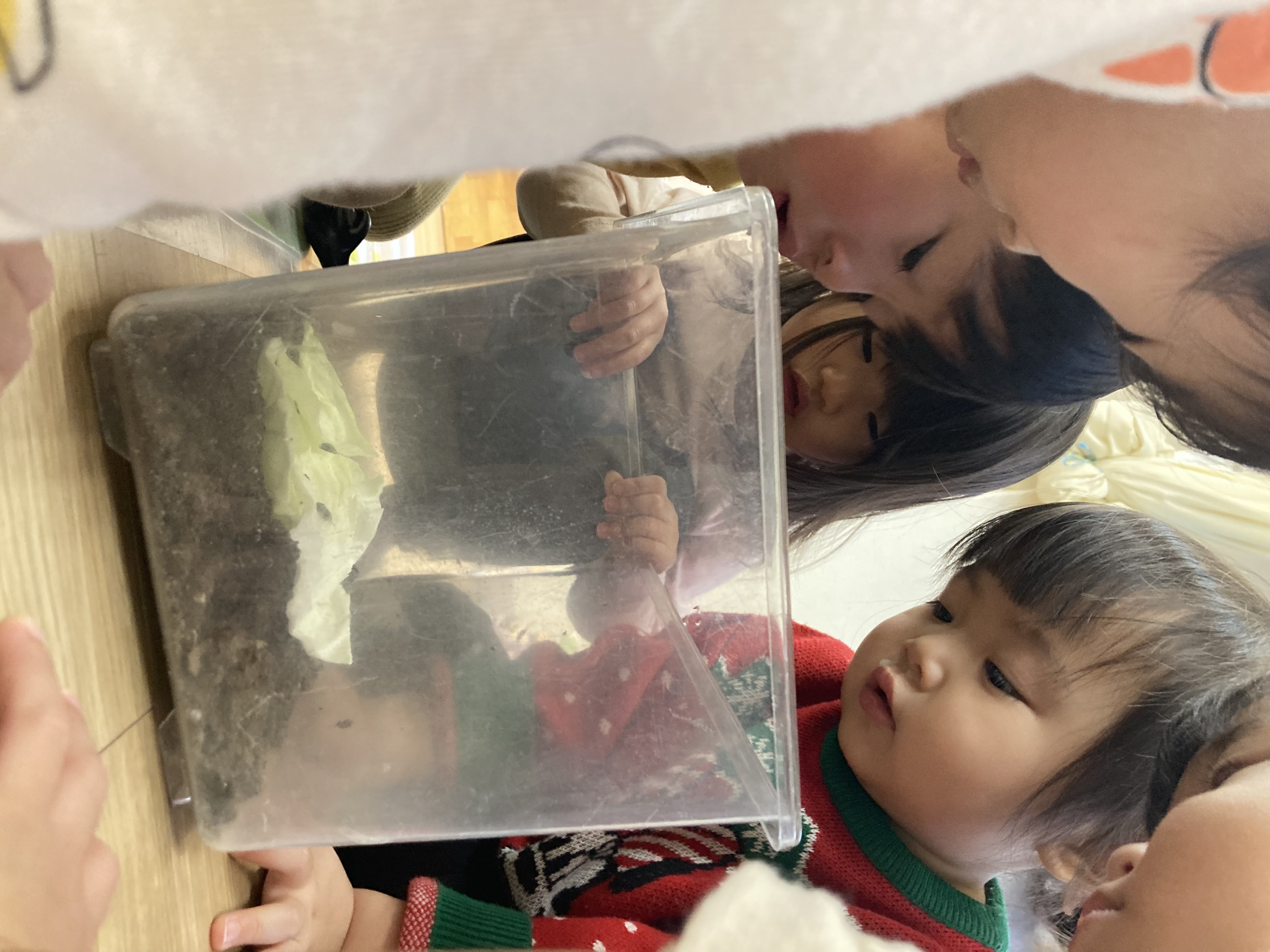 その間、だんごむしに葉っぱだけではなくキャベツをあげてみたりもしました。「あむあむしたねー」「おいしい?」と観察をしながら子どもたちの中で可愛らしい会話が聞こえてきていました。
