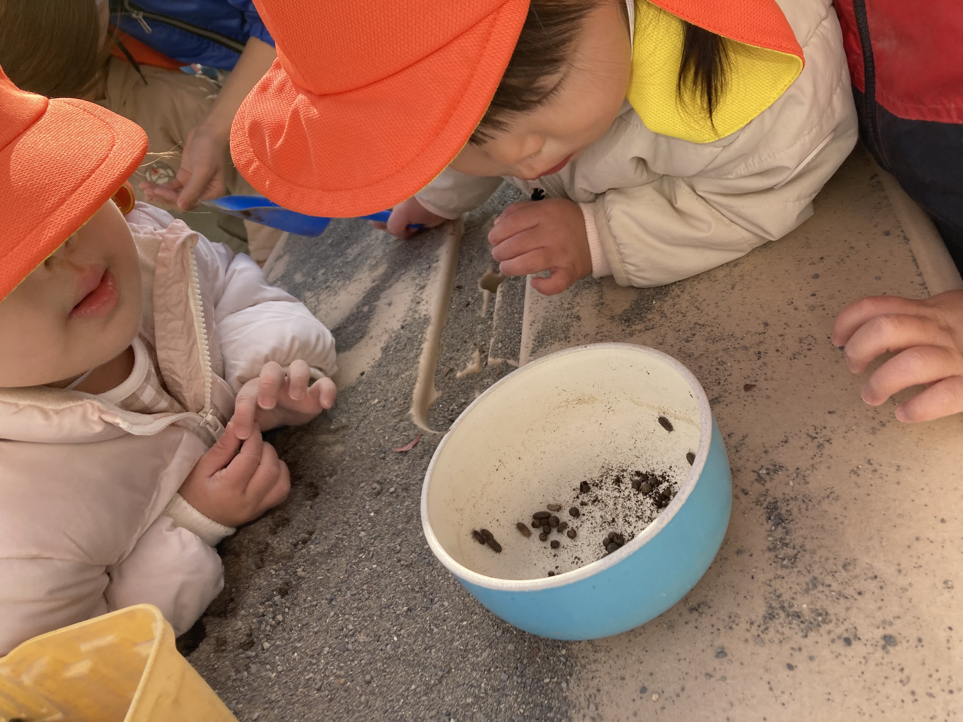 土の感触を楽しんでいたので別の畑へ行き土に触れられるようにしたところ、小さくて可愛らしいだんごむしを発見!「だんごむしだー!」と言う声にみんなが集まり観察タイムがスタートしました。