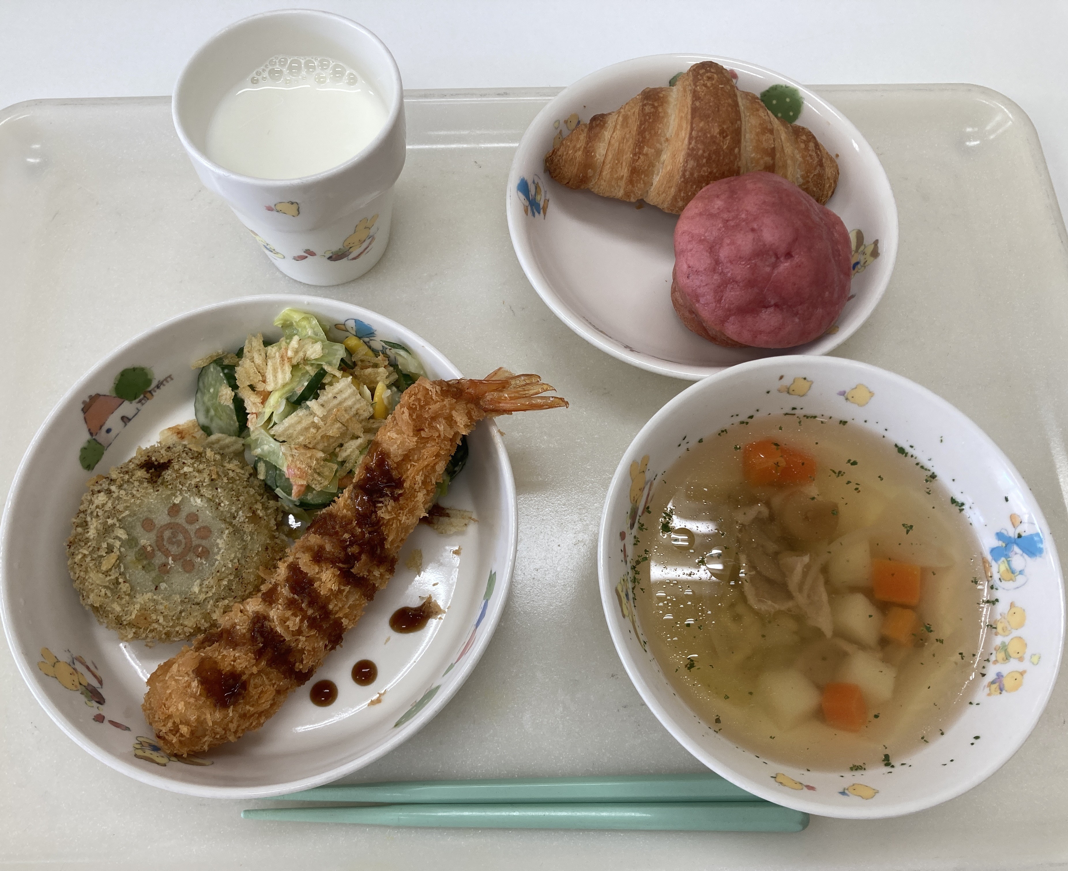 大きなエビフライをほおばる姿や、パンをおかわりする