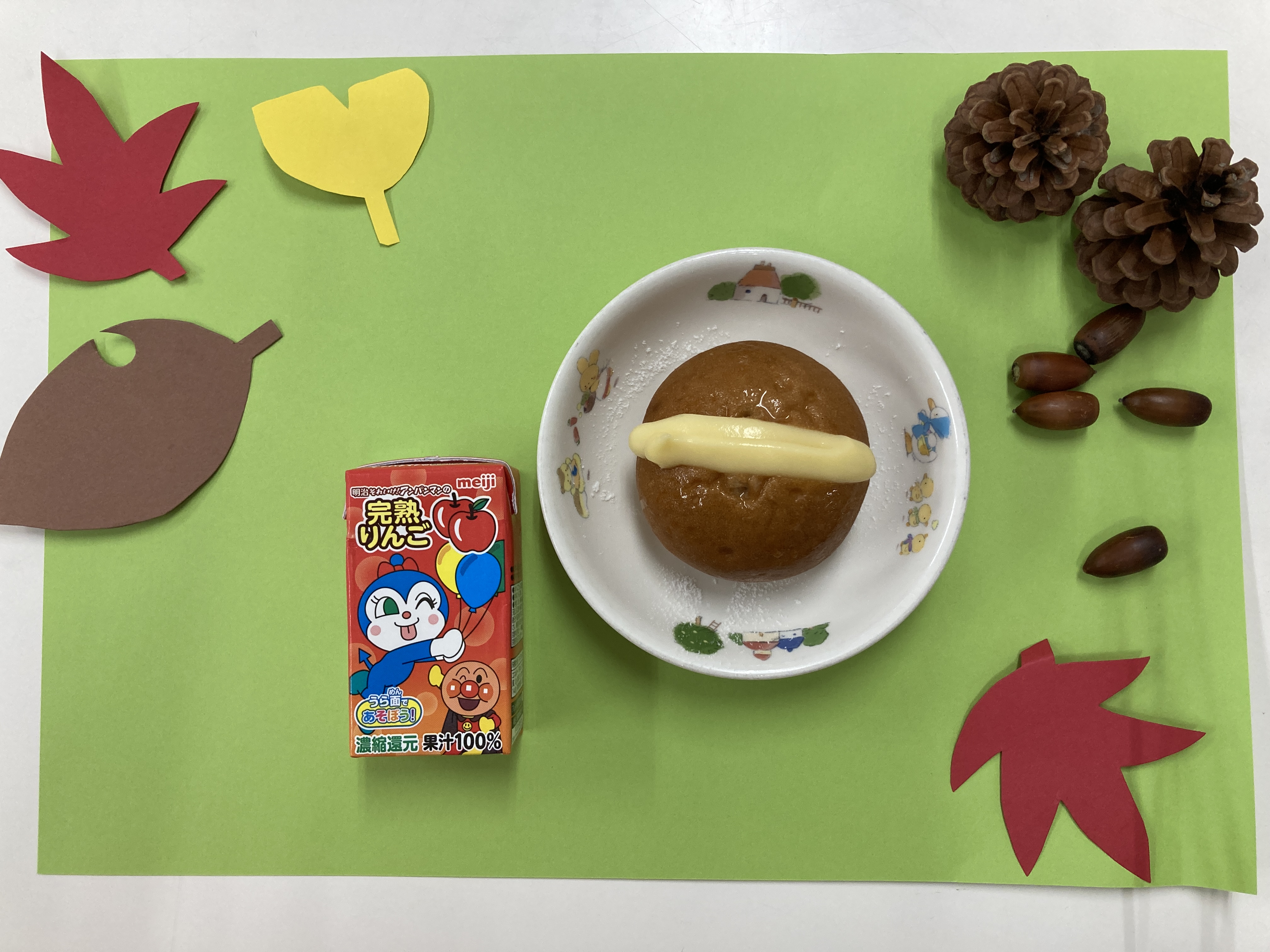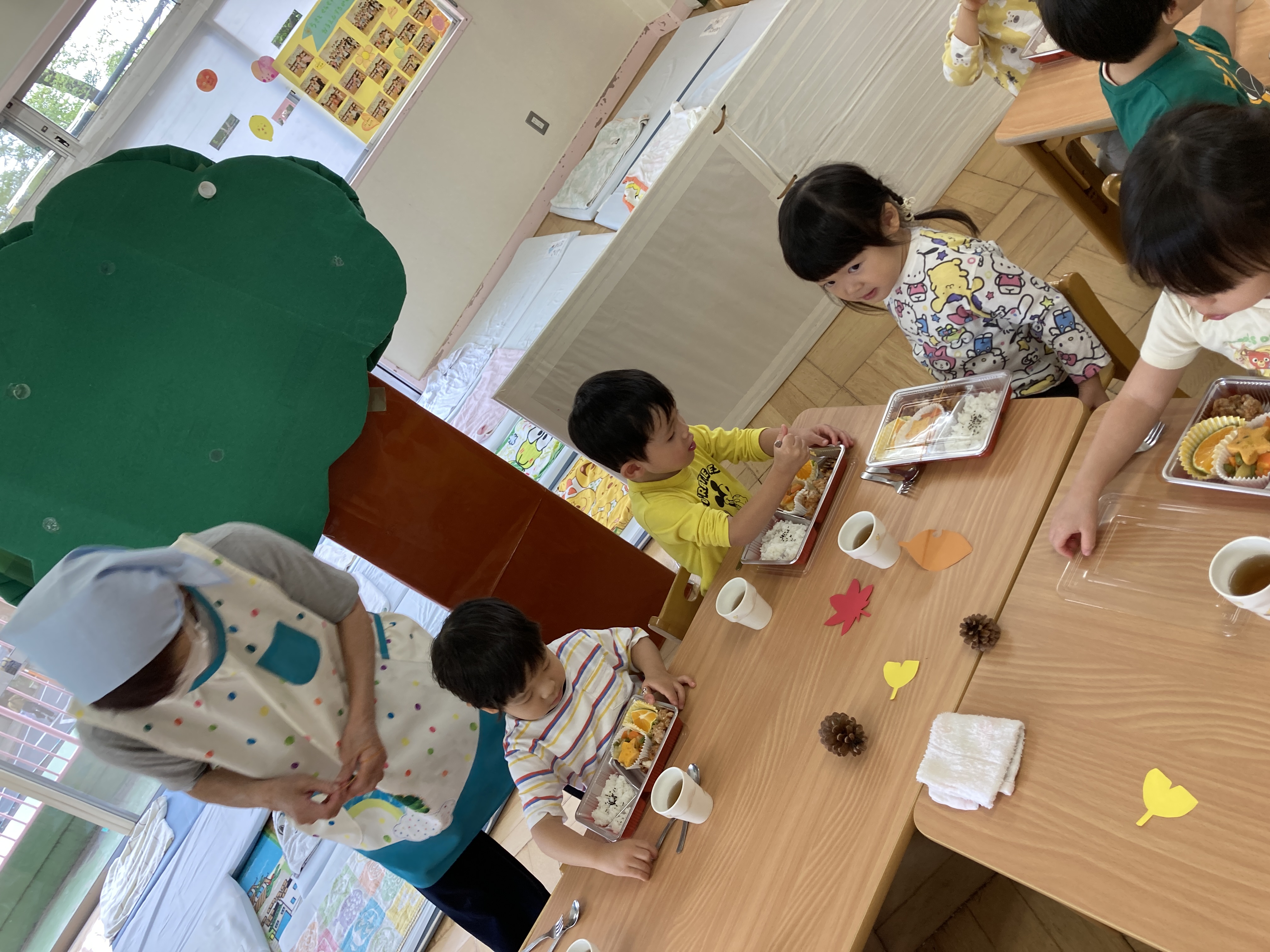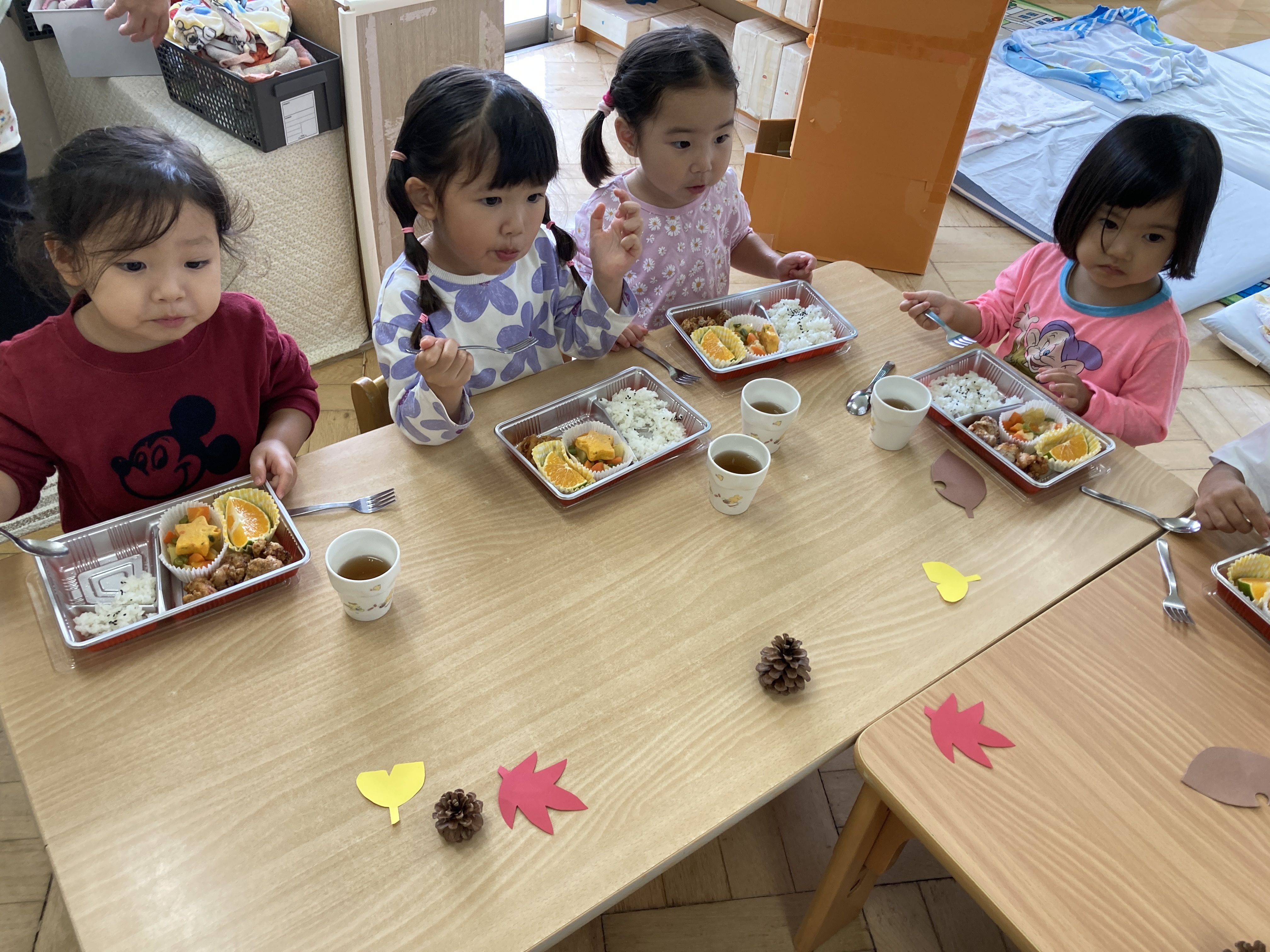 2歳児クラスでは、赤く染まった葉っぱや松ぼっくりをテーブルに置いてピクニック気分を味わいながらお弁当を食べました!