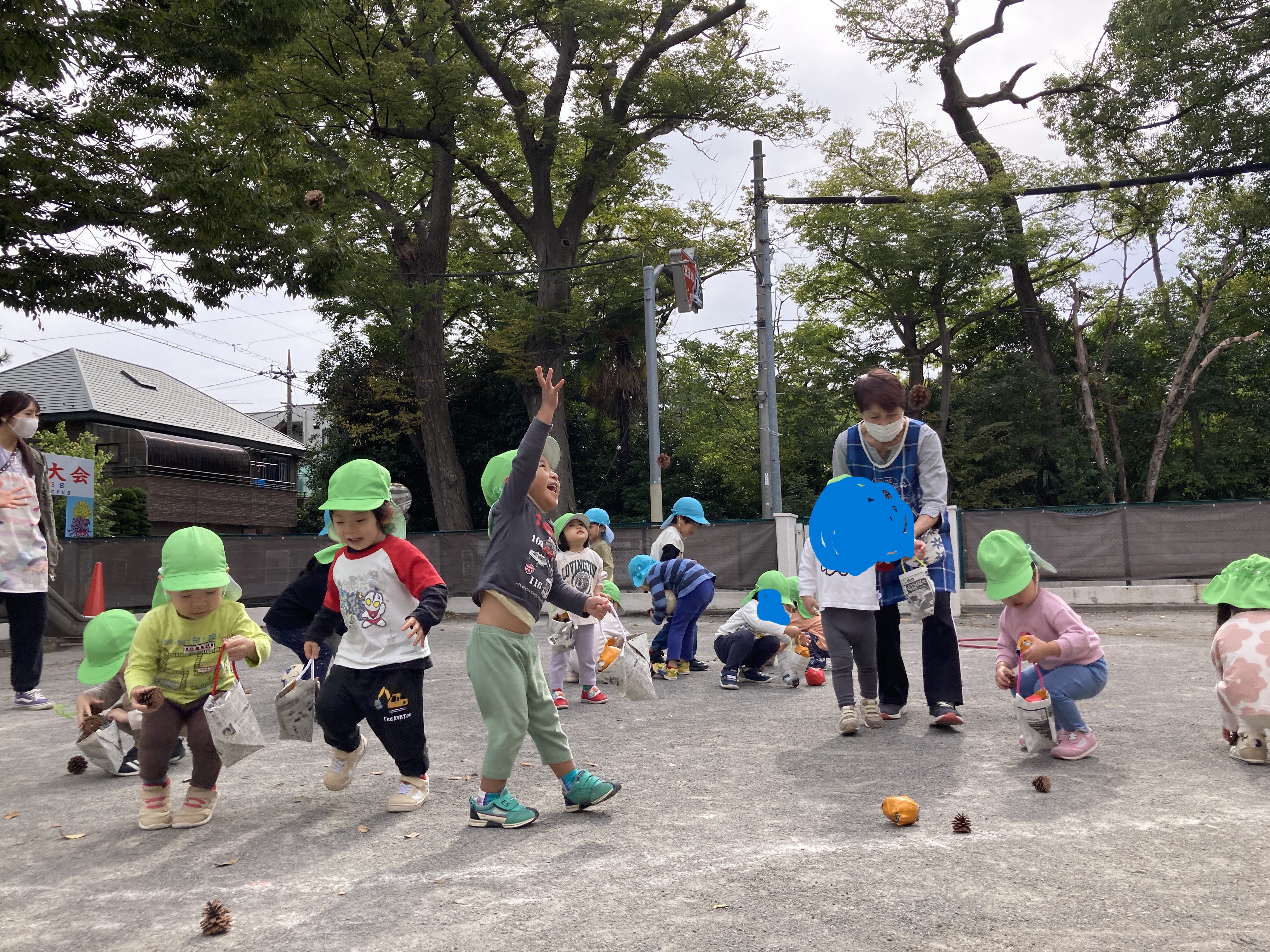 4歳児や1歳児も一緒にどんぐり松ぼっくりひろい。