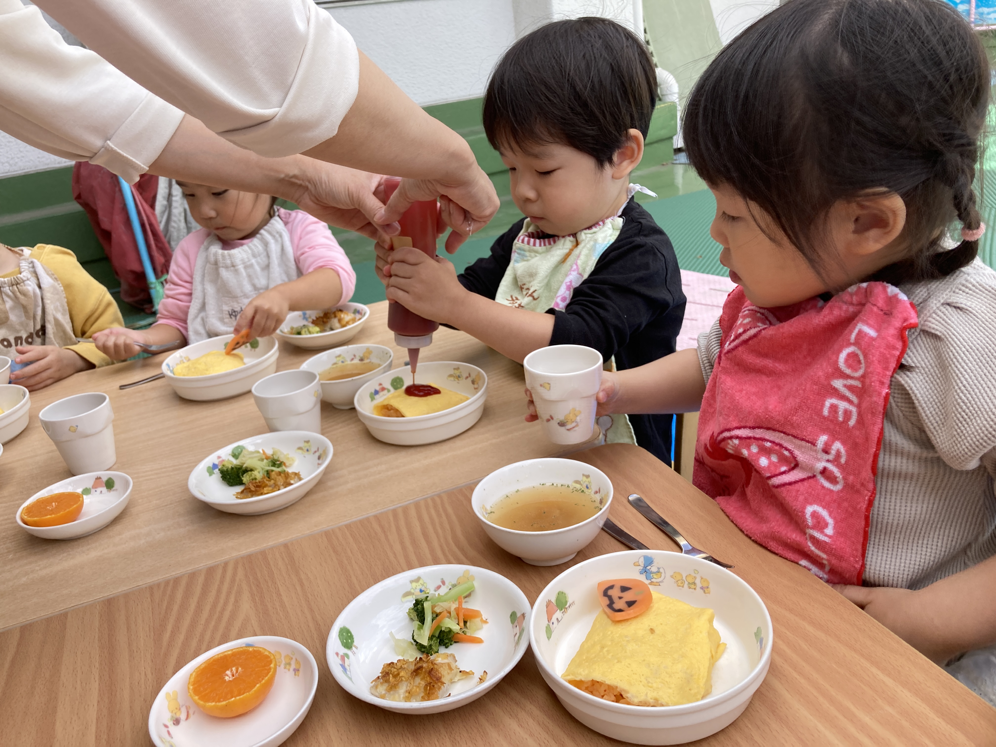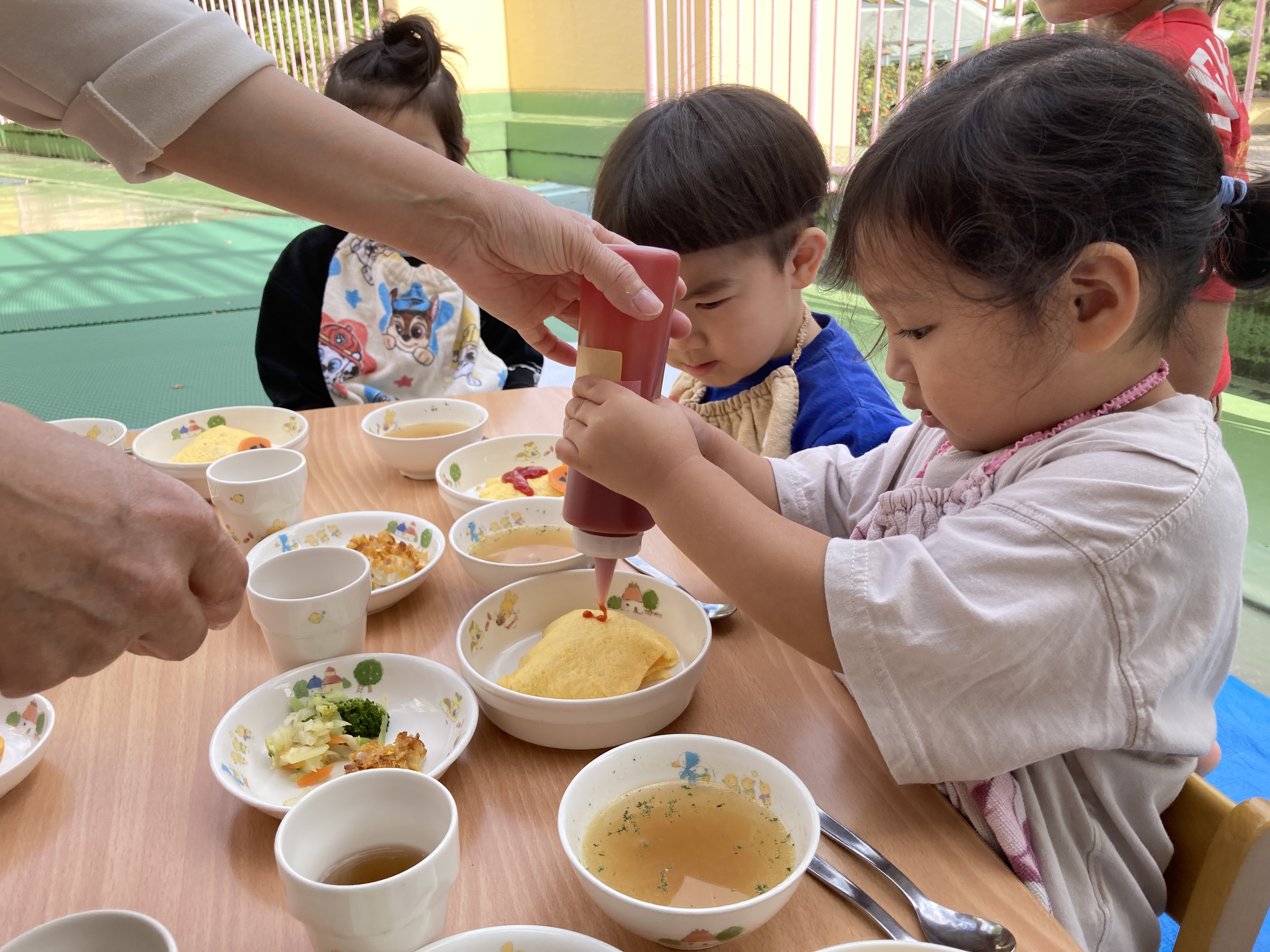 「おーい、おいしいよー」「ケチャップつけるのよ」
