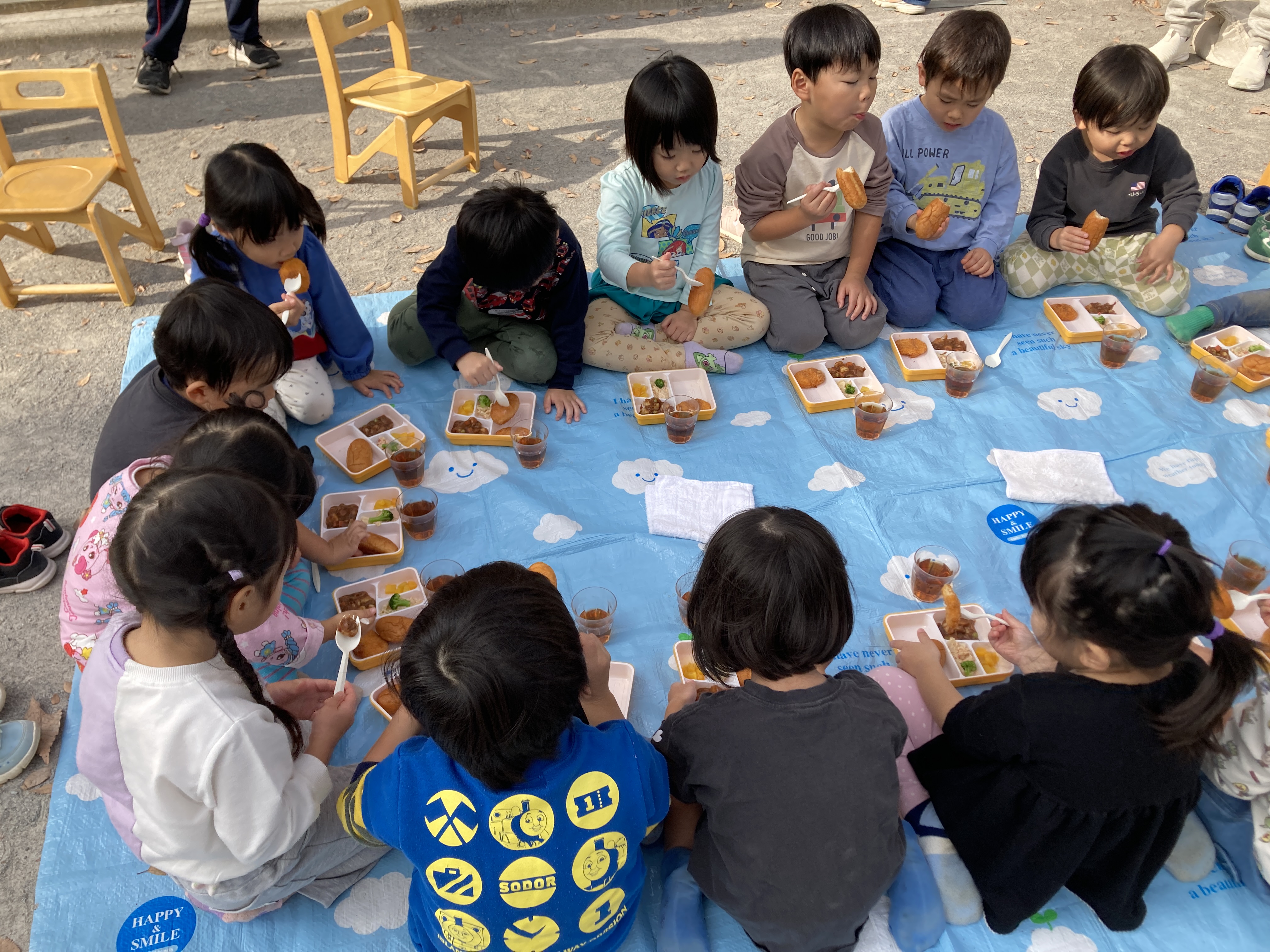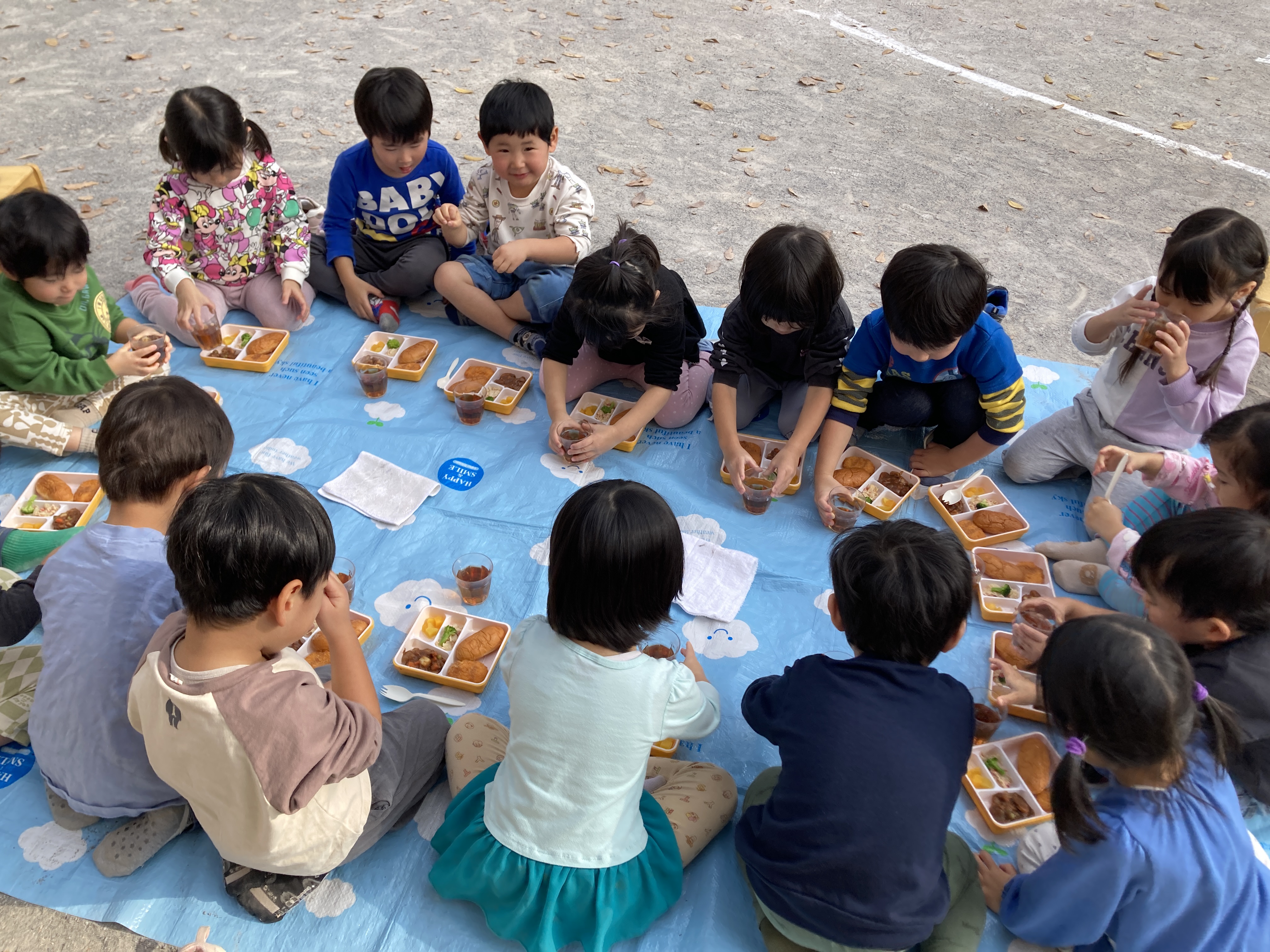 朝、子ども達に園庭で食べる事を伝えると「いえーい!」と喜び