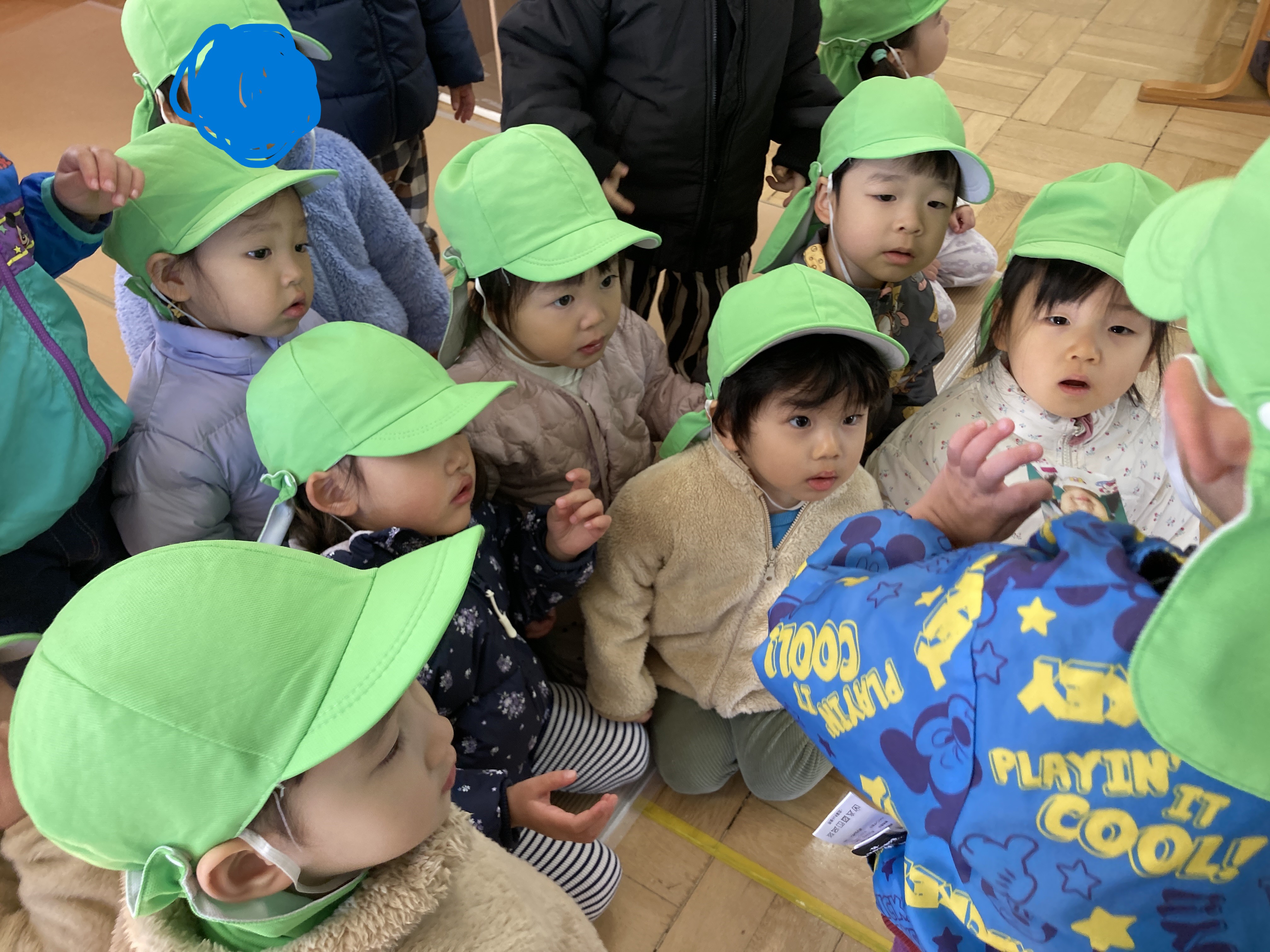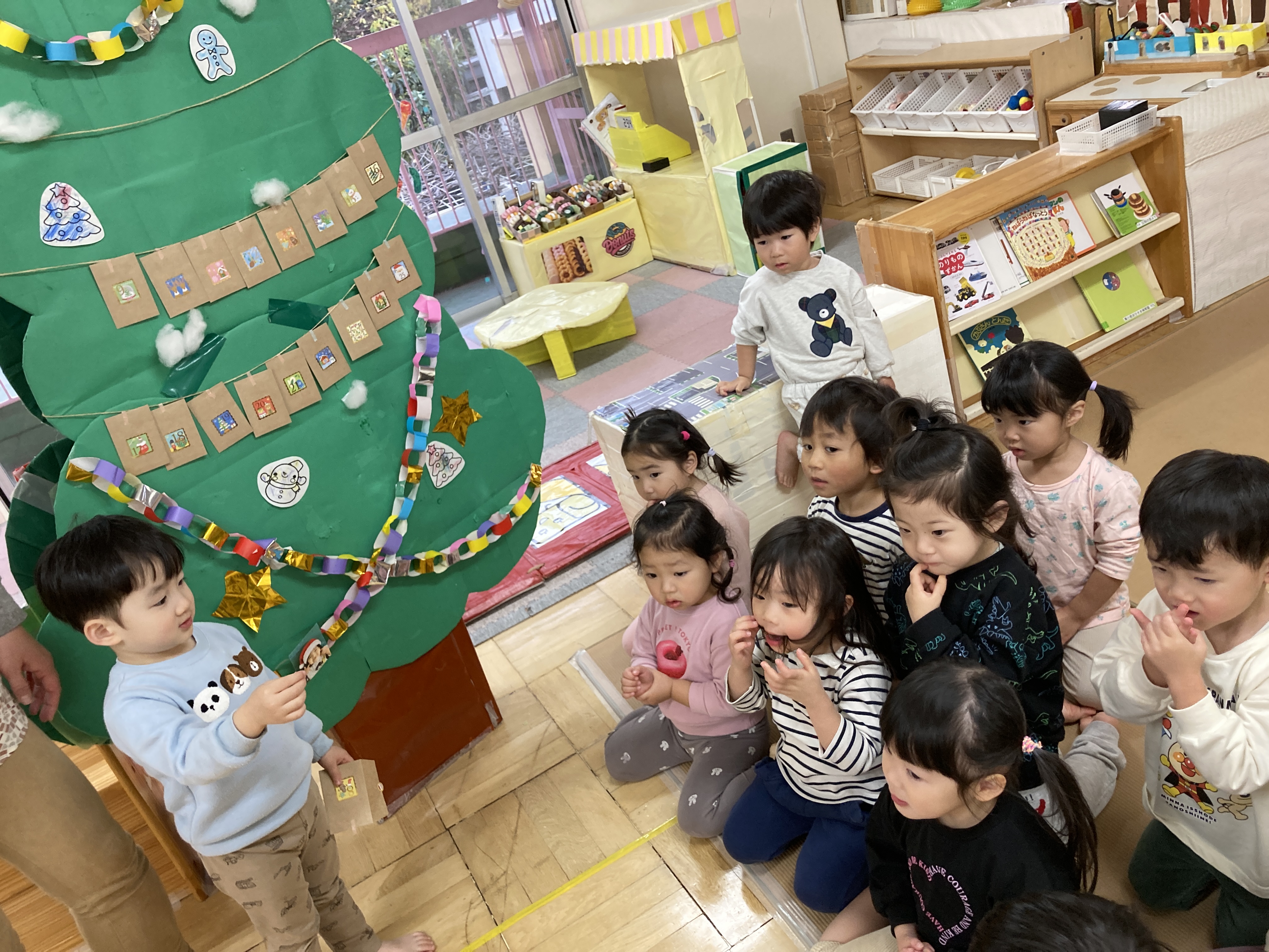 クリスマス会、サンタさんがプレゼント持って来てくれる、