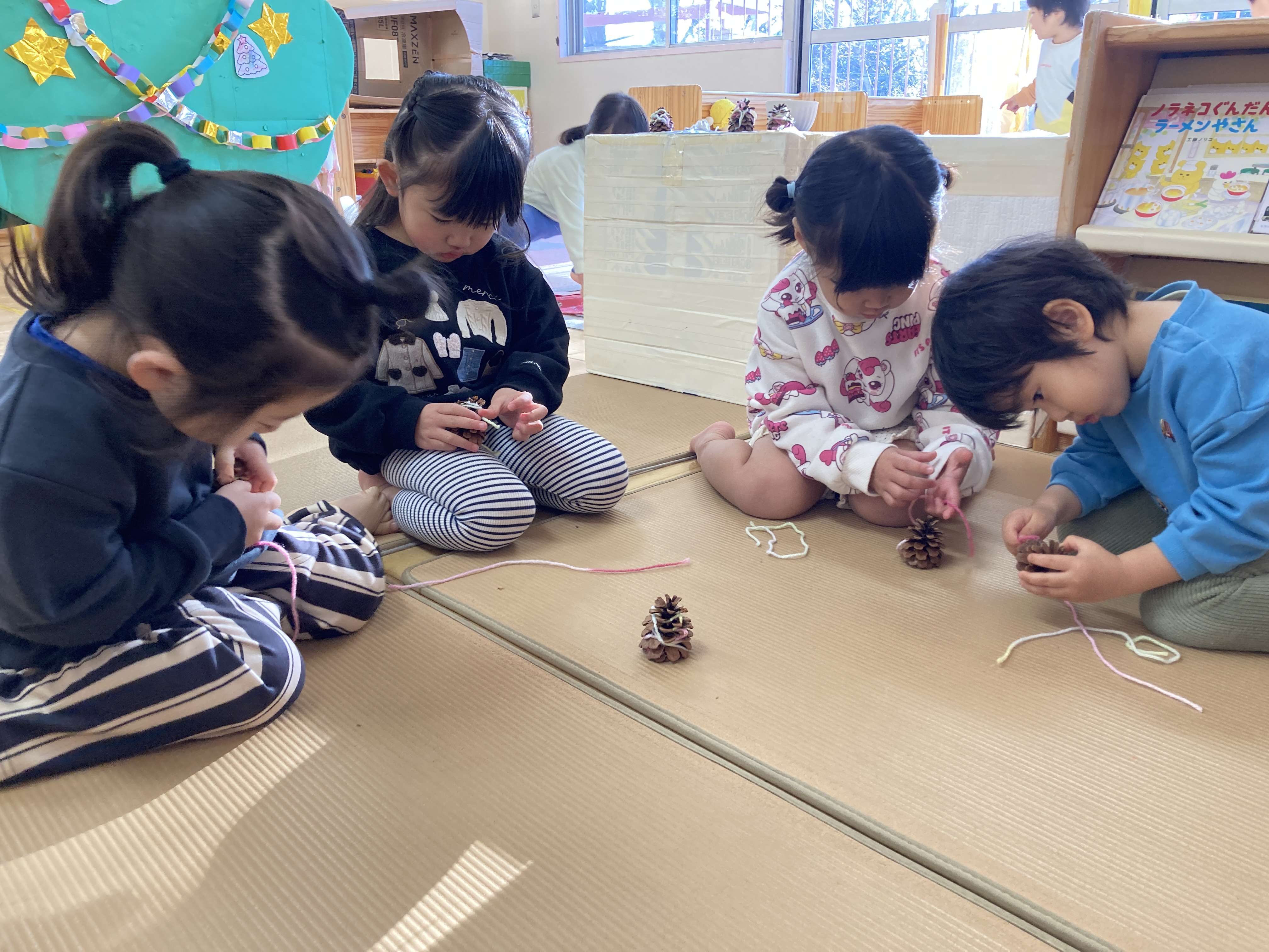 先月松ぼっくり拾いをして遊んだ松ぼっくりには毛糸を巻き付けて見ました。
