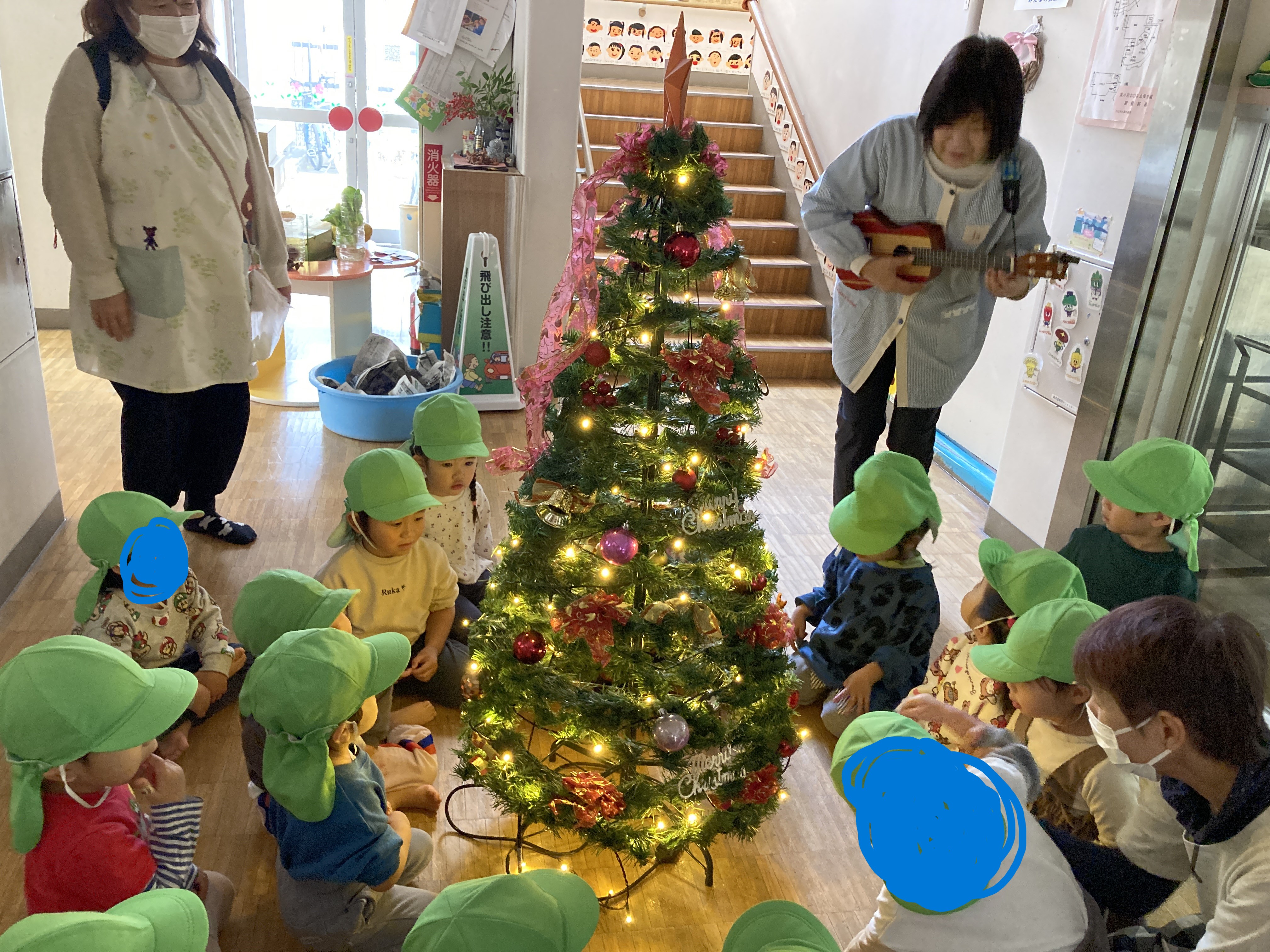 園のツリーを囲み園長先生が弾くウクレレに合わせて