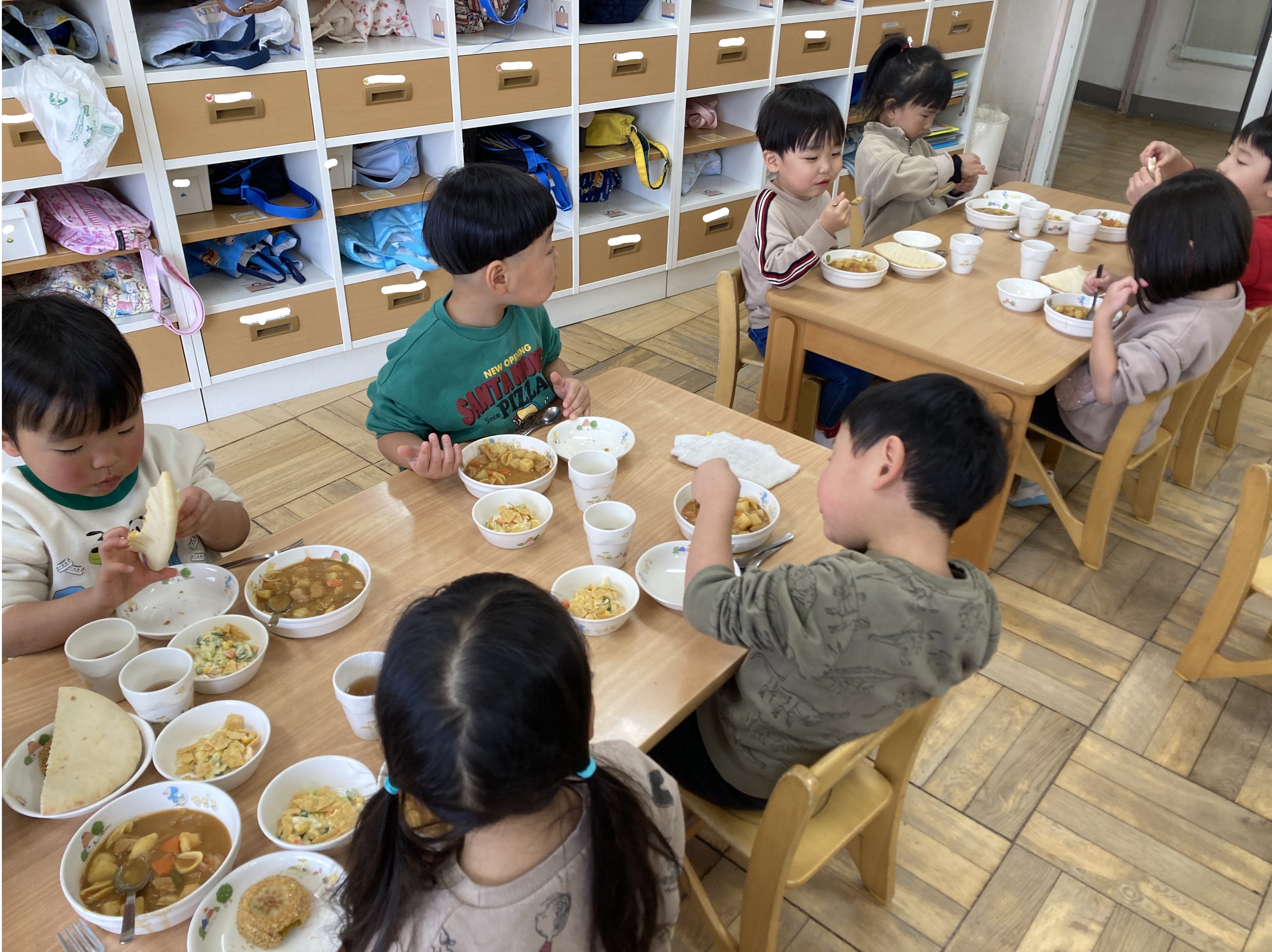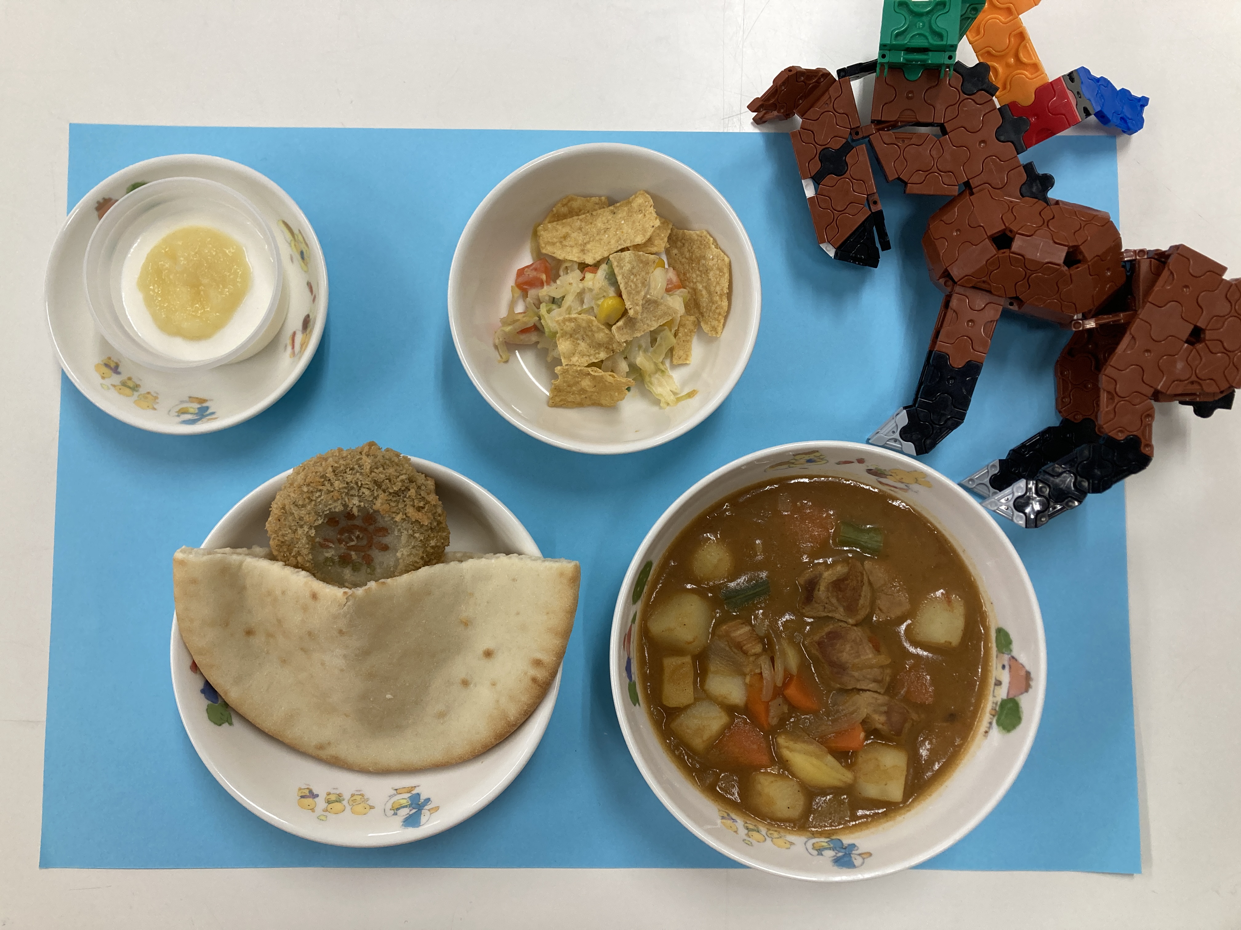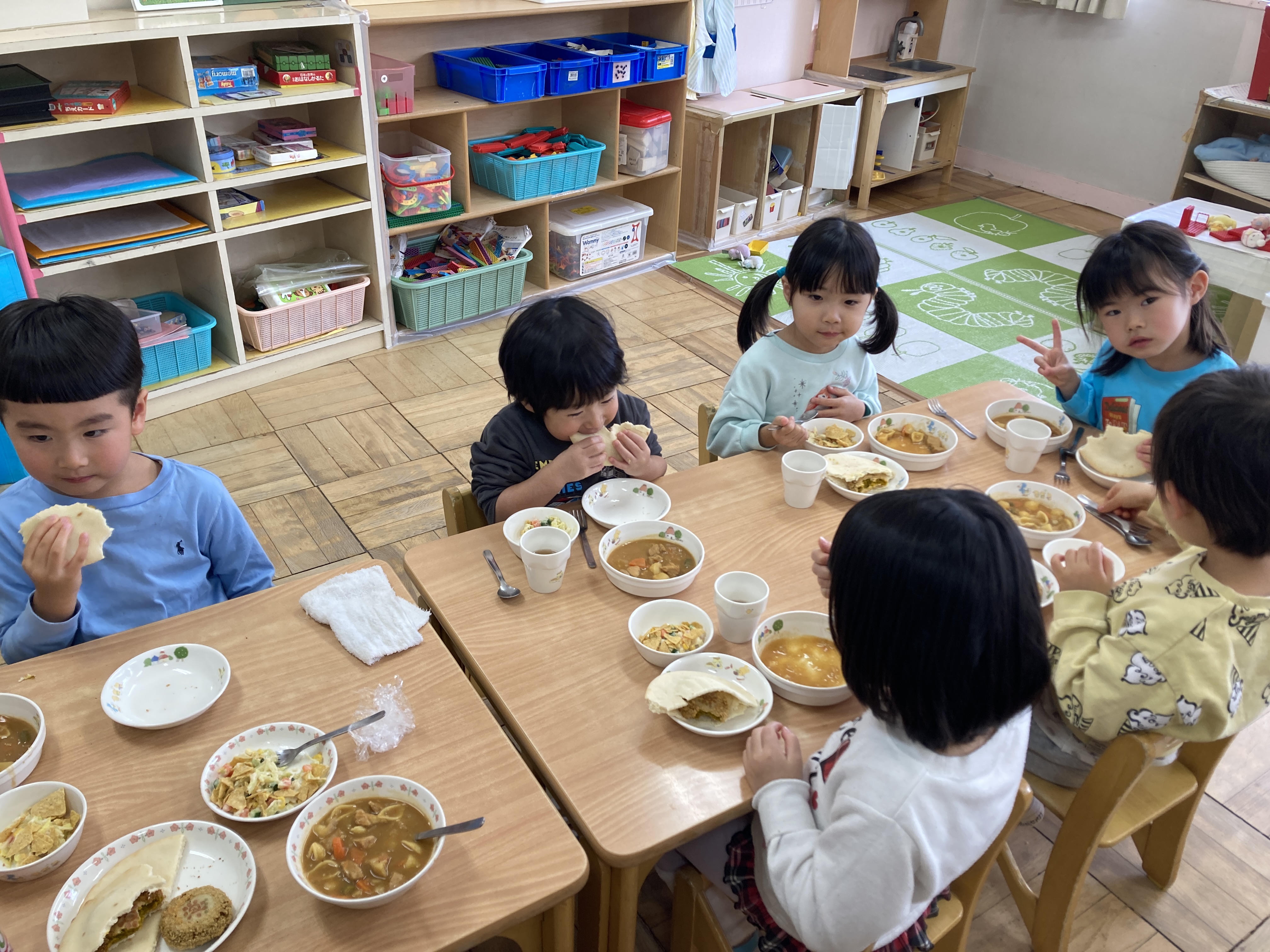 今までピタサンドが出ても食べ慣れず中身がこぼれてしまったり、上手く挟めなかったですが、こぼさずに上手に挟んで食べられるようになりました。自分で食材を挟んで食べるという体験も面白く、コロッケだけではなくサラダも一緒に挟むなど子ども達オリジナルの食べ方を楽しんでいました。