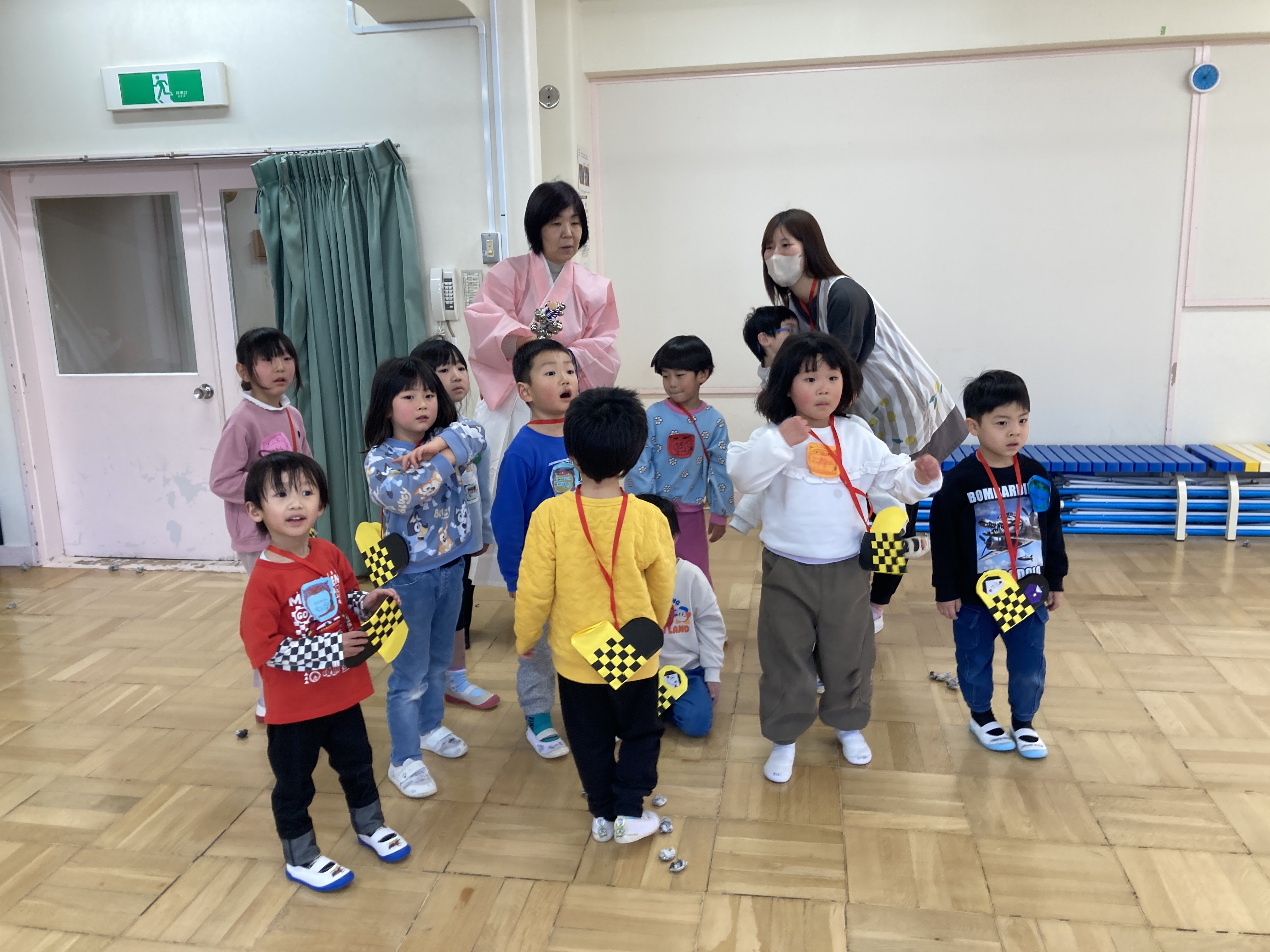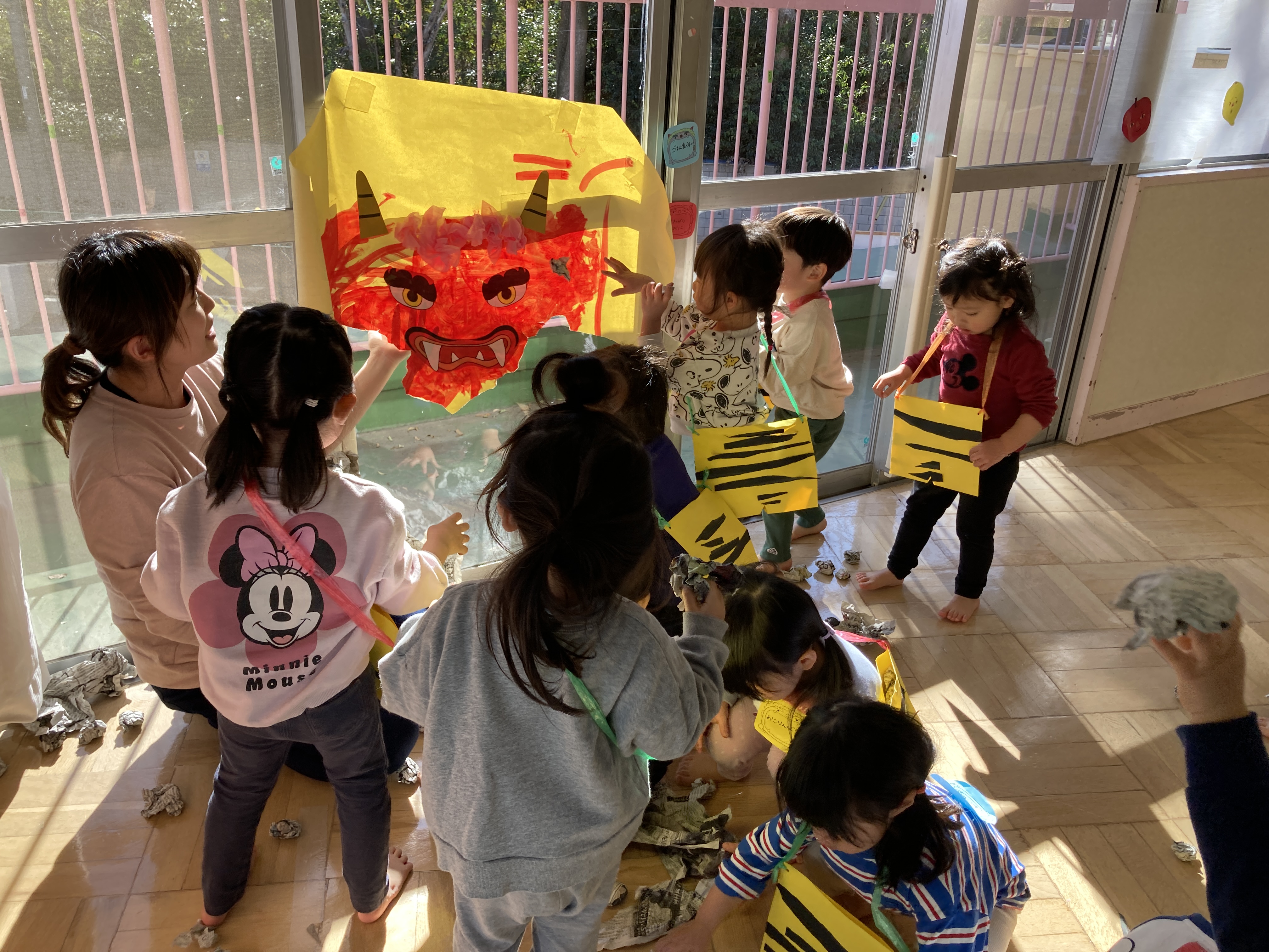 自分で作ったバックを持ち、一生懸命鬼に豆をまくことができました。自分の心の中にある鬼も一緒に外へ逃げて、みんなのところに福がきますように!