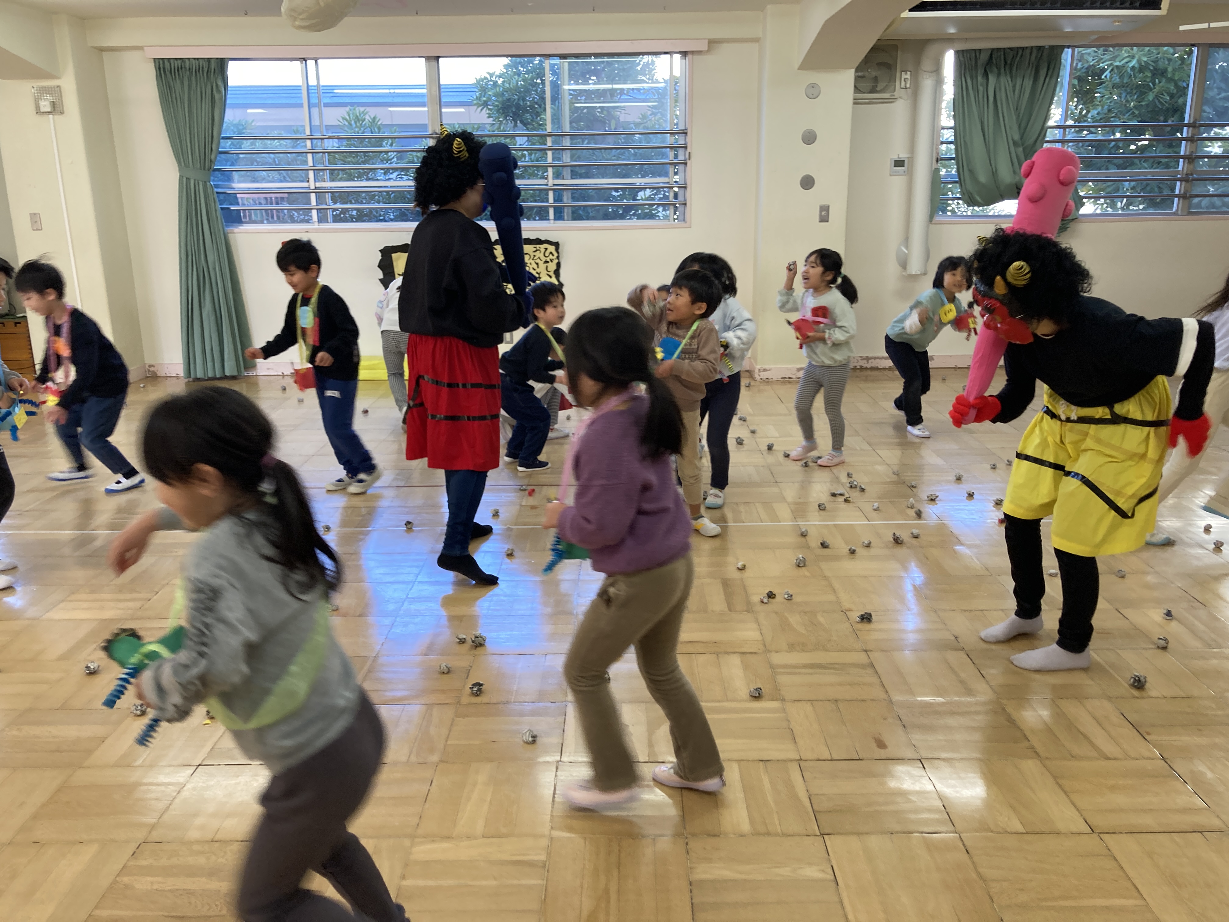 また、ホールでは青鬼と赤鬼がお友だちのことを待っていました。自分の心の中にある寝ぼすけ鬼や怒りんぼ鬼に向けて「鬼は外、福は内!」と豆をまきました!