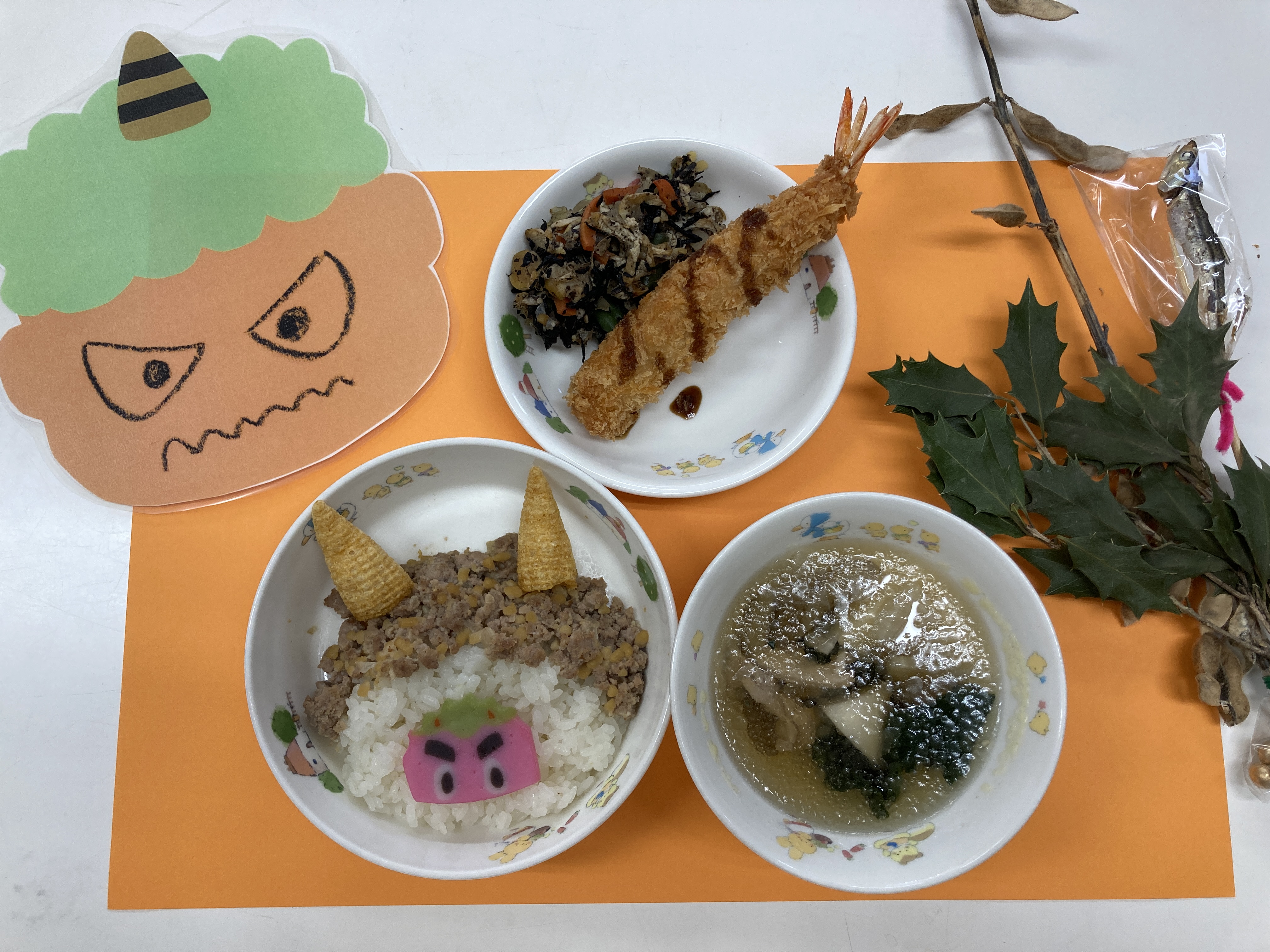 今日のお給食は節分にちなんで鬼の角がはえたご飯でした。ドキドキの豆まきが終わり笑顔でおいしいご飯をいただきました!