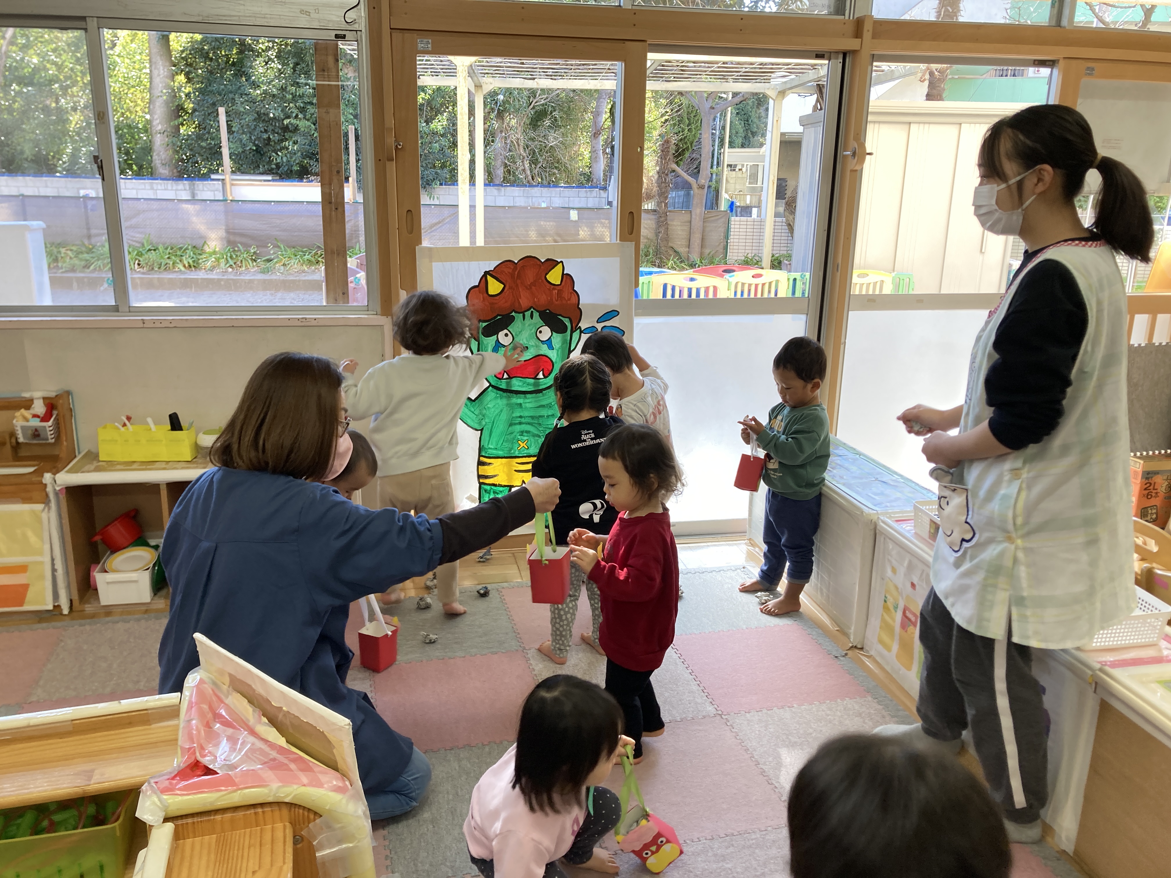 今日は節分の日!保育園に来た鬼を退治するために豆まきをしました。