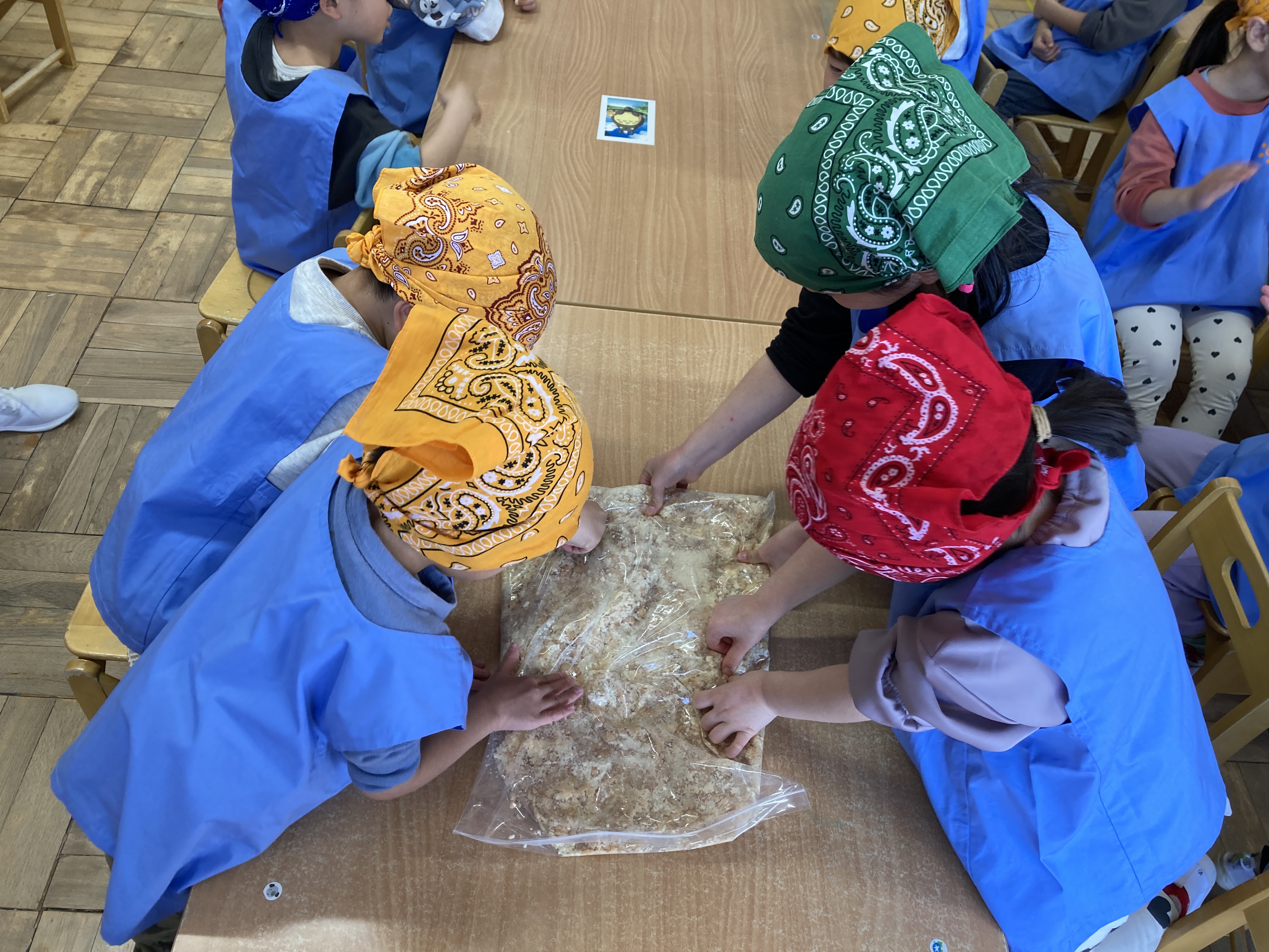 まずは米麹、煮大豆、塩を混ぜ合わせる工程からスタート。「納豆ご飯みたい」「ふわふわしてる!」と興味津々の様子でした。その後、混ぜ合わせた材料を手で潰していくと、「やわらかい!」「気持ちいい!」と感触を楽しみながら、友だちと一緒に丁寧に潰していました。