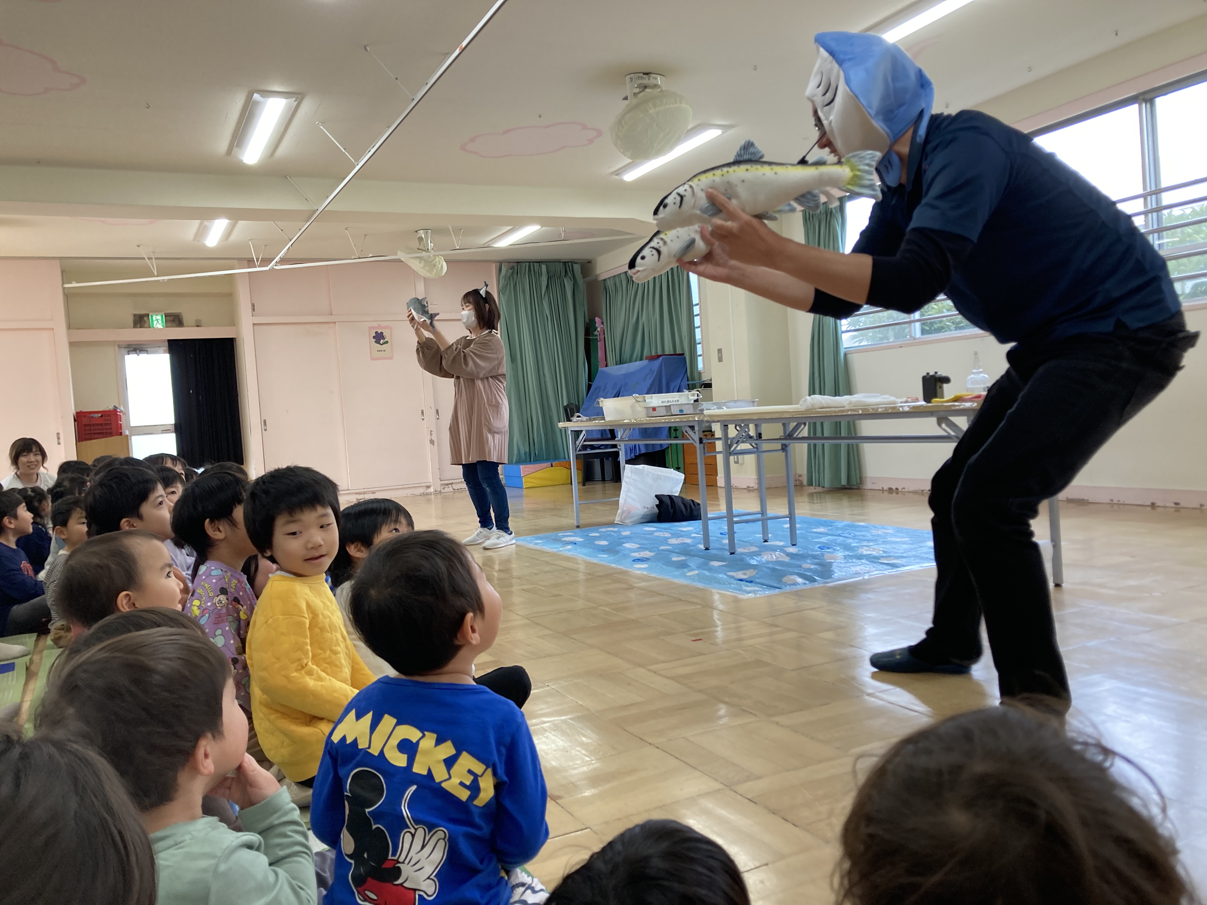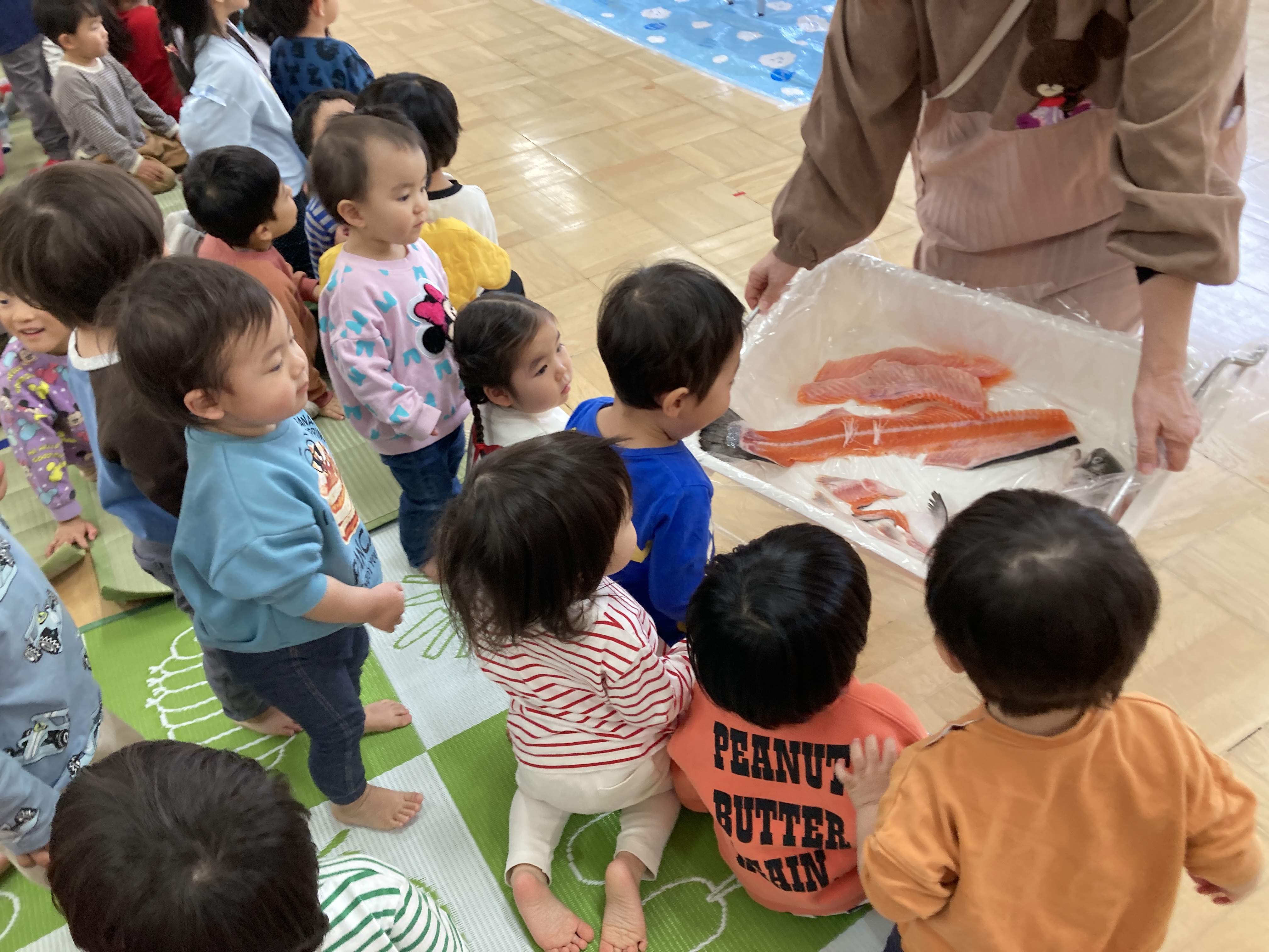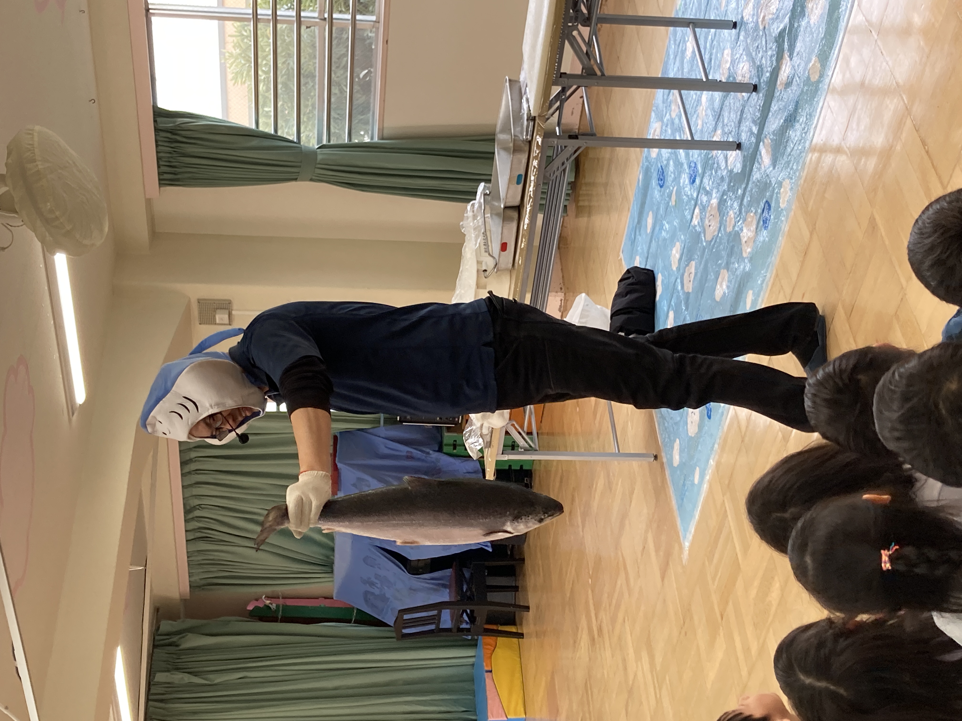 大きな鮭を見て、「すごい」「大きいね」とびっくりしていました。