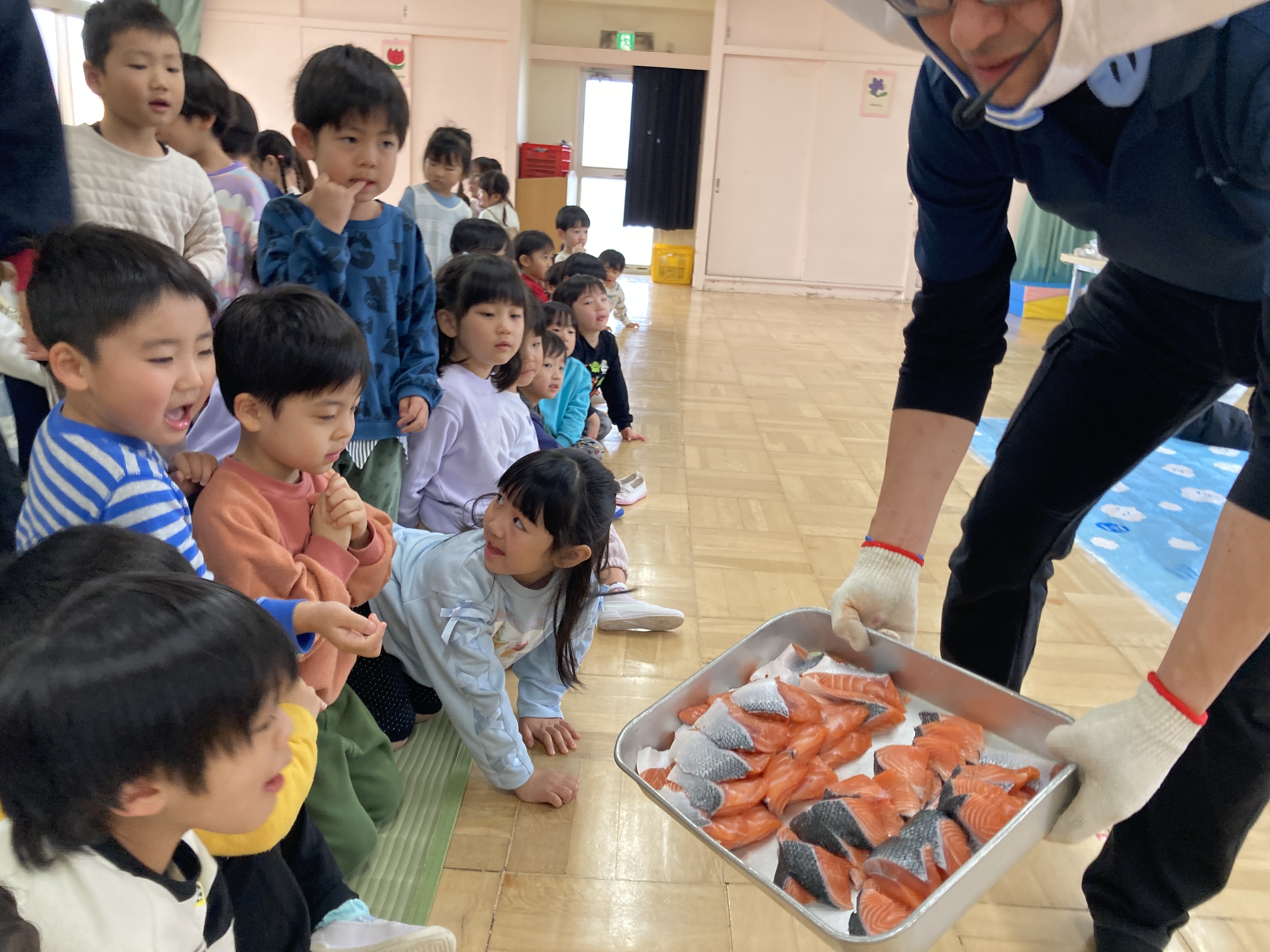 なかなか、本物の鮭を見る経験がない子ども達は、