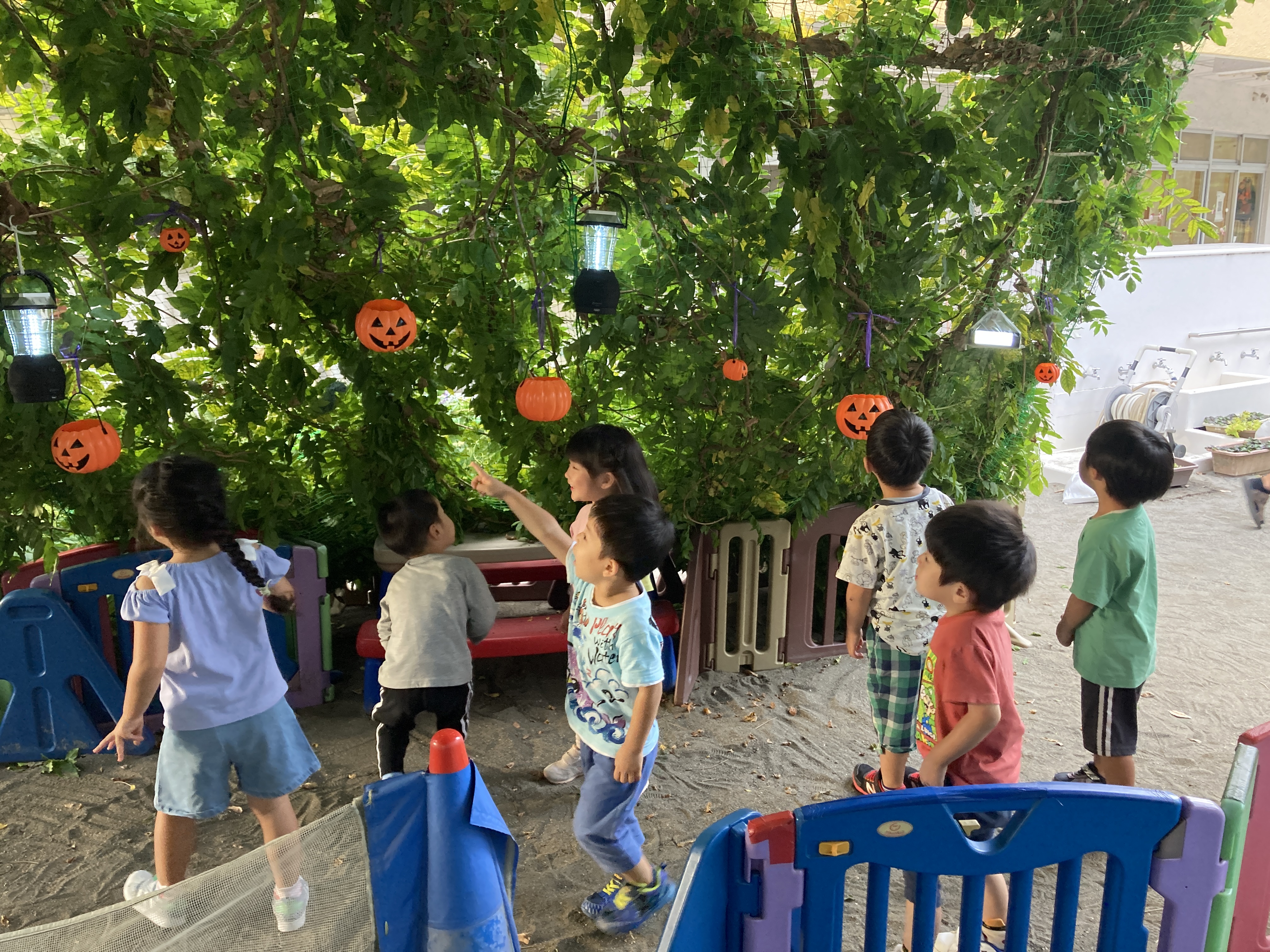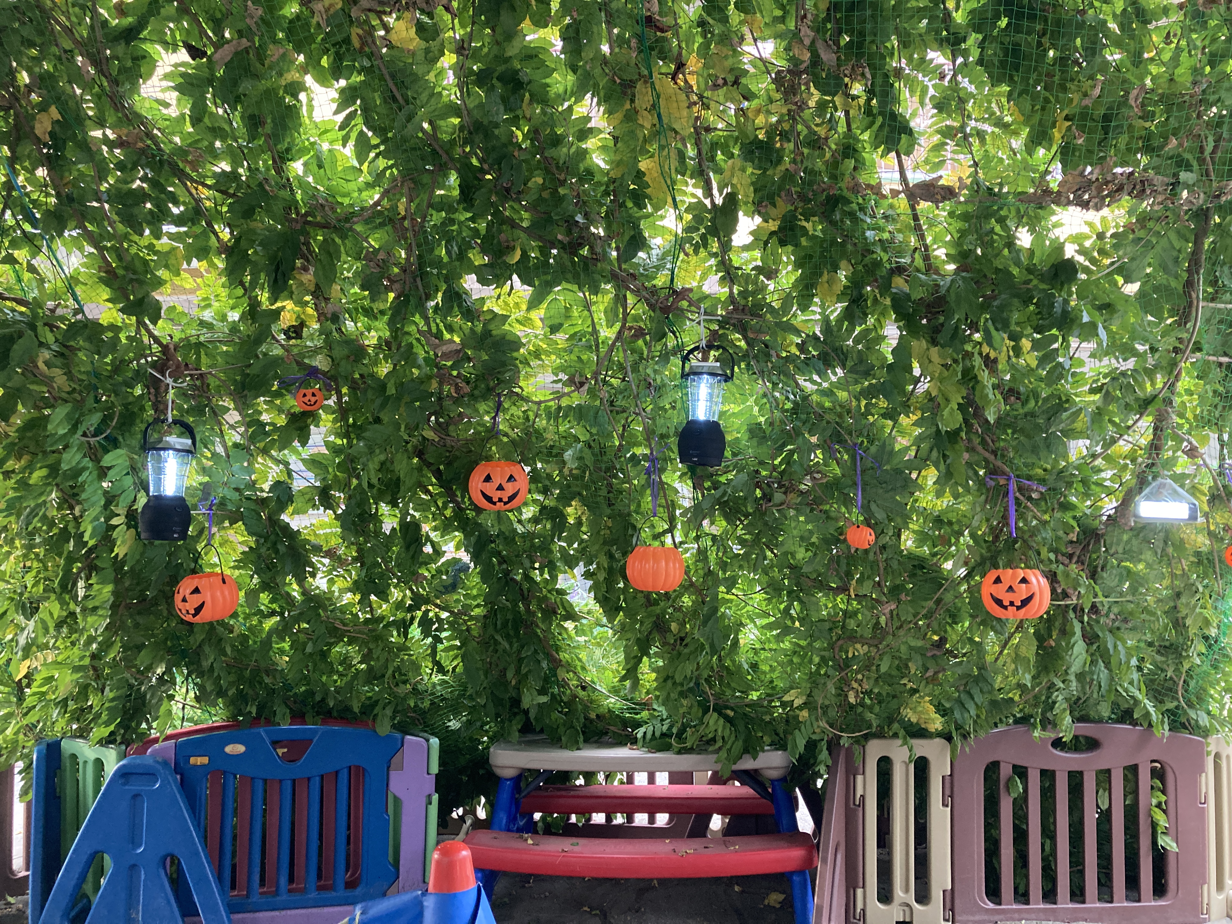 砂場の藤棚は夏は子ども達を暑さから守ります。ハロウィンのころになるとグリーントンネルとなり子ども達のわくわくに繋げています。