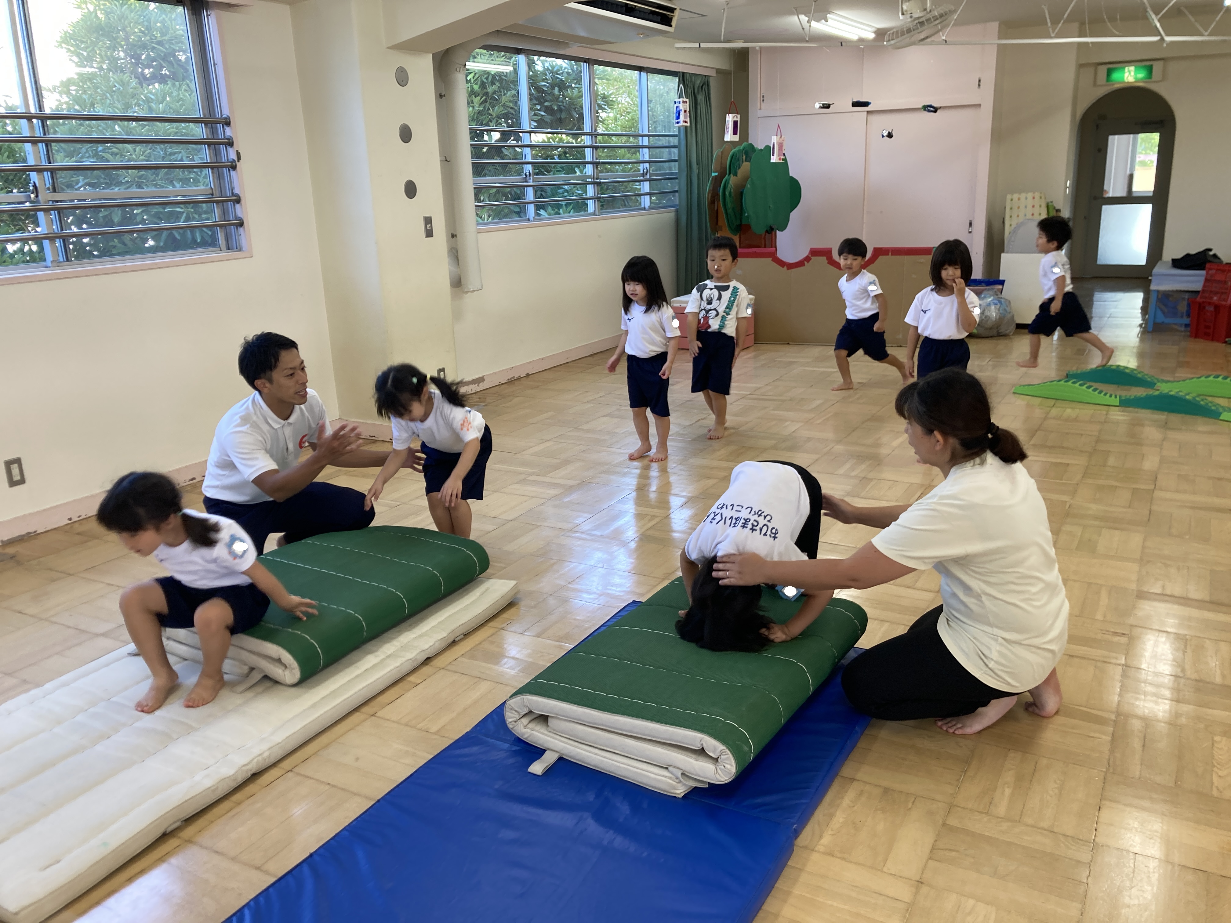 跳び箱、前転、鉄棒、縄跳びなど、運動の基礎となる体の動かし方を学んでいます。