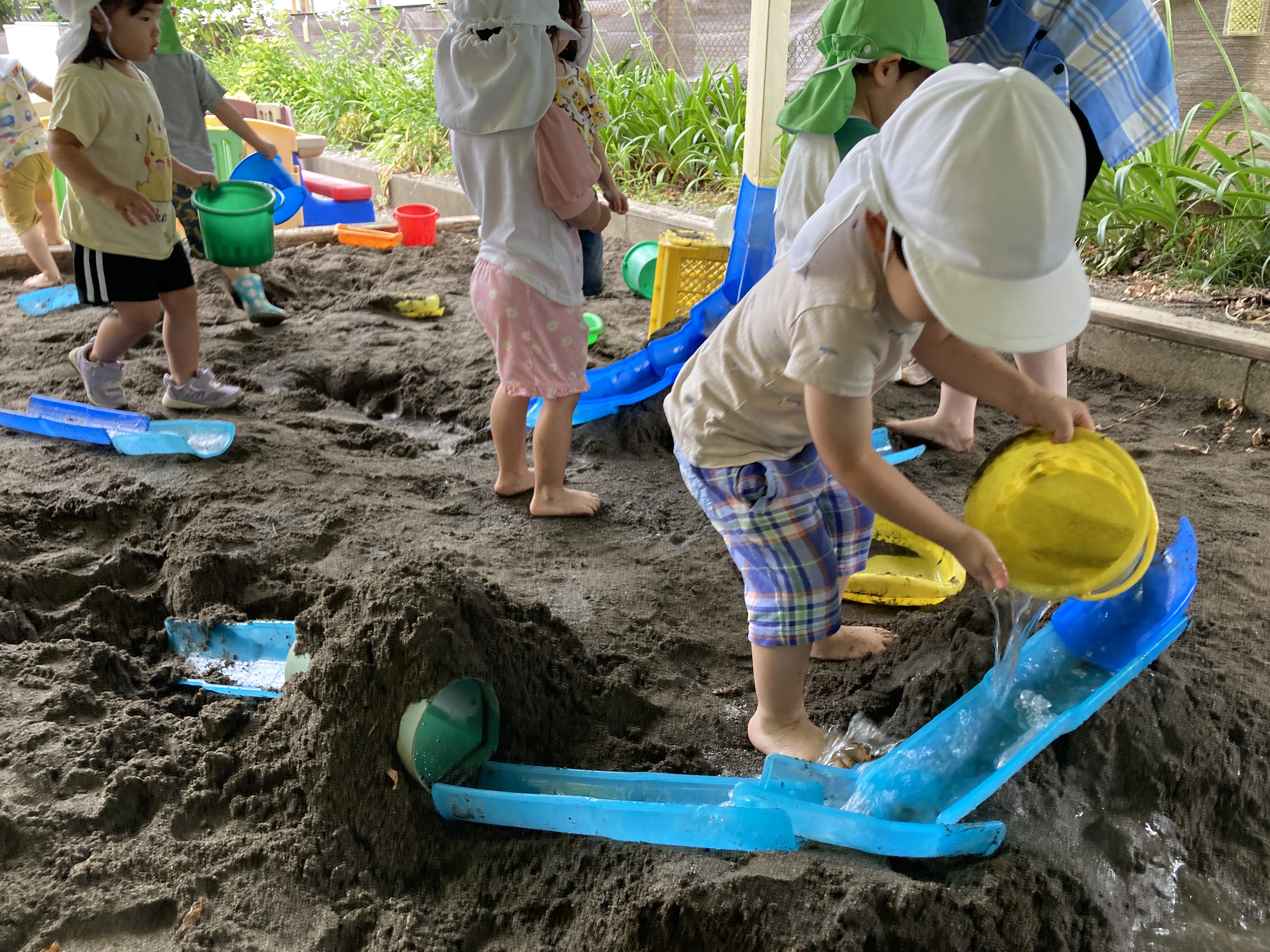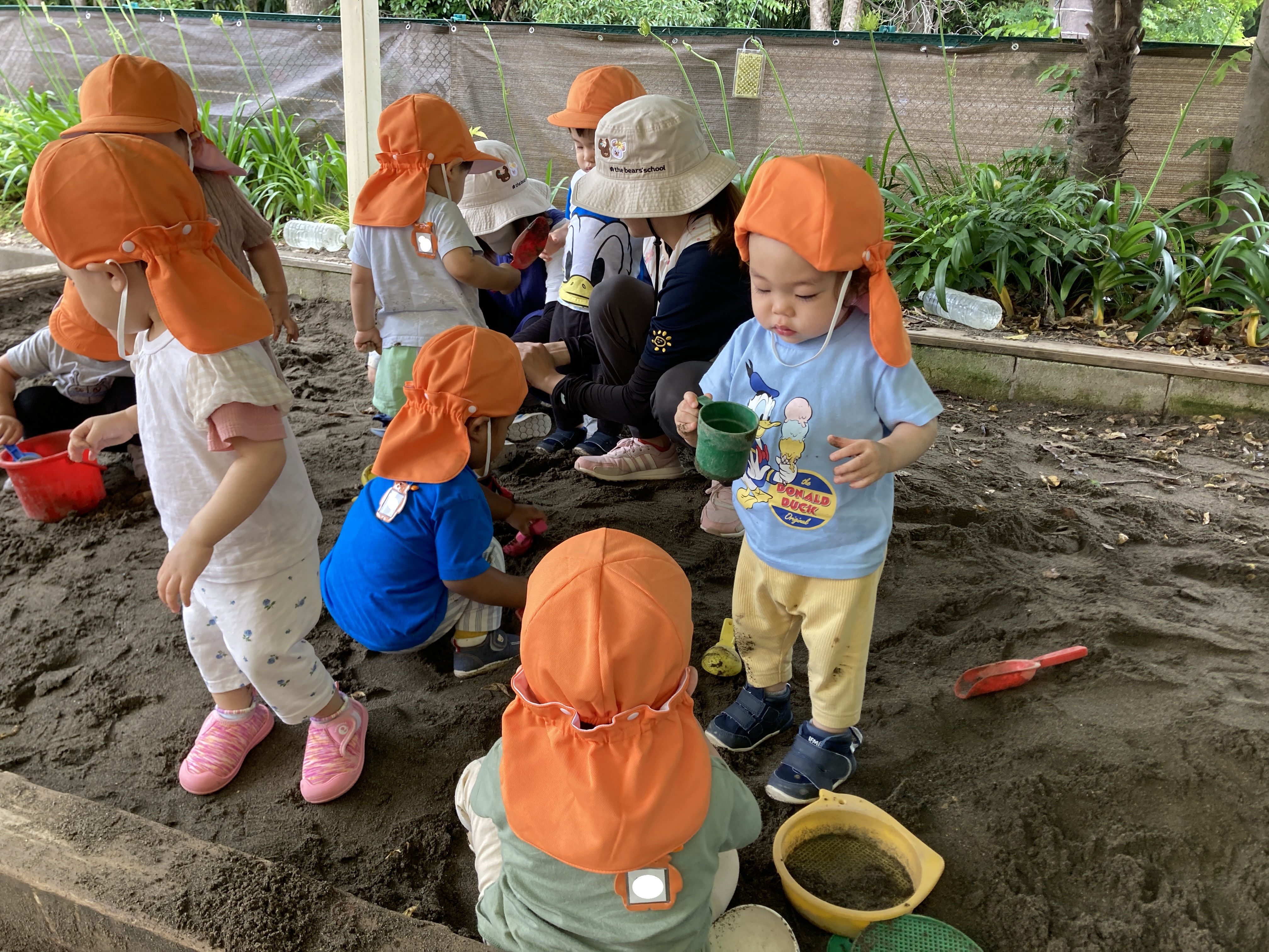 砂場には学びがいっぱい。砂の感触、掘る、入れる、こぼさないようにそっと歩く。