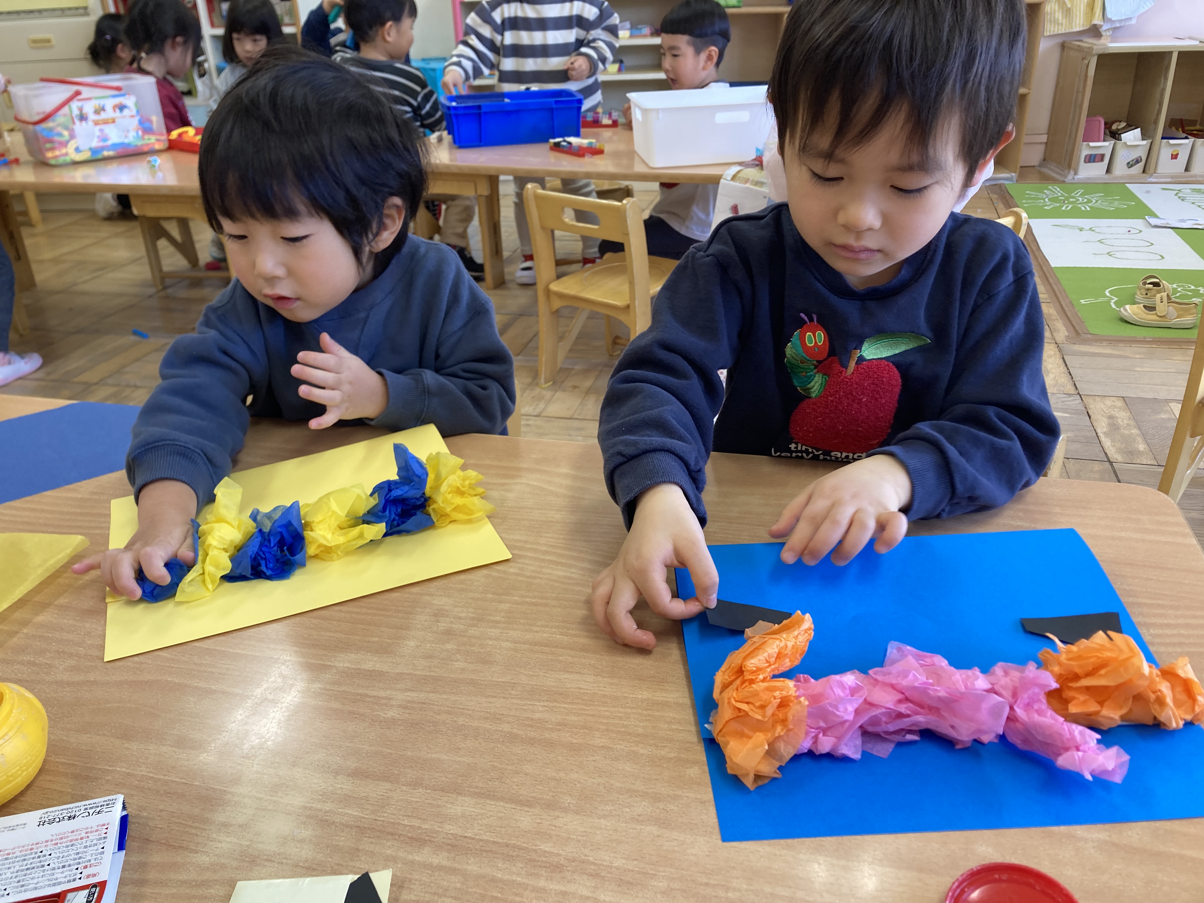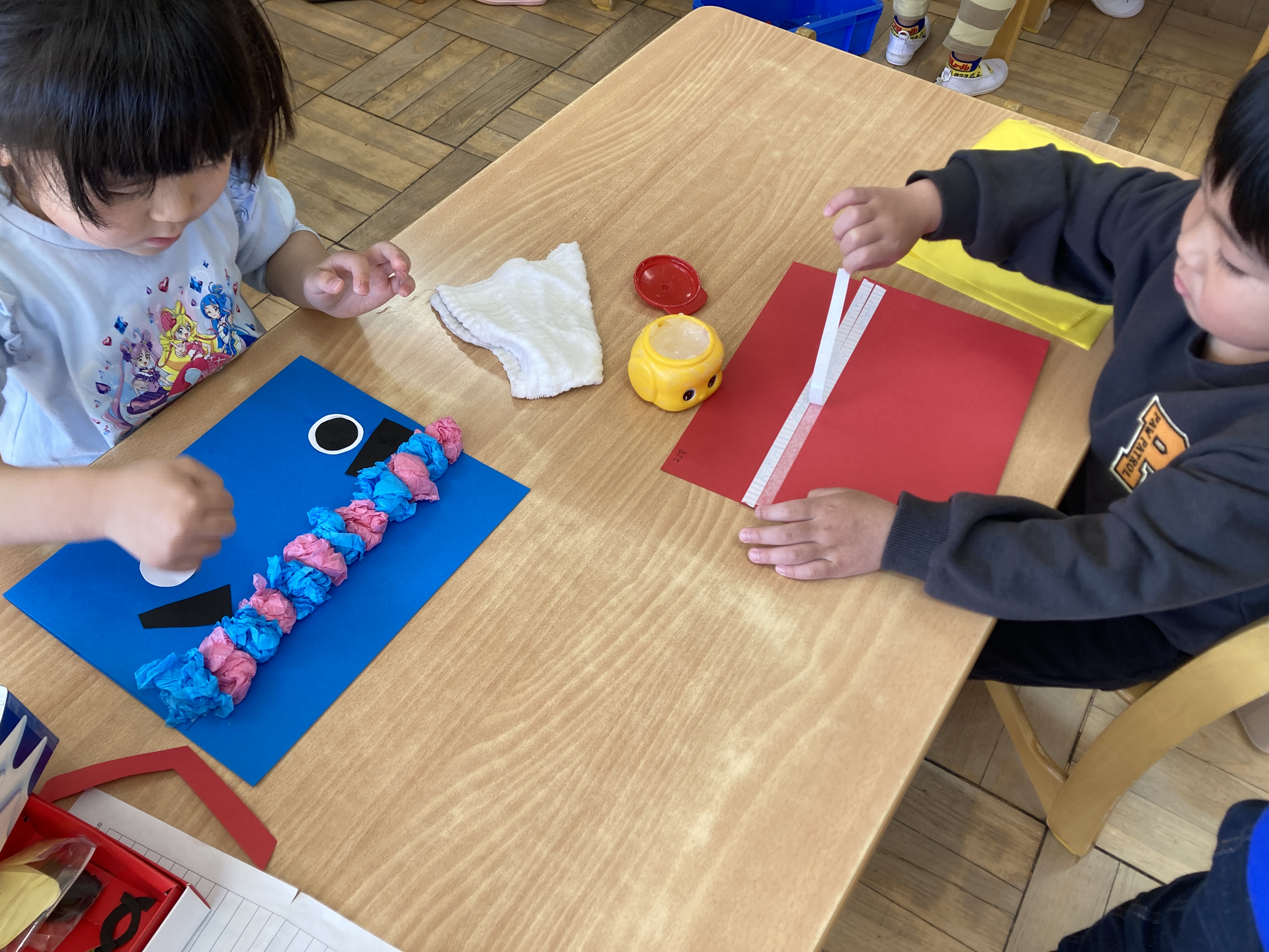 製作は数名ずつ行ったのですが、順番を待っているお友だちは¨はやく呼ばれないかな~¨とワクワクしながら待っていたり、「はやく作りたい」「まだ作ってないよ!」と待ちきれずに職員に声を掛けに来るほど楽しみにしていました。