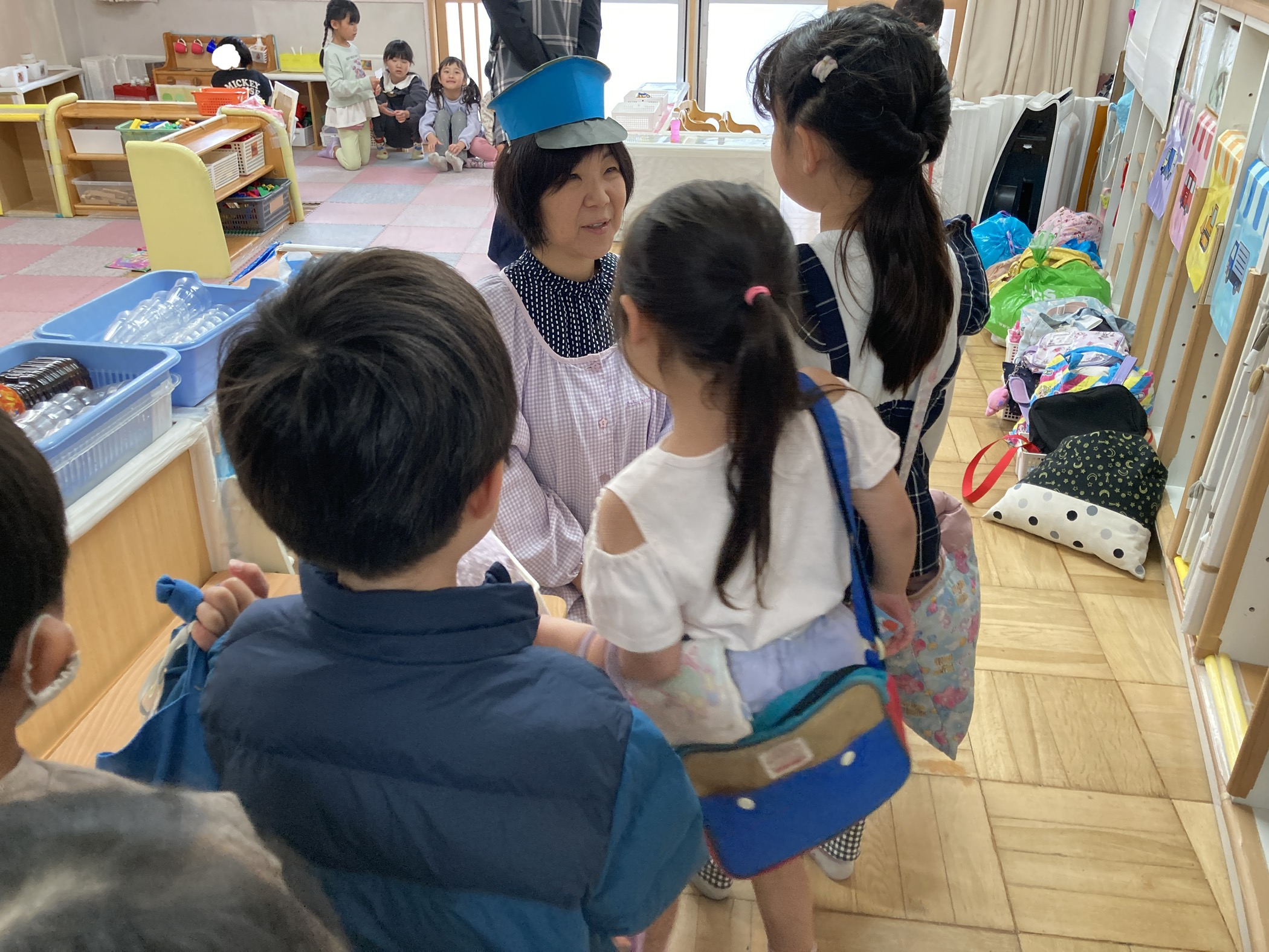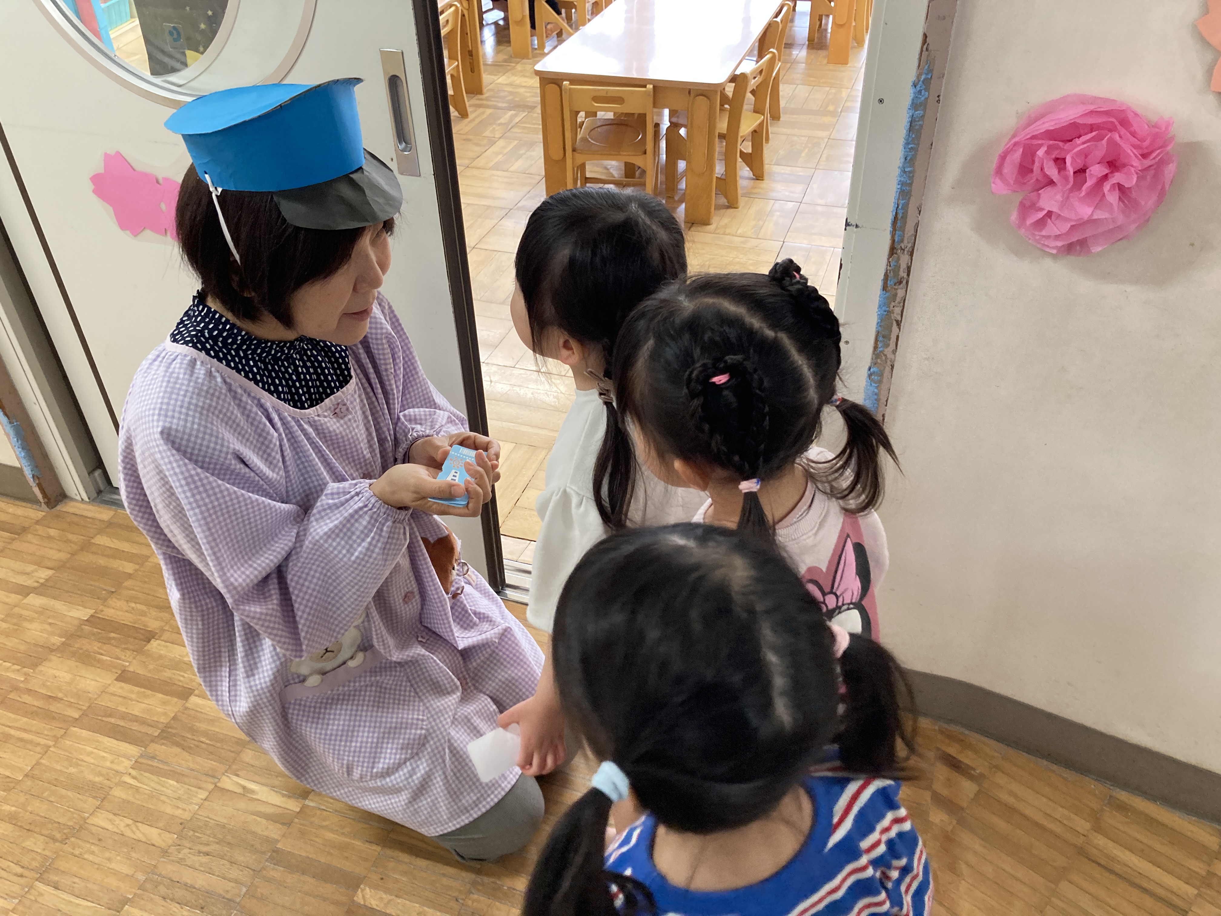 園長先生の駅長さんに誘導されながら、入口の前で名前を言い、カードを手渡して部屋に