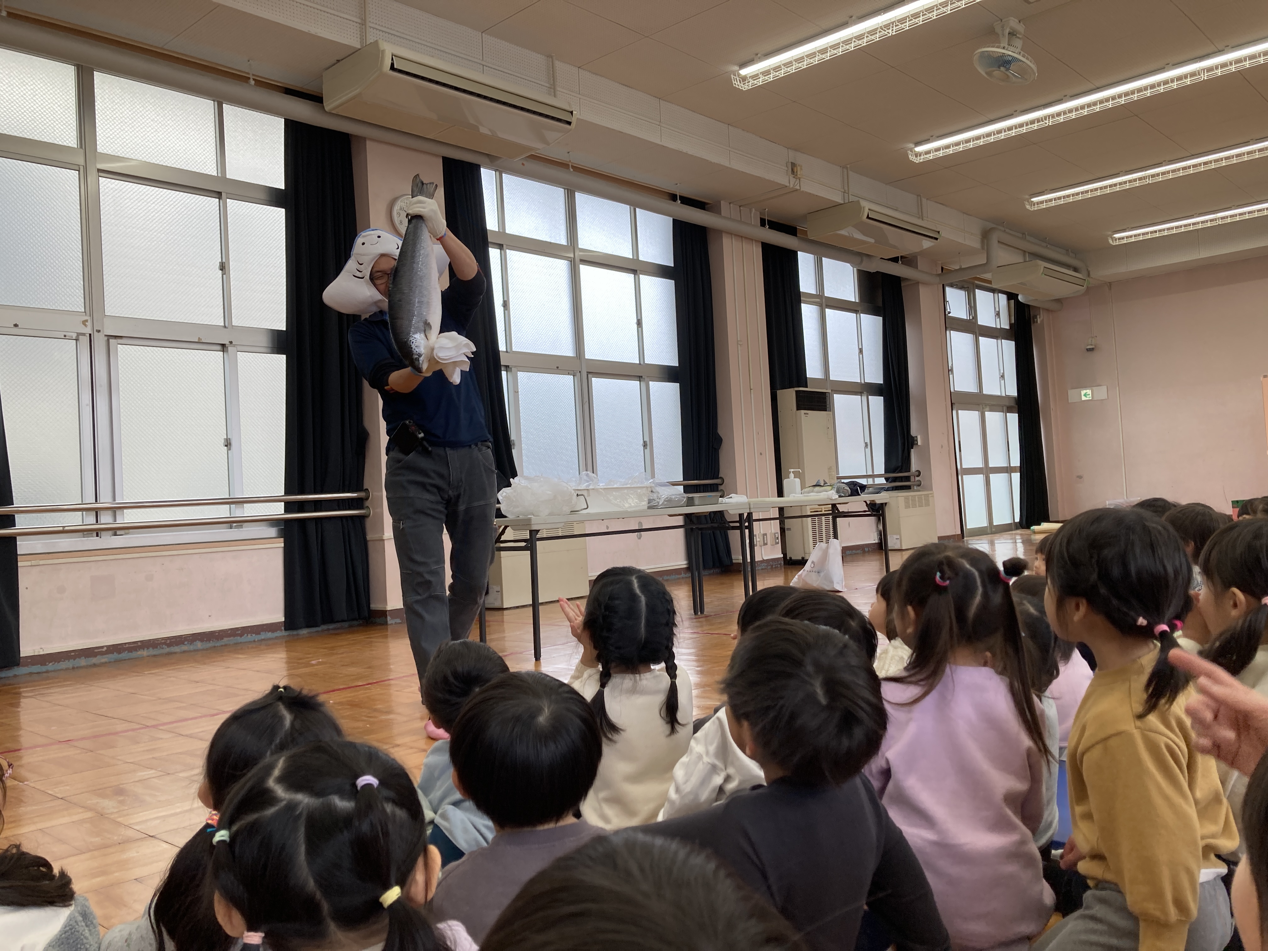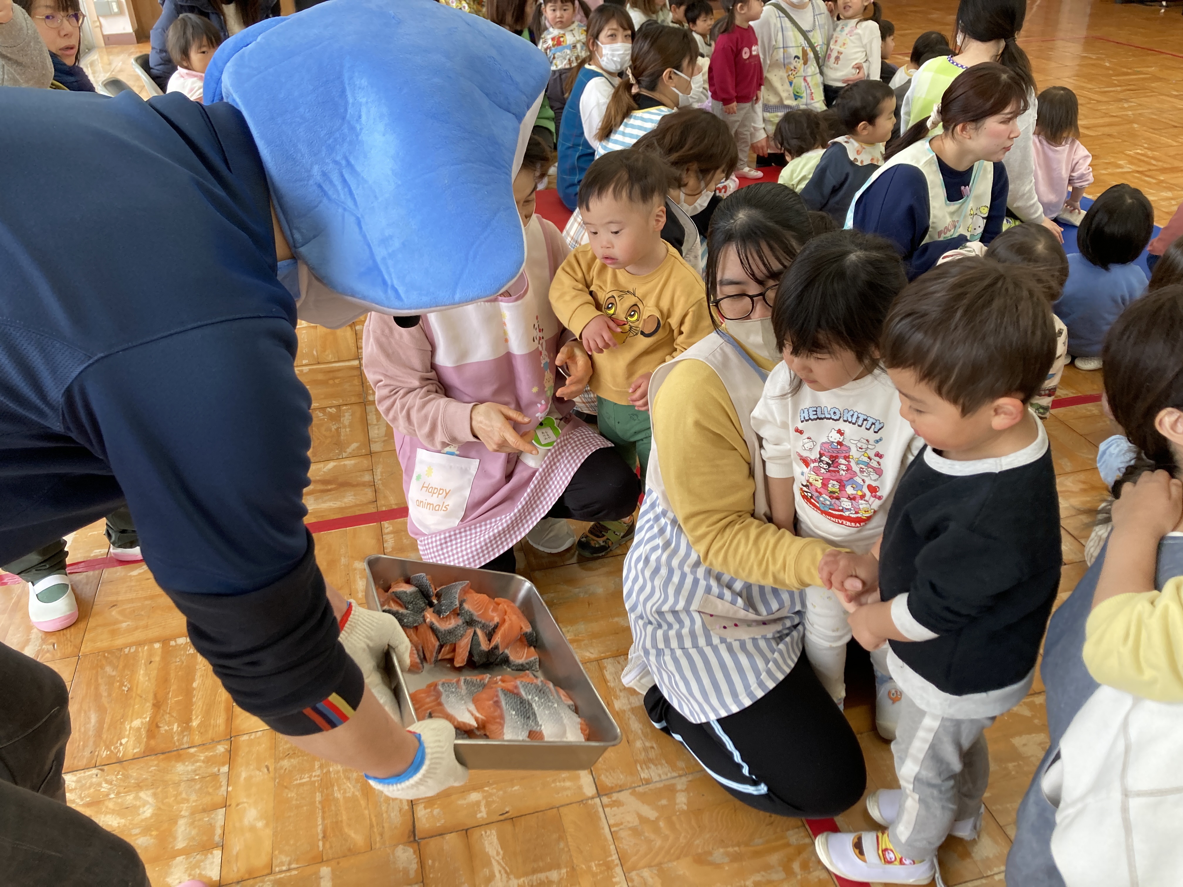 鮭はどうして川にも海にも行くの?というお話を教えてもらってから、実際に解体している様子を見せてもらいました。「かぶと」「かま」等切った場所の名前を教えてもらったり、子ども達の掛け声で三枚におろされたり、少しずつ子ども達になじみのある切り身になっていく様子を見せてもらい、興味津々で見学していましたよ。