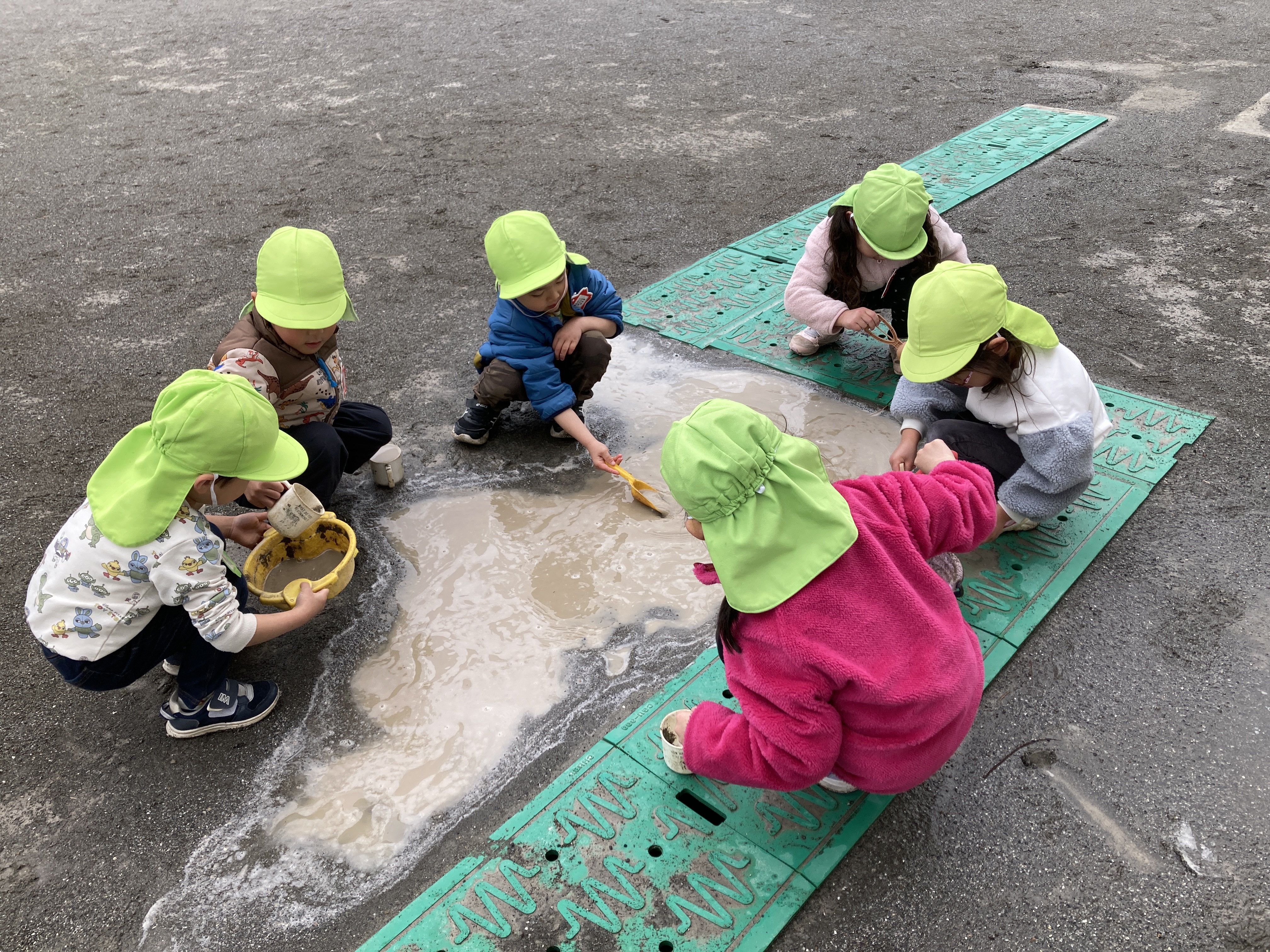 雨上がりの園庭で遊んだ日は、水たまりに興味津々で、みんなで覗いていましたよ。コップやお皿に水を入れたり、混ぜたりして楽しんでいました。服が汚れてしまっても気にせず、ダイナミックに遊びこむすみれ組さんです。