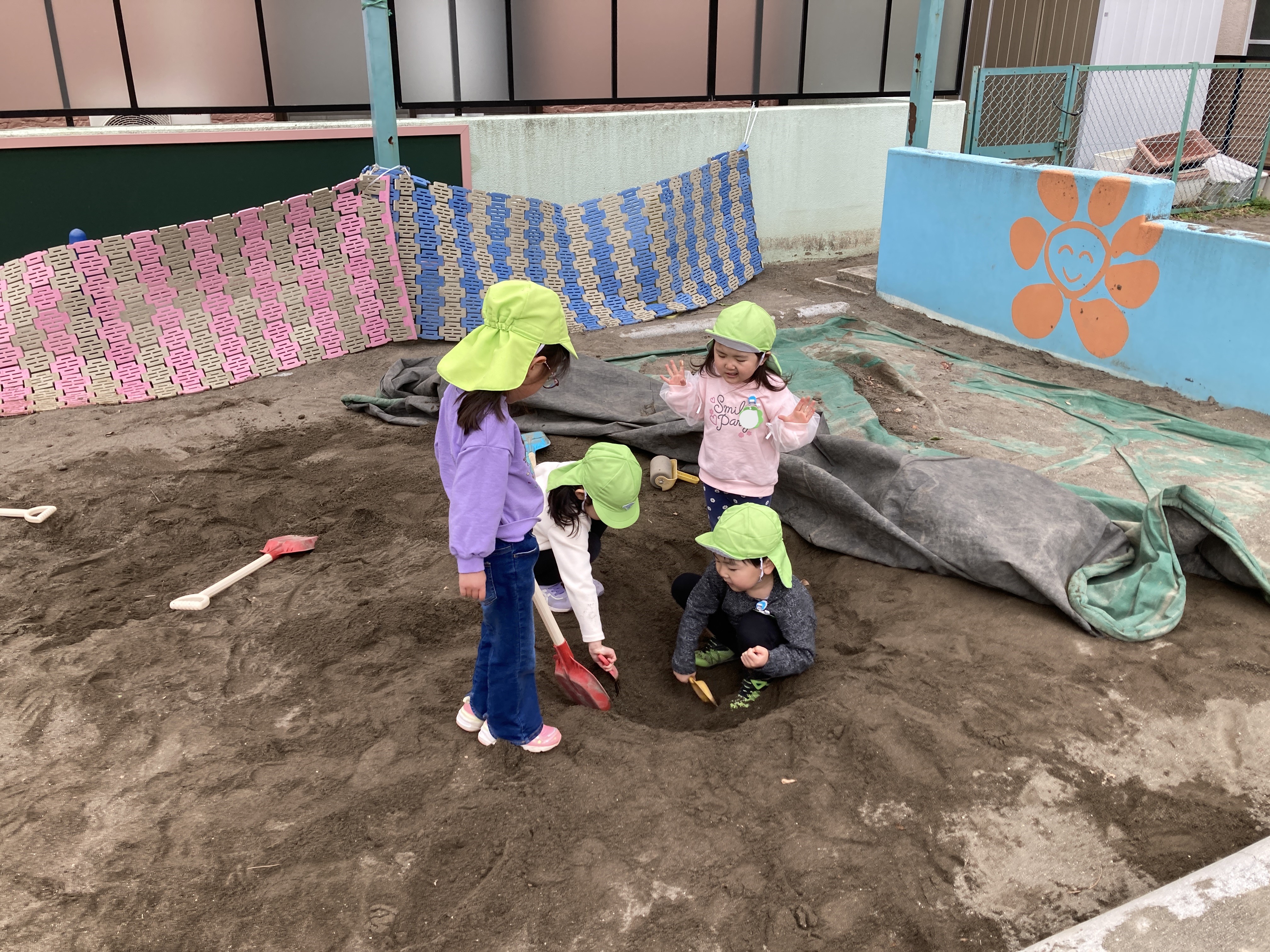 お砂場では、みんなでお風呂を作っていました。「いっぱい掘ったら温泉出るかなぁ。」「みんなでお風呂入りたいね!」と会話を楽しみながら、スコップを使って一生懸命に掘り進めていました!