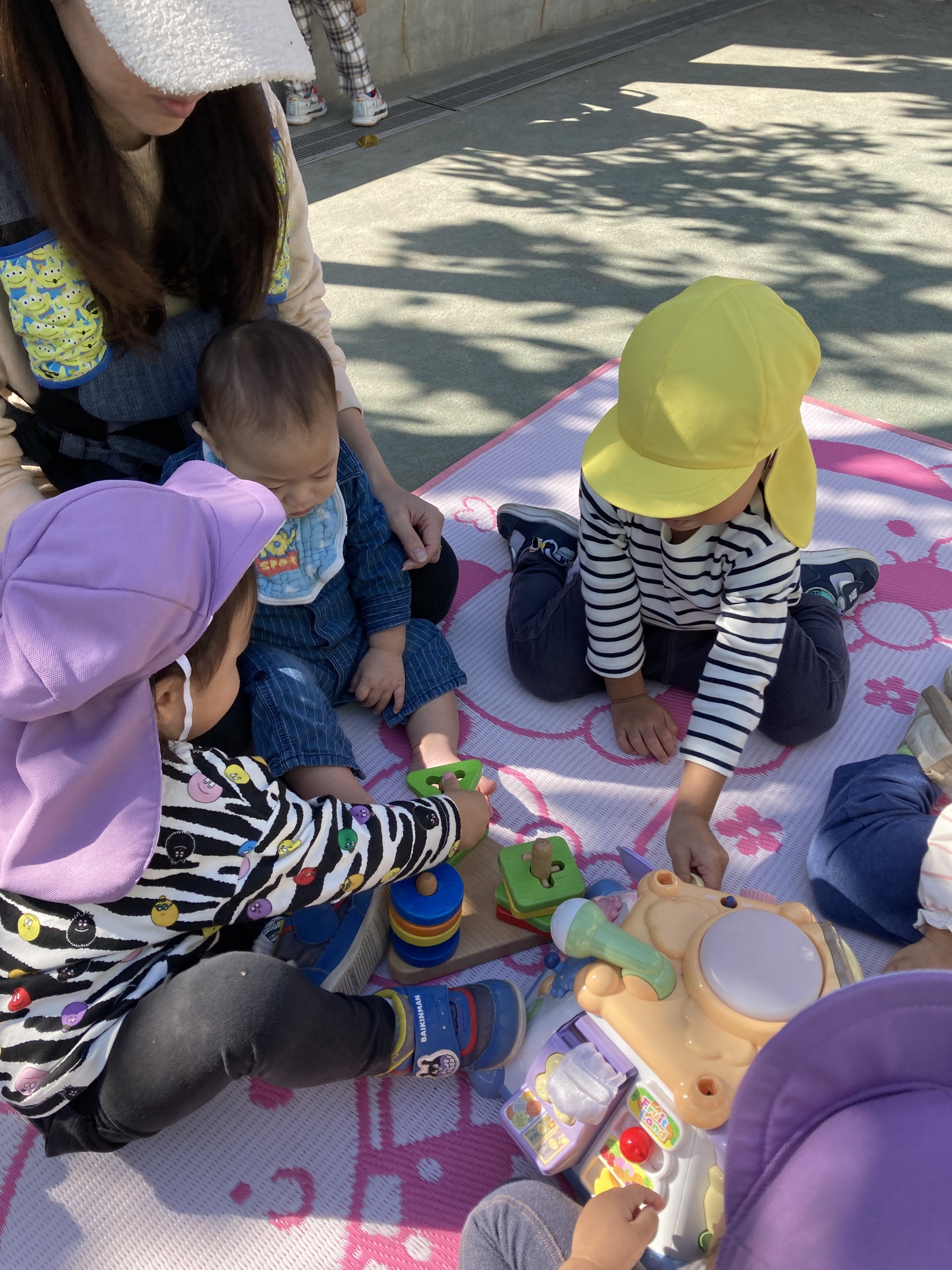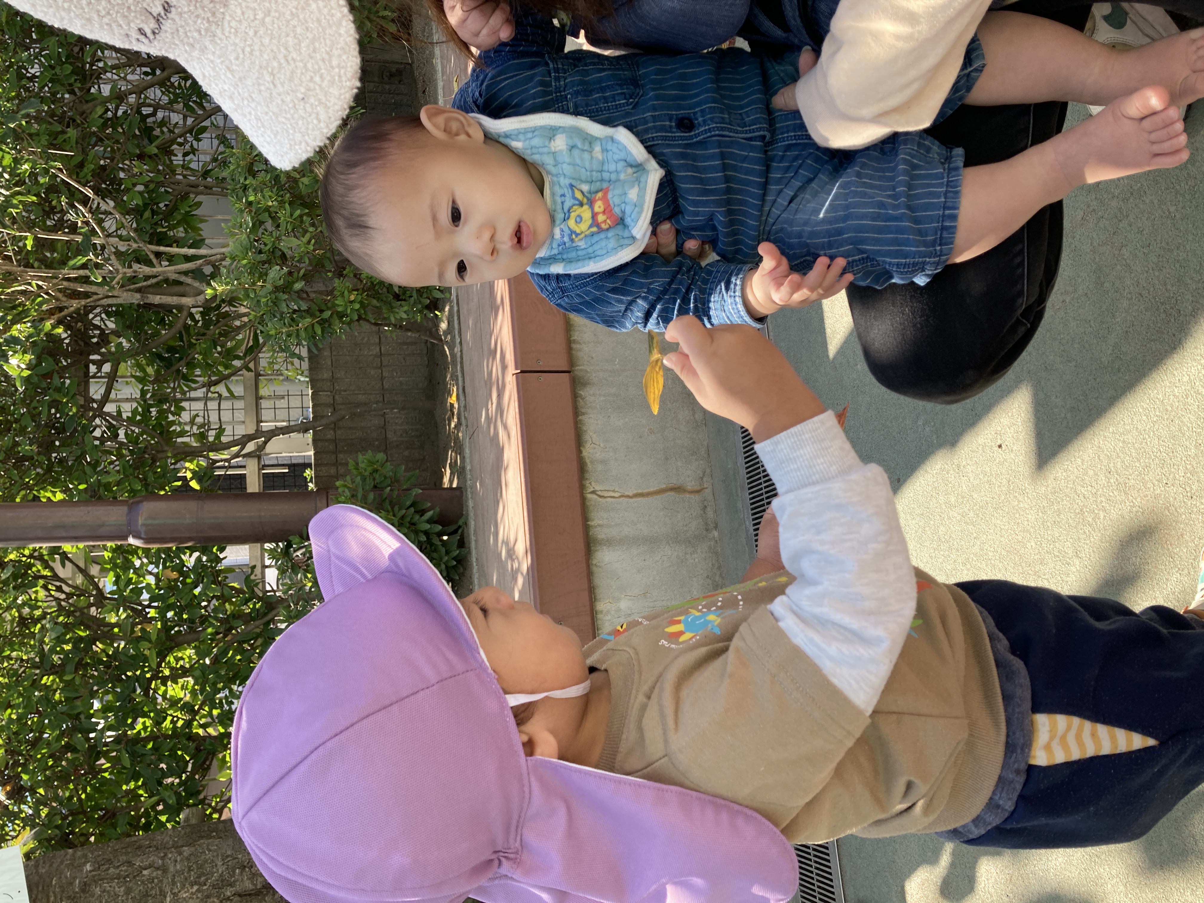 1歳クラスと2歳クラスのお友達が続々と集まってきていました!自分よりも小さいお友達に興味津々の子もいました♪