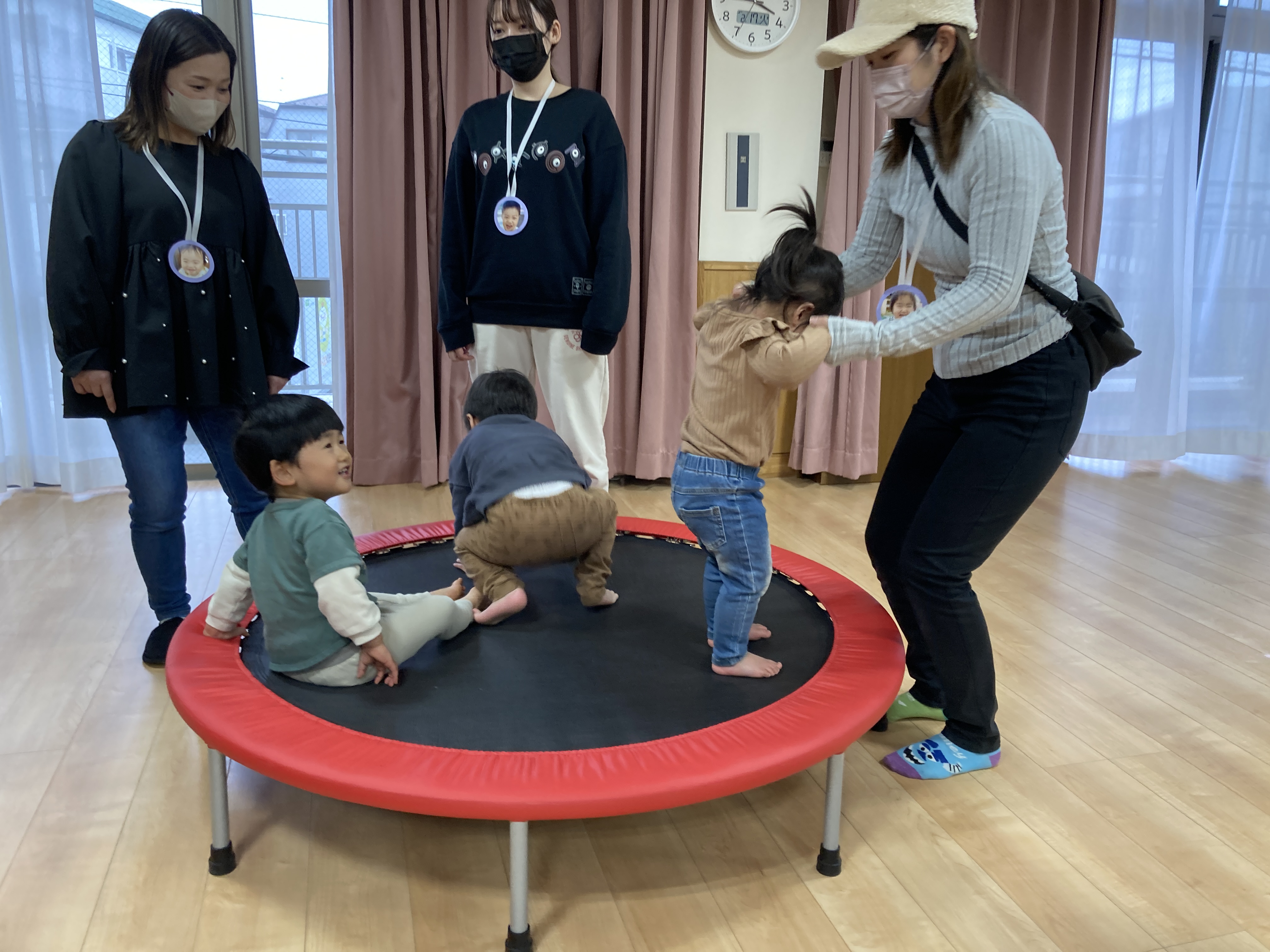 一緒に楽しみました。普段は保育士の問いに大きな声で返事をしてくれる子どもたちですが、今日は少し恥ずかしそうな様子が見られました...!保護者の方と一緒にいることに安心してにこにこで楽しんでいる様子も見られましたよ。