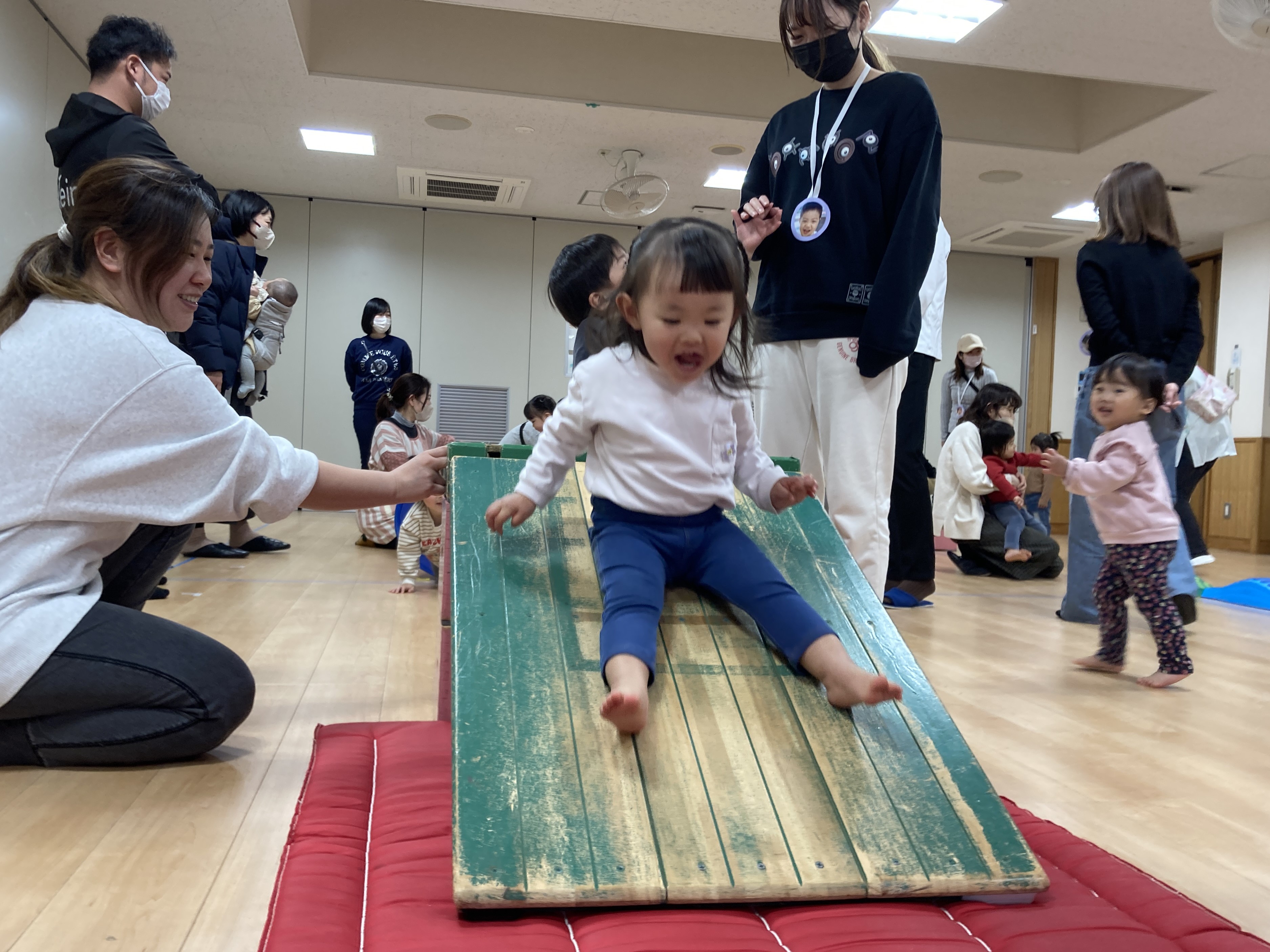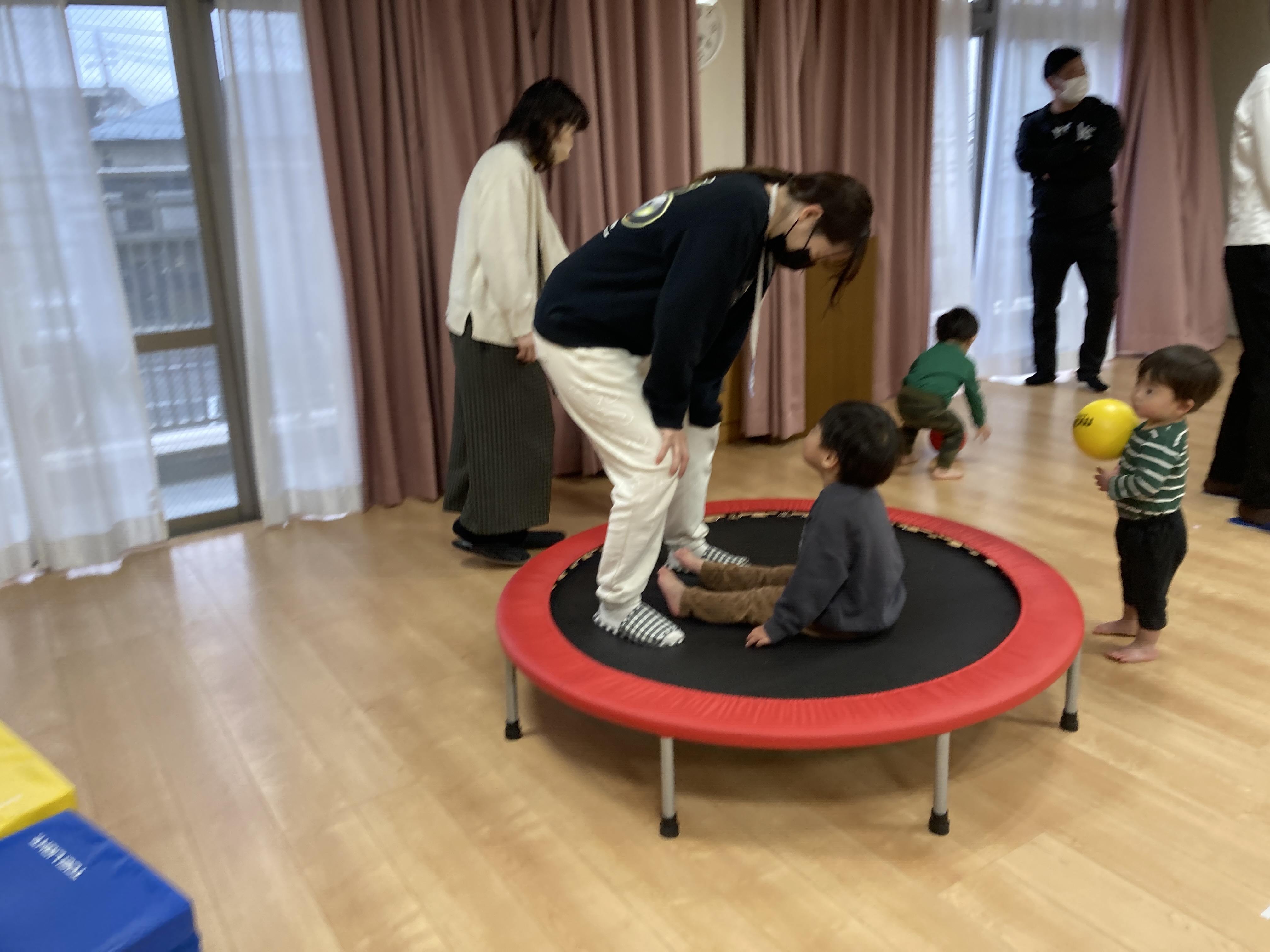 まずはおやつを保護者の方と一緒に食べました。いつもと違う環境に驚いて泣いてしまう子やママやパパと会えて大喜びの子どもたちの姿が見られましたよ!