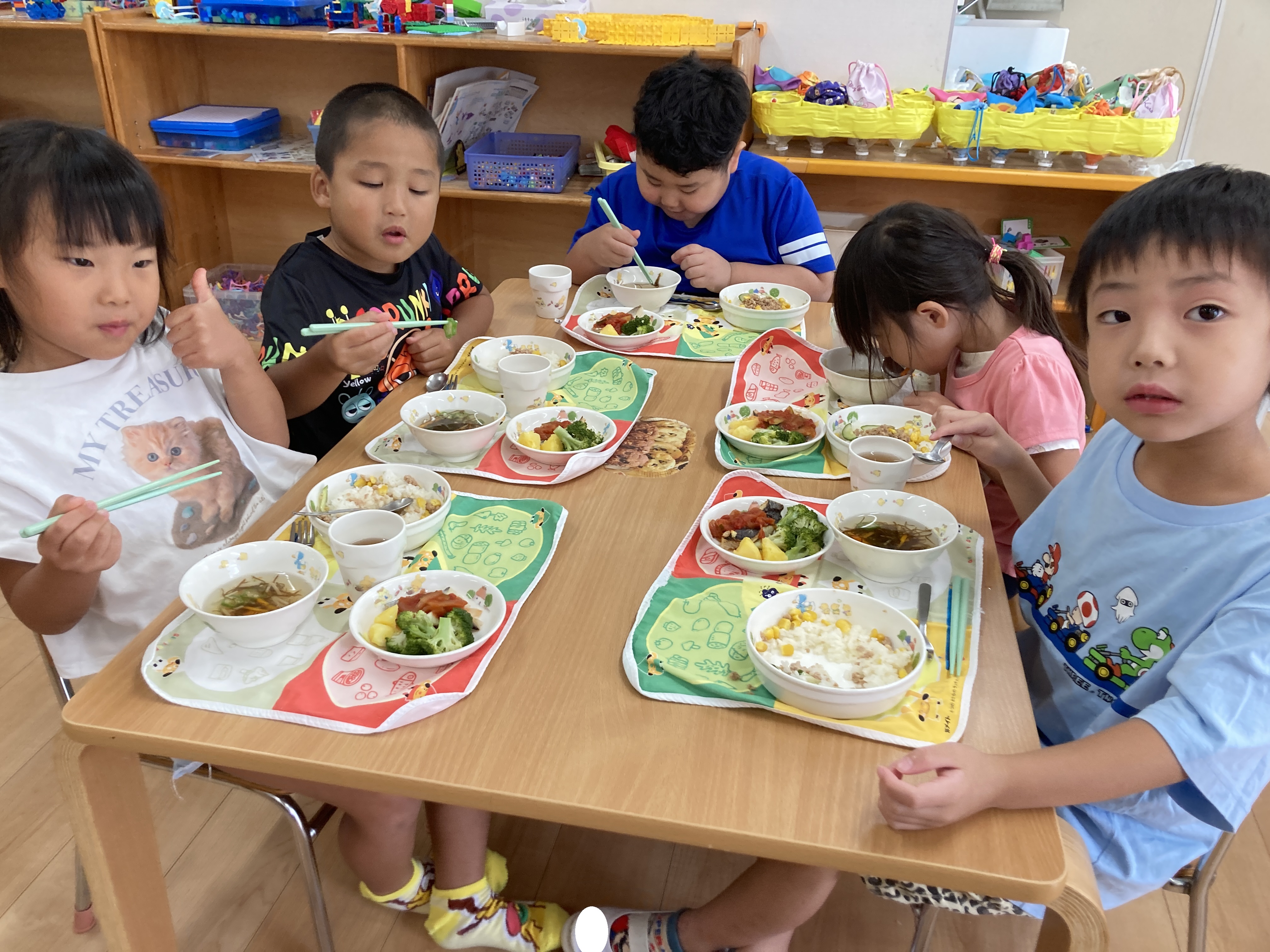 「今日の給食はなにかな~♪」と楽しみにしながら、子ども達は今日も笑顔いっぱいで食べています!