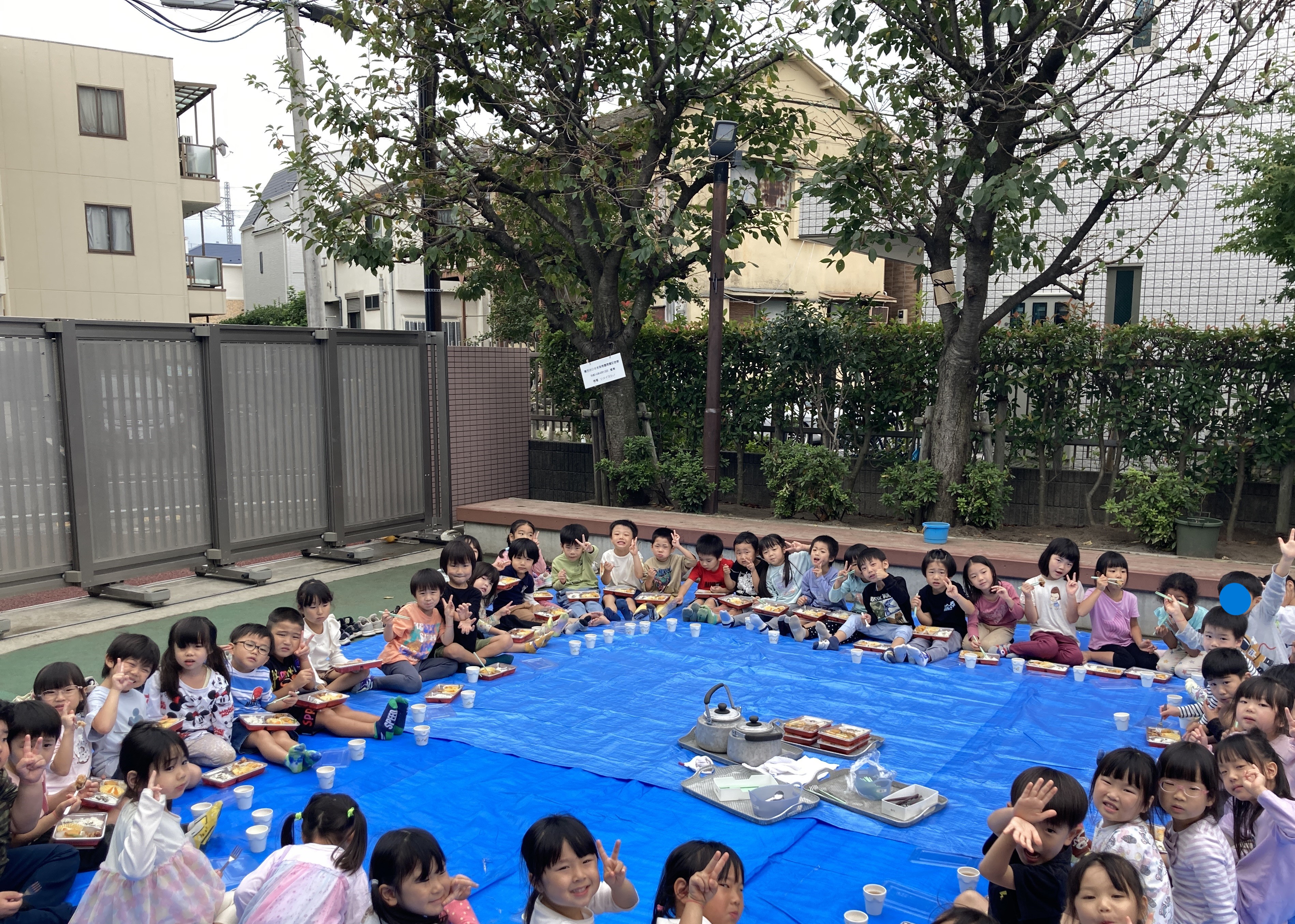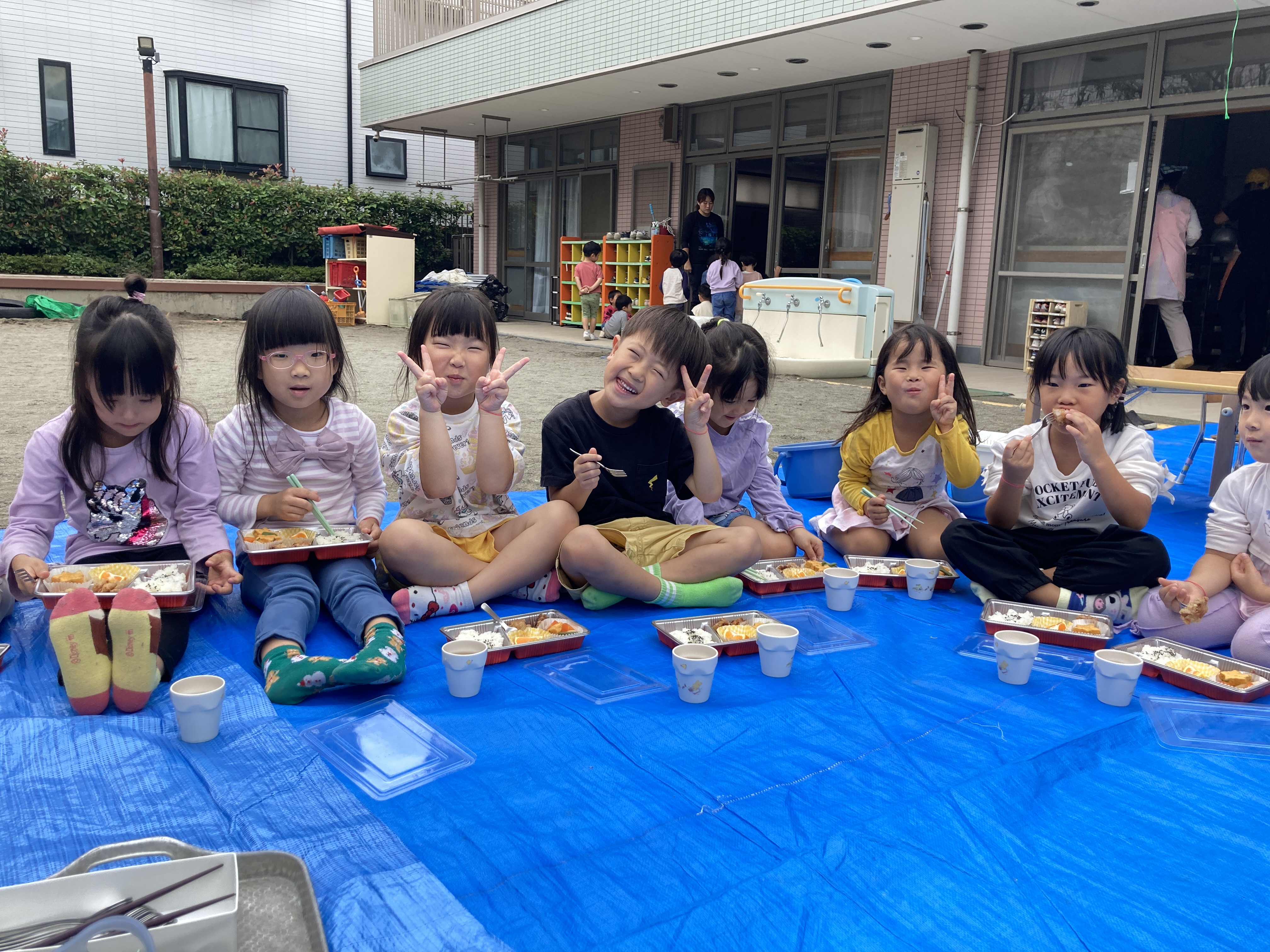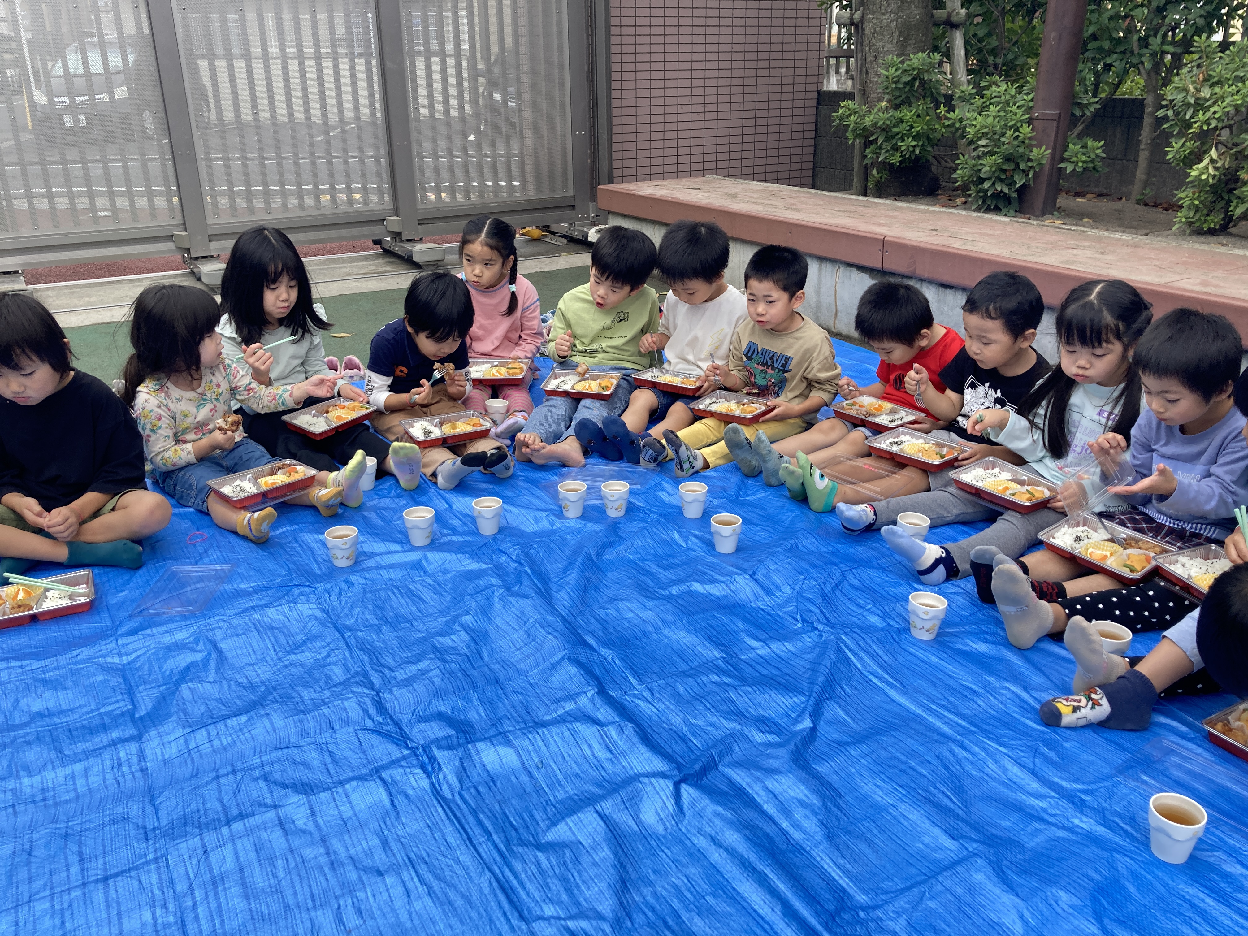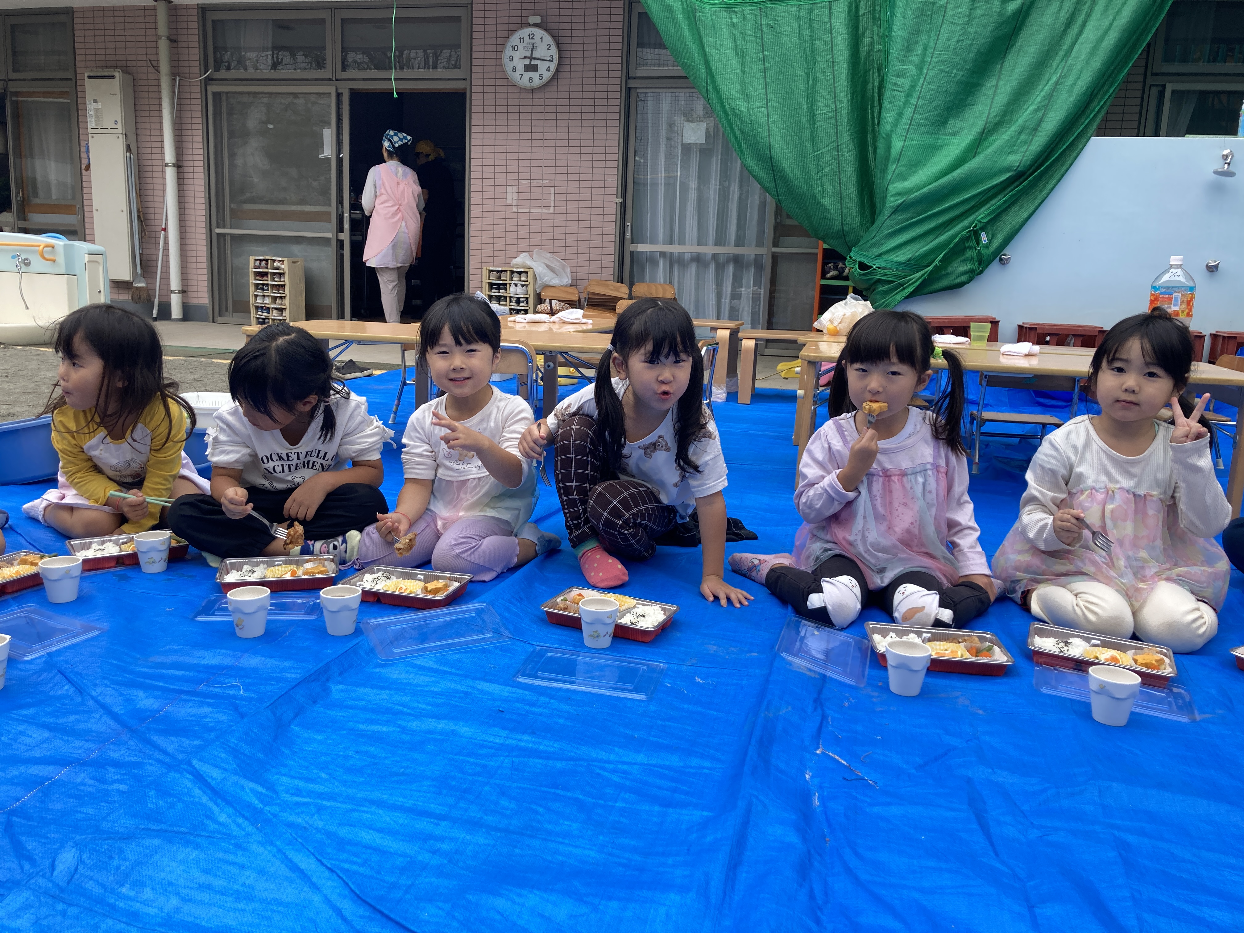 園庭ではひまわり組とゆり組一緒にグリーンテラスにレジャーシートを敷いて食べました。お弁当を受け取ると「美味しそう」「じゃがいもってよく噛んで食べると甘いよね」とお友達と会話を楽しみながらもりもりたべていましたよ。
