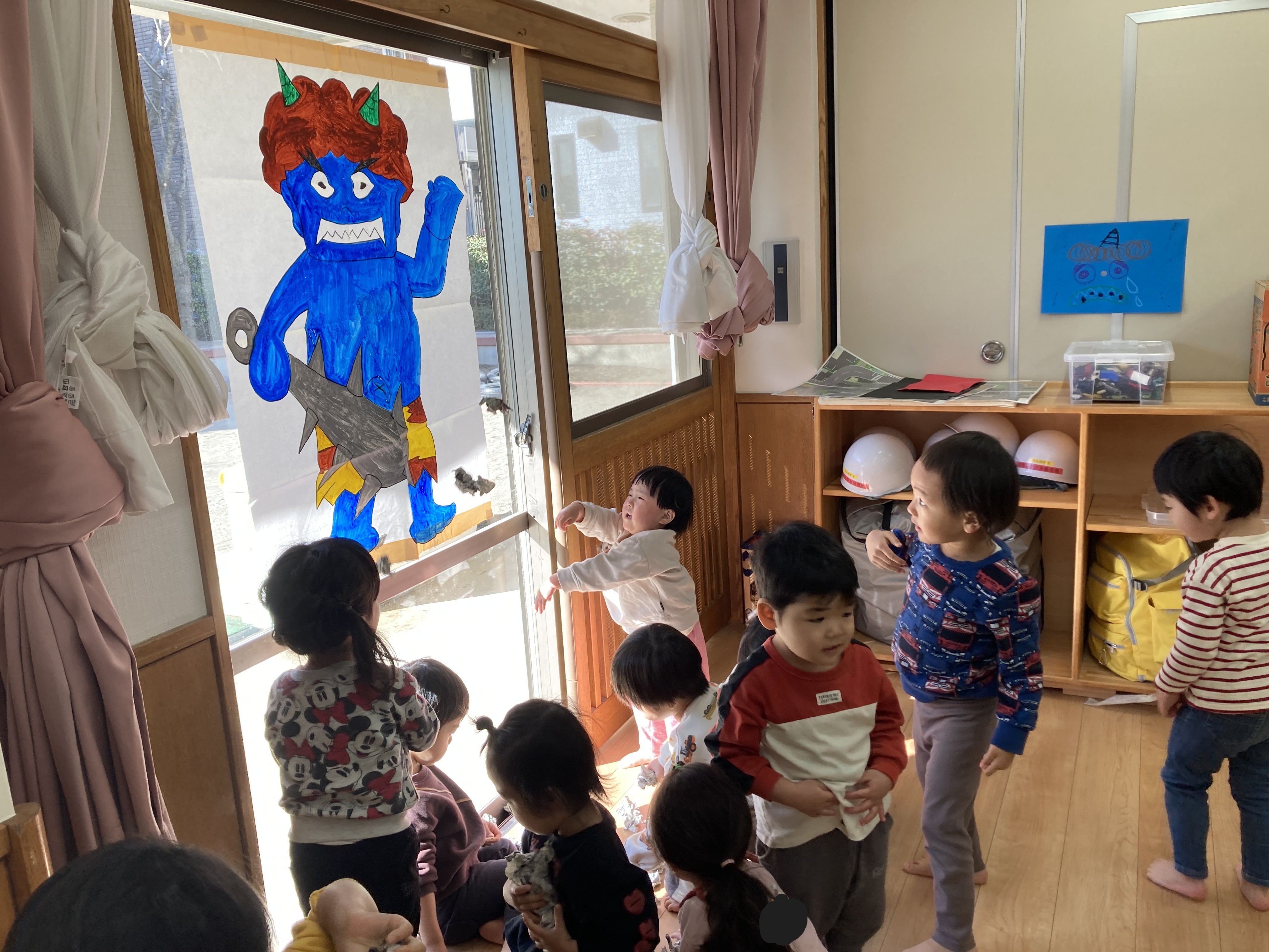 手作りの棍棒やお面を身につけての豆まきもとても盛り上がり、「おにはそと」「ふくはうち」の掛け声が園内に響いていました!