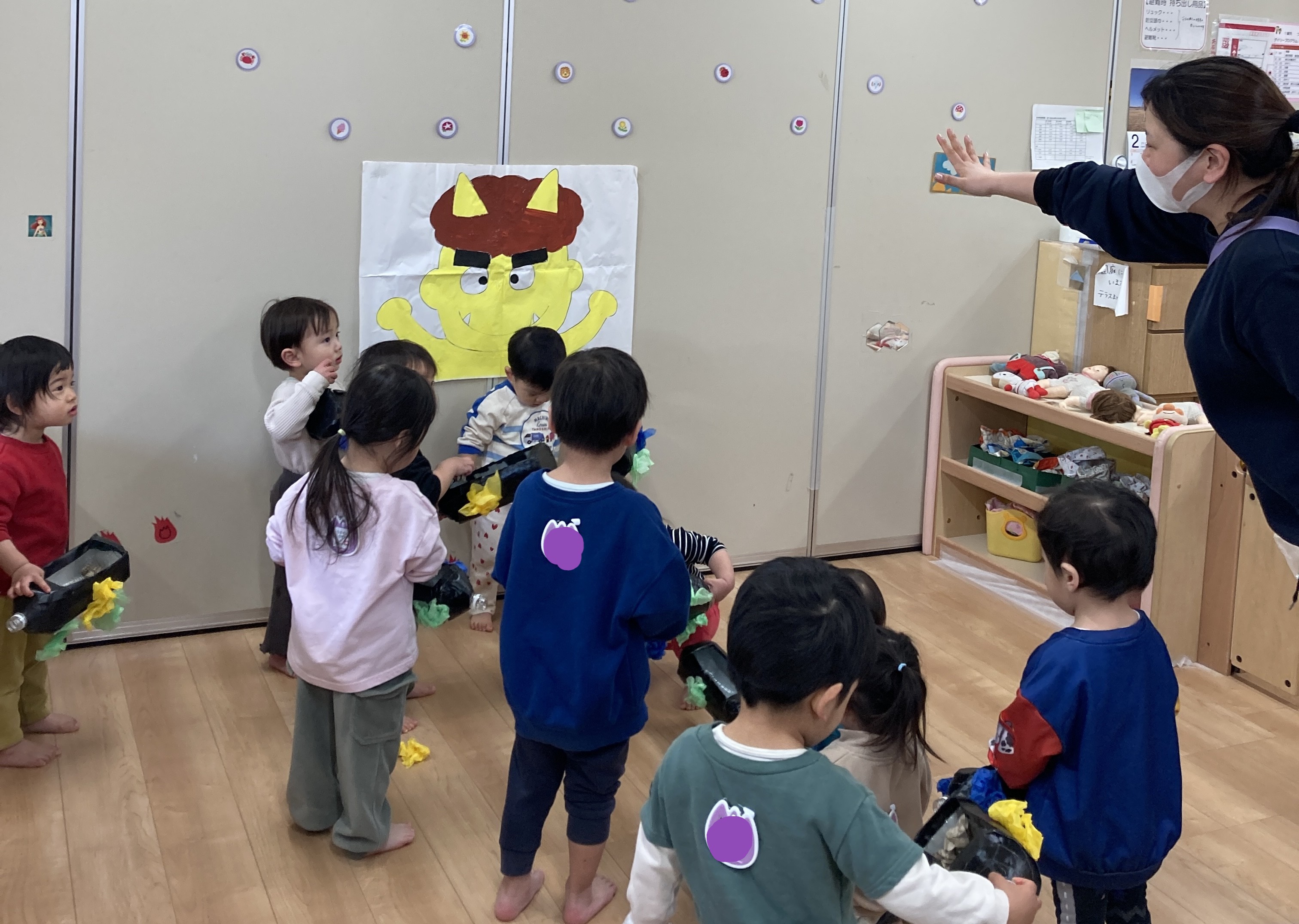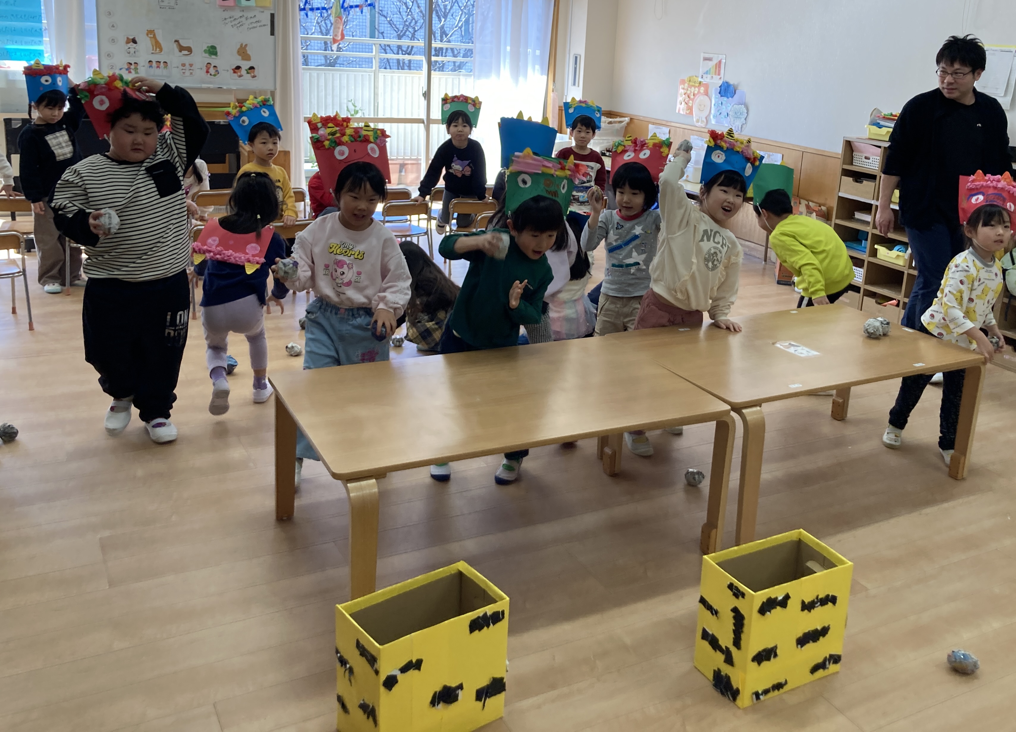 感染症の流行により、残念ながら全園児集まっての豆まきは叶いませんでしたが、各クラスで力いっぱい手作り豆を投げ、鬼を追い払いましたよ。