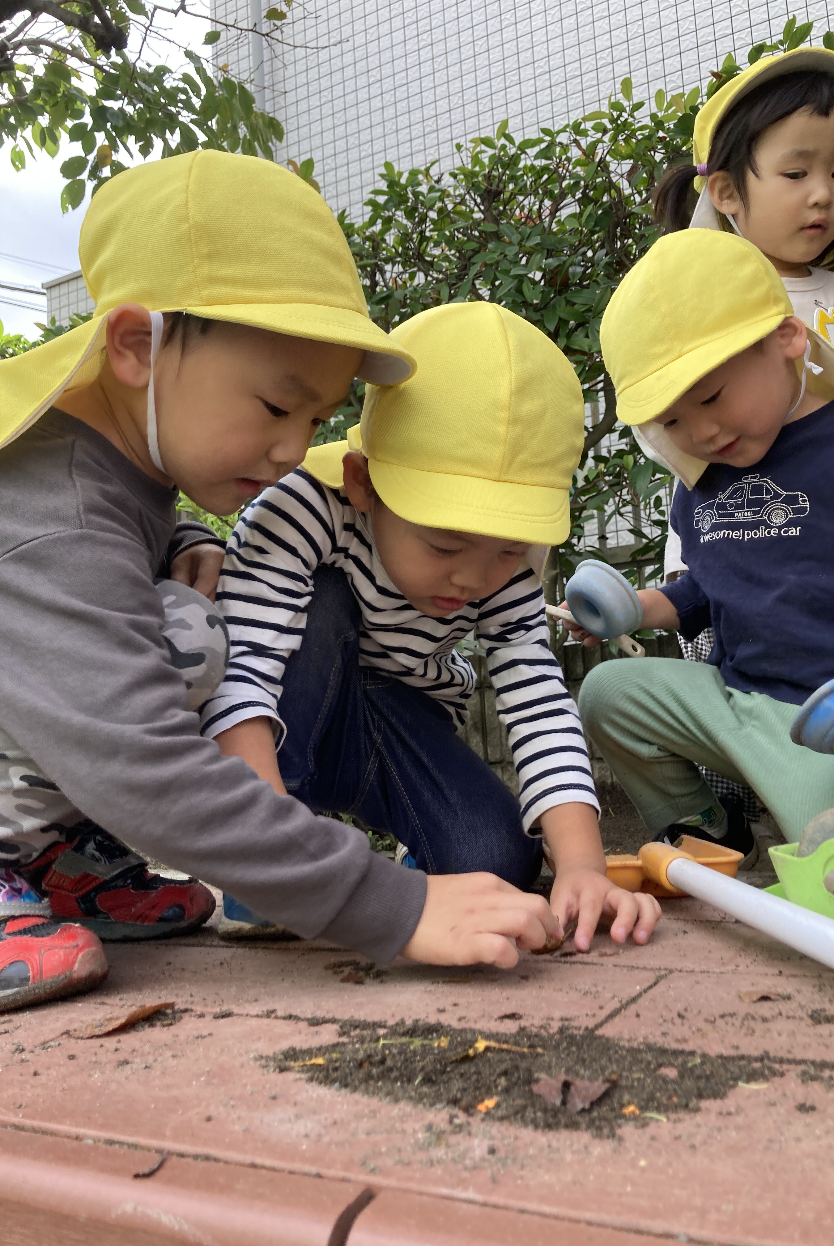 虫や植物などの自然に触れ、興味津々のこども達。