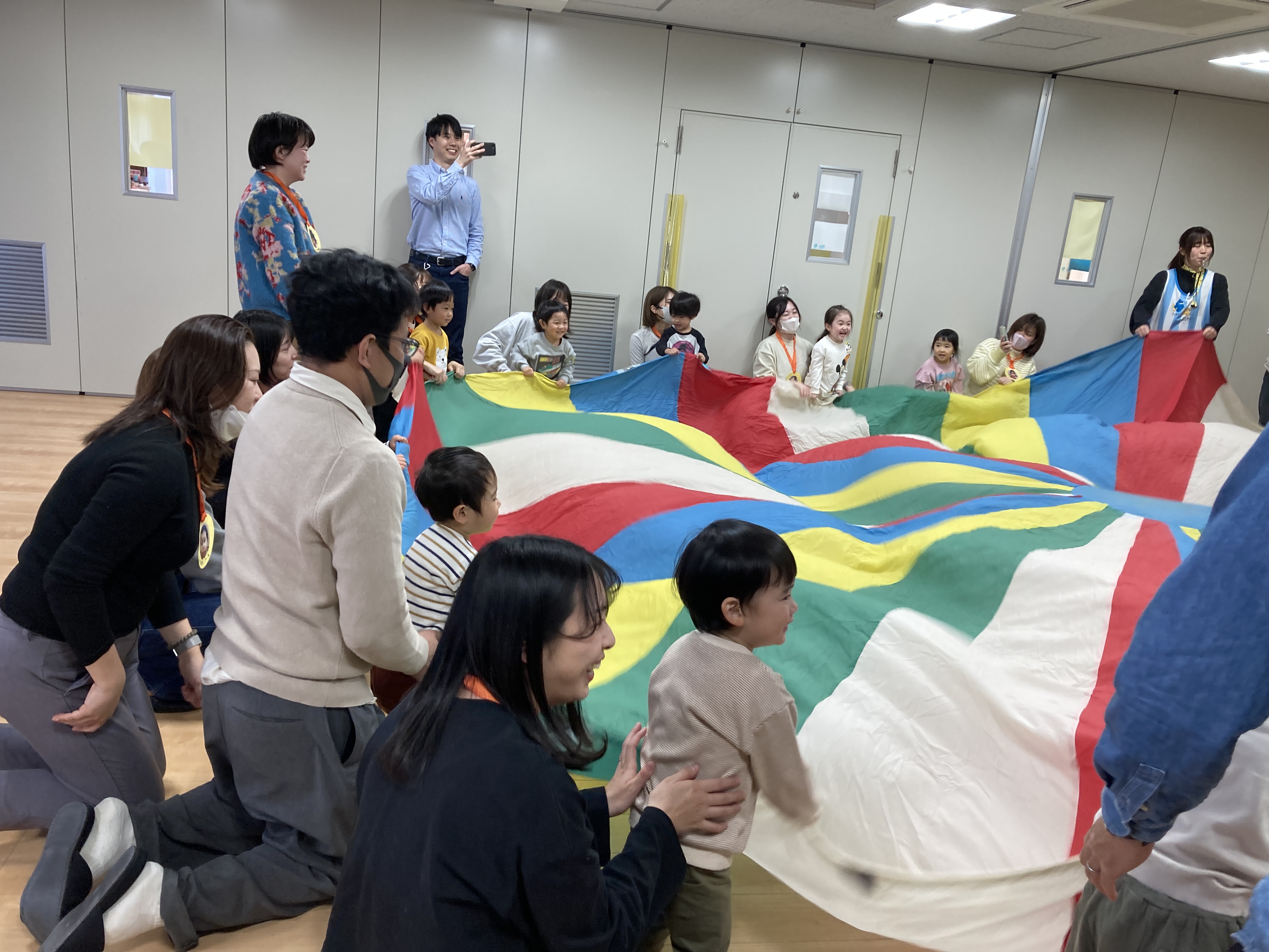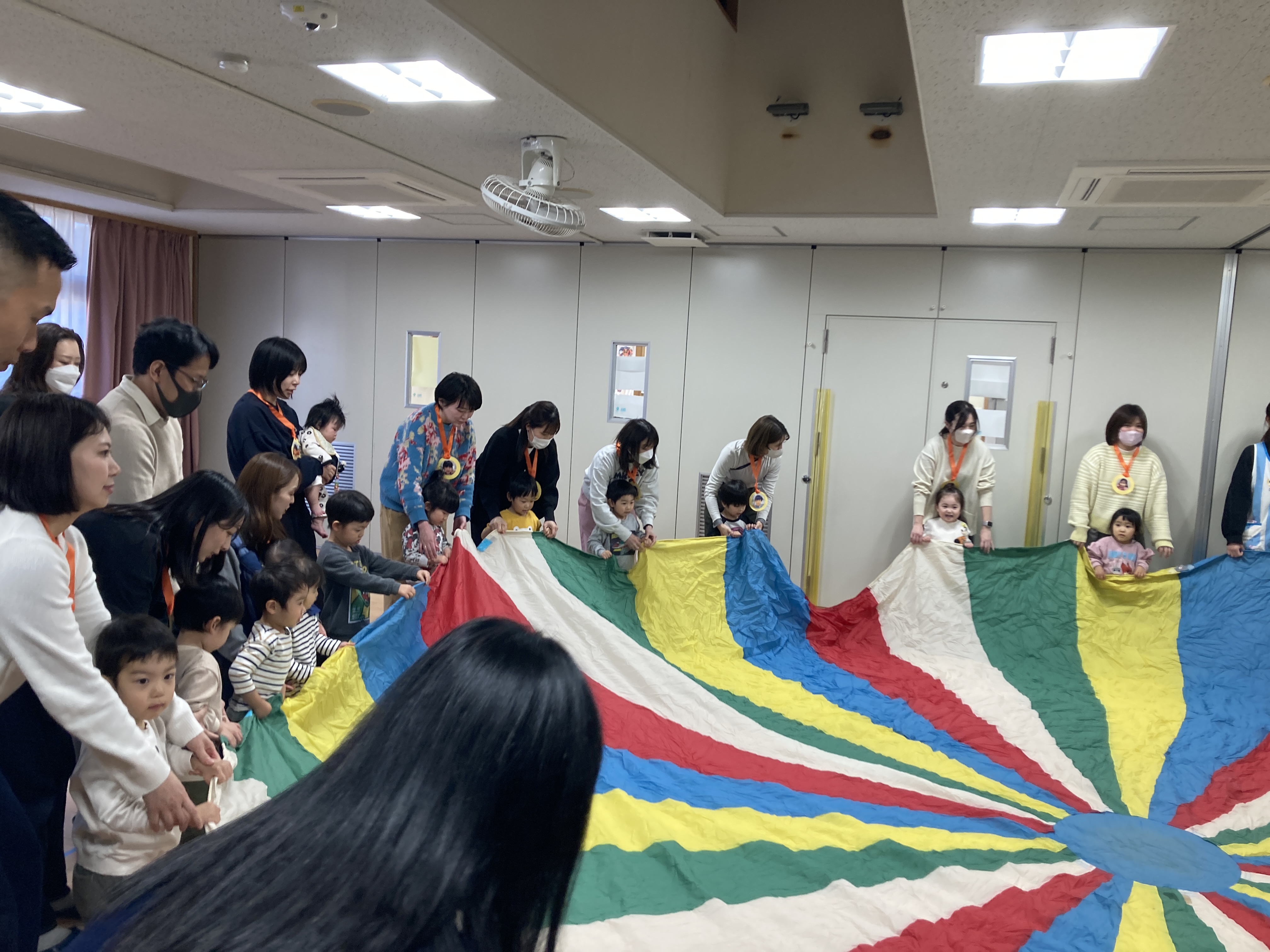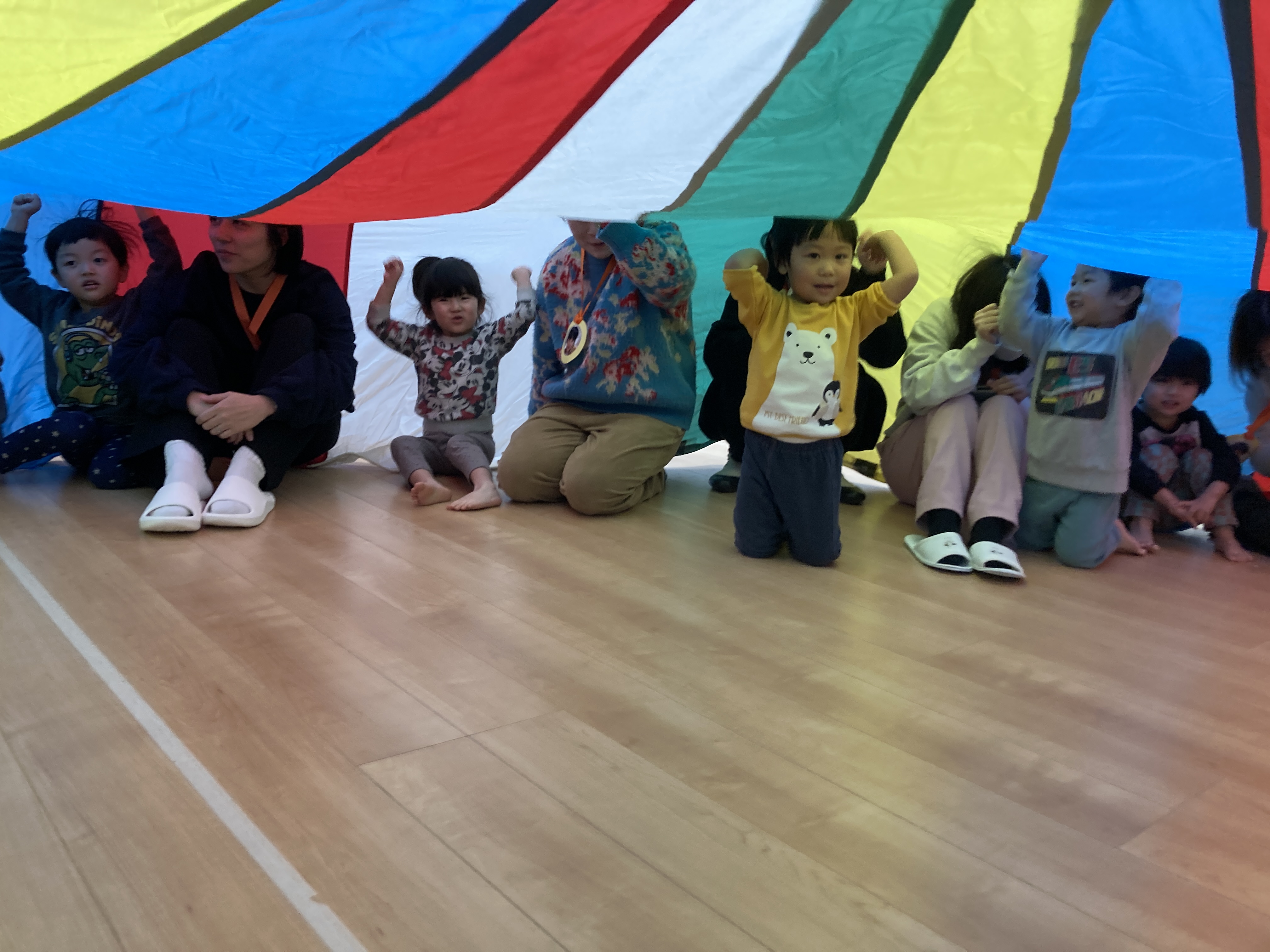 パラバルーンでは、保護者の方と一緒に「おおなみ」や「こなみ」など保育士の言葉を聞きながら上手にバルーンを扱っていたたんぽぽ組さん。少し難しい技にも挑戦しましたよ。バルーンの中に入る「おうち」や「ぼうし」が人気で楽しい声がホールに響いていました。最後はかけっこをして保護者の方に向かって走り抜けました!