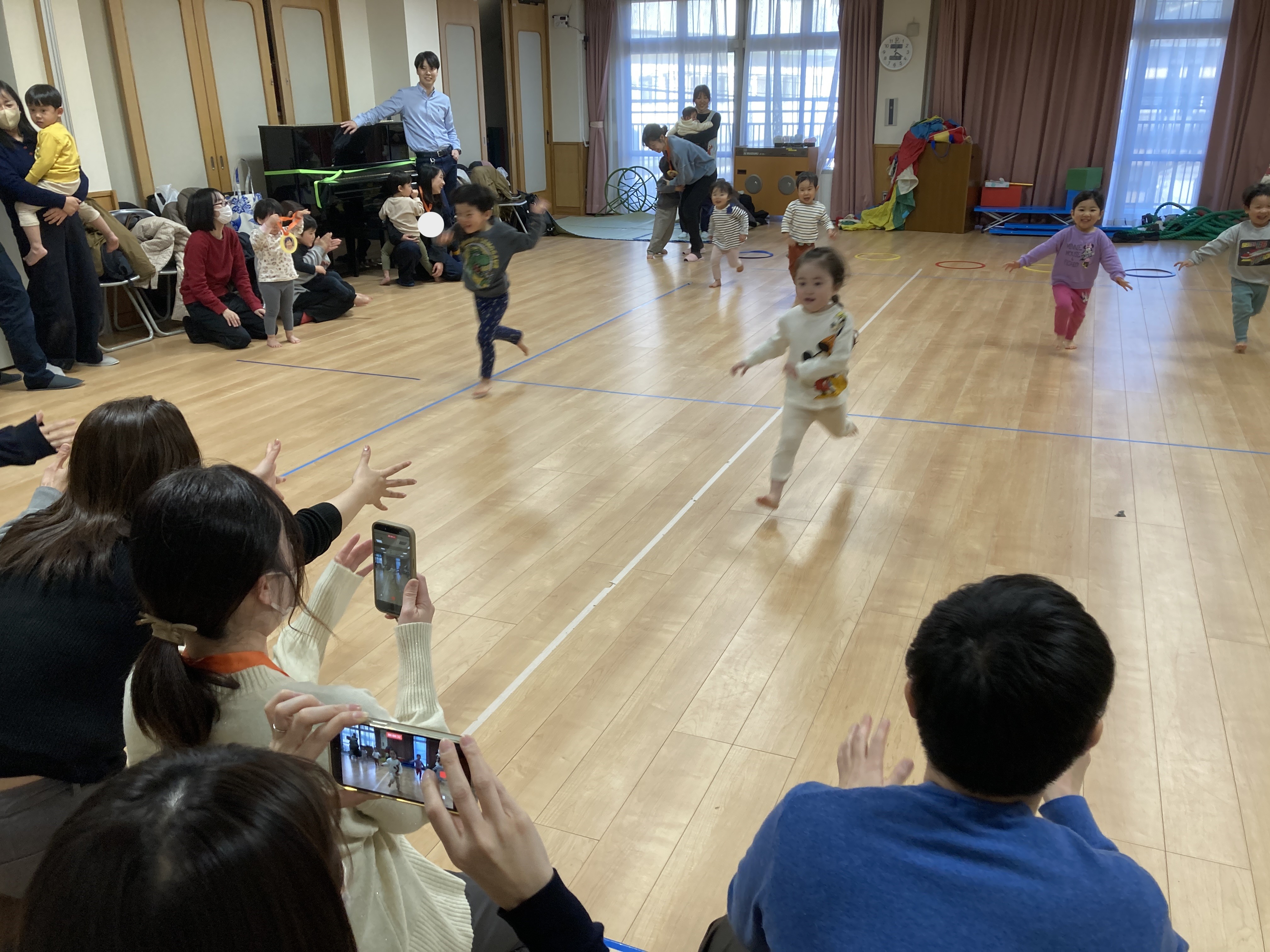 日々、楽しみながら取り組んでいた「もりのおふろ」の劇ごっこを披露しました。大好きな保護者の方に見守れていつも以上のニコニコ笑顔で取り組んでいた、たんぽぽ組のお友達たち。その後の歌「雪だるまのチャチャチャ」や手遊び「大阪うまいもんの歌」「にしんのひらき」ではドキドキしながらも頑張る姿がありました。