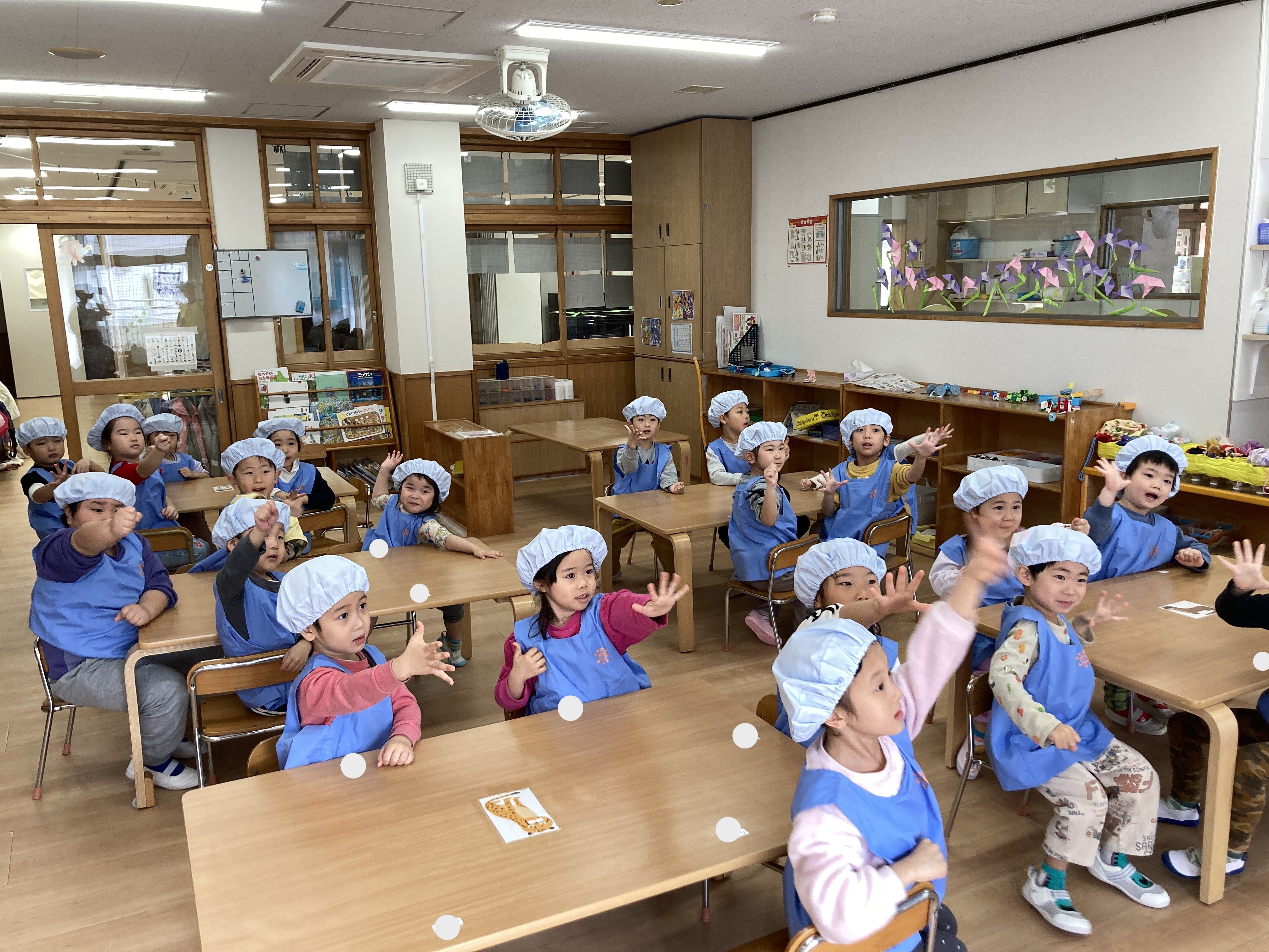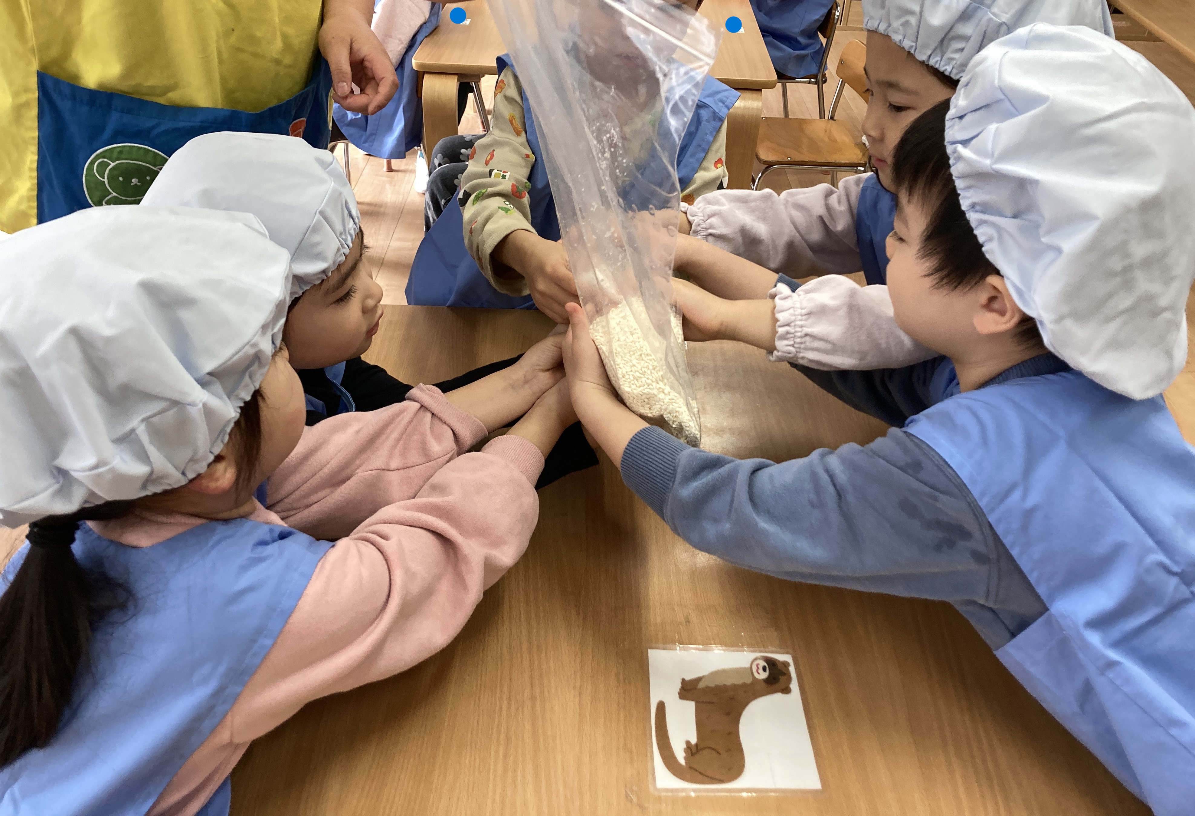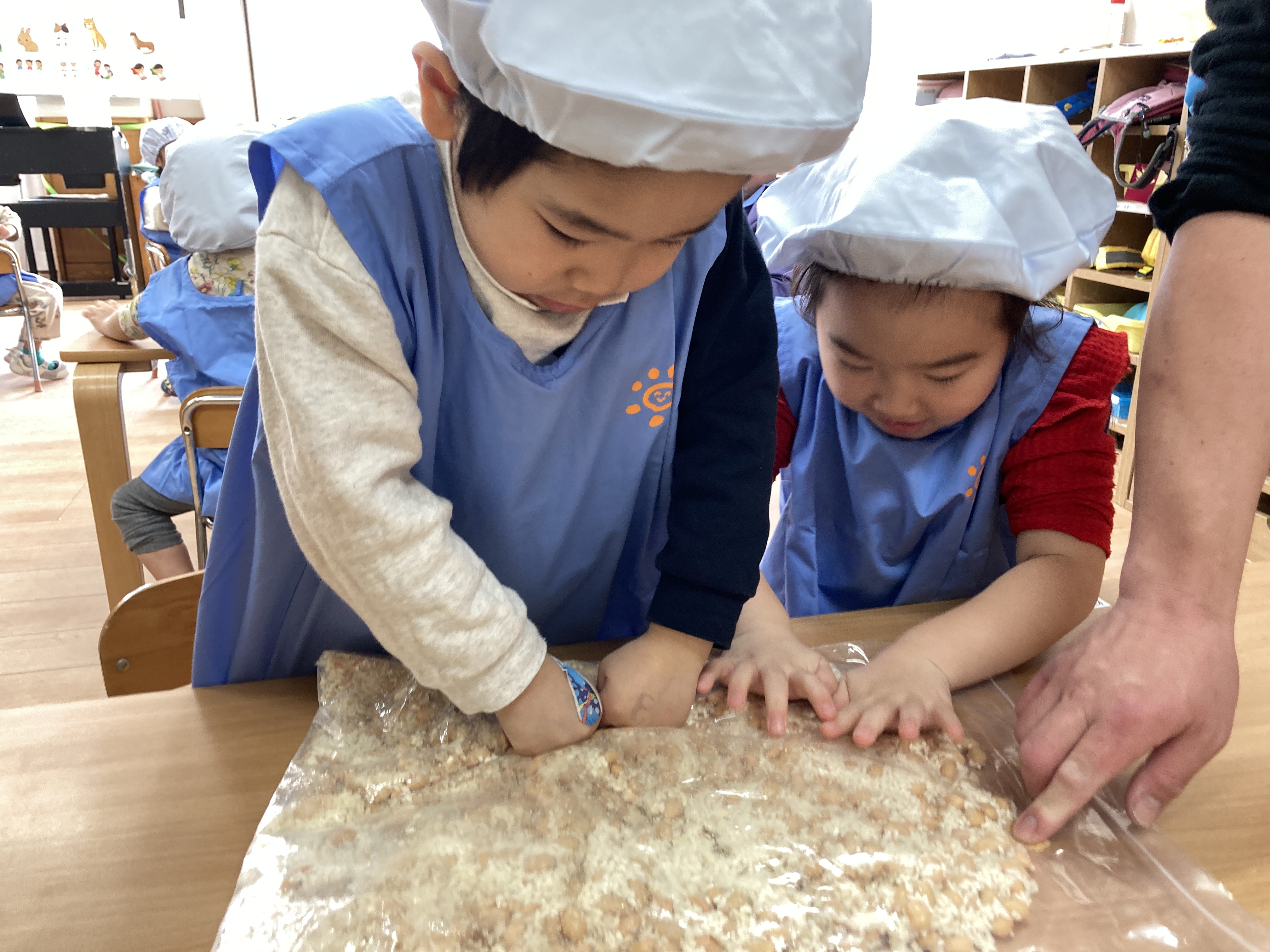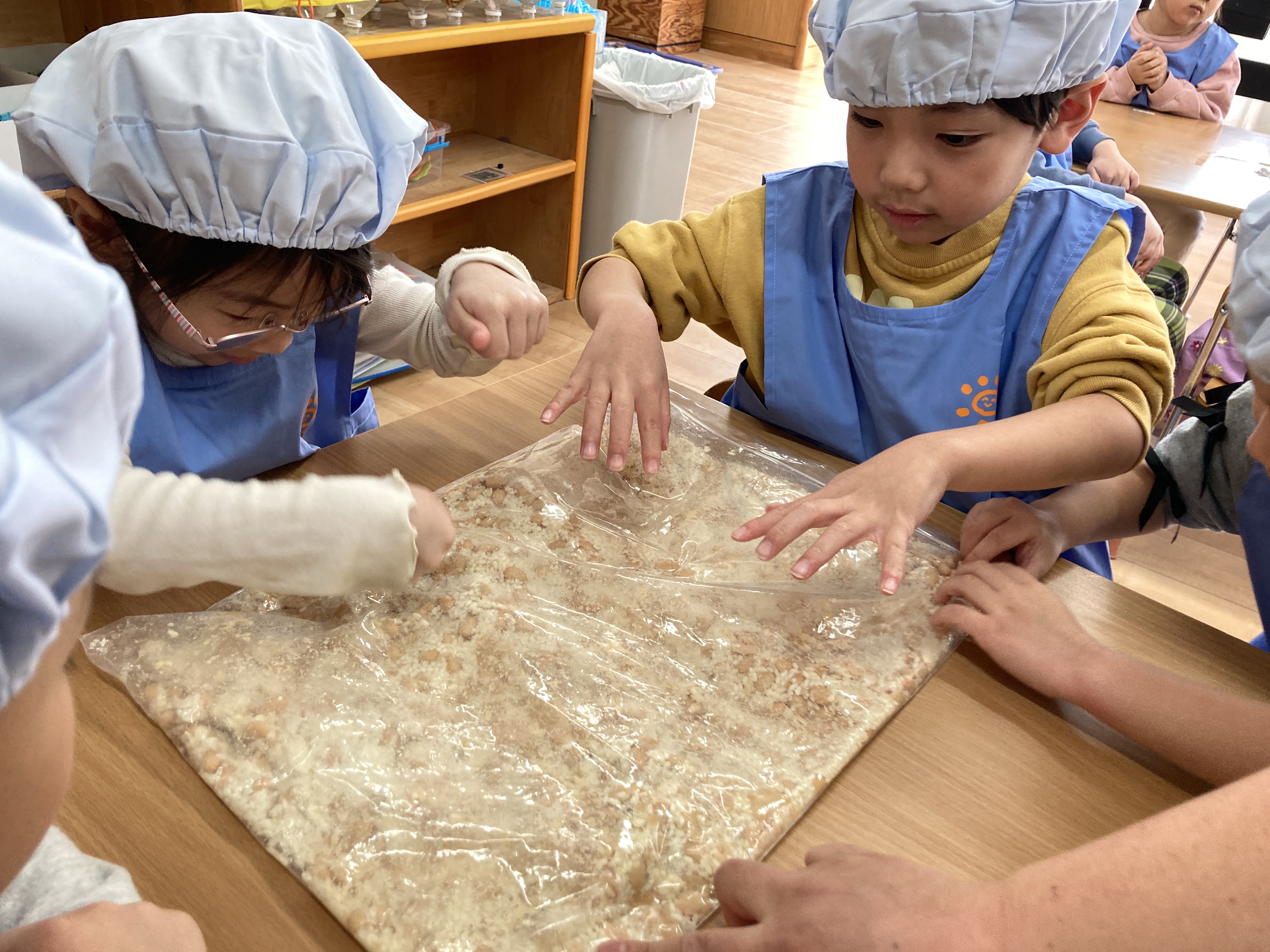 混ぜる前にグーパーグーパー手を動かし混ぜる準備ばっちりなゆり組さんのおかげで、だんだん白っぽさが少なくなってきましたよ。手で優しく混ぜながら「おいしくなれ~」とおまじないをかける子ども達が可愛らしかったです。混ぜ合わせたものは暗い場所で保管し、ひまわり組さんになった夏頃に食べられることを知らせると、「早く食べたいな」「味噌汁飲めると良いな」などなど味噌になることを楽しみにする様子が見られました。