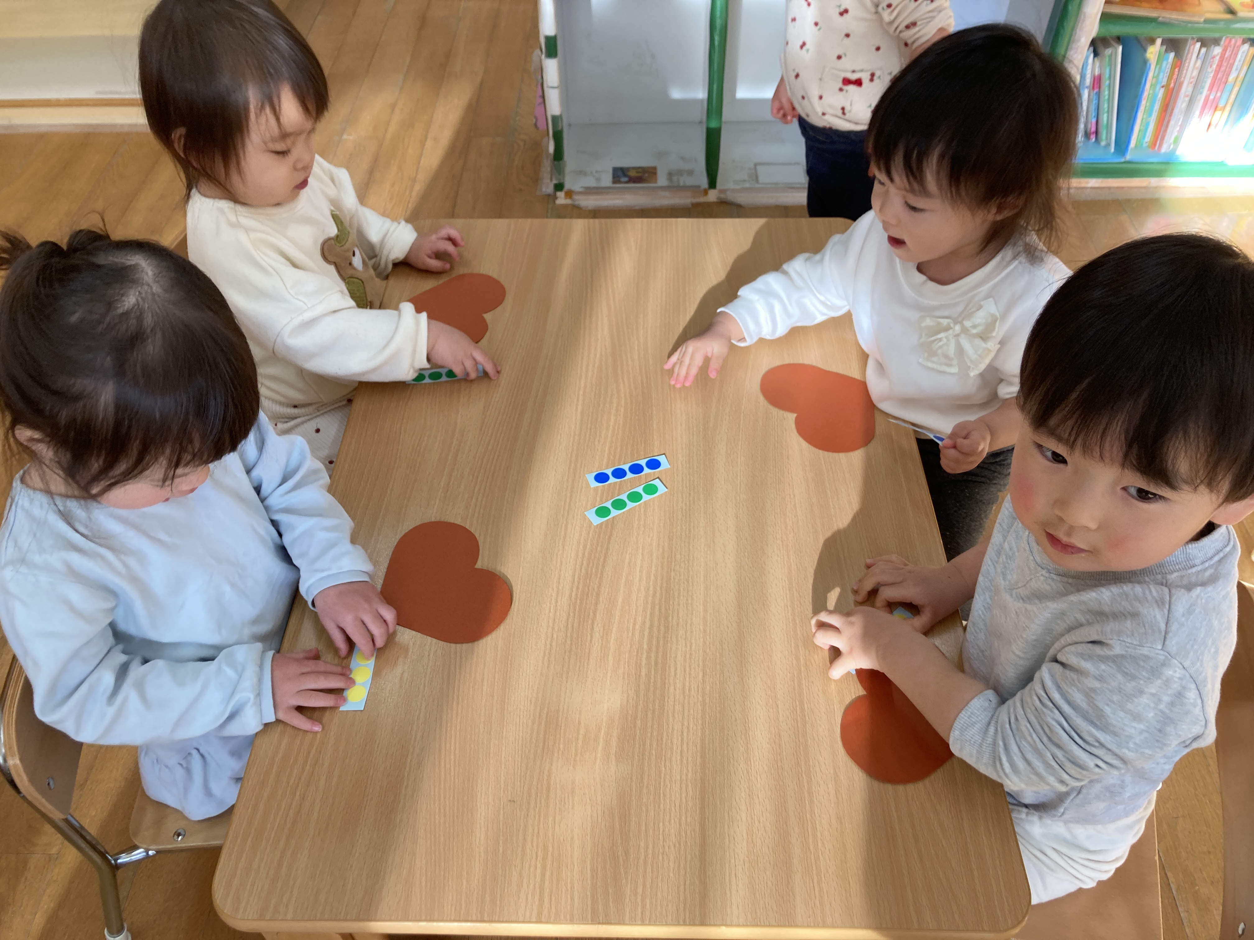 ひよこ組では、バレンタインに向け、シール貼りでチョコを作りました♪