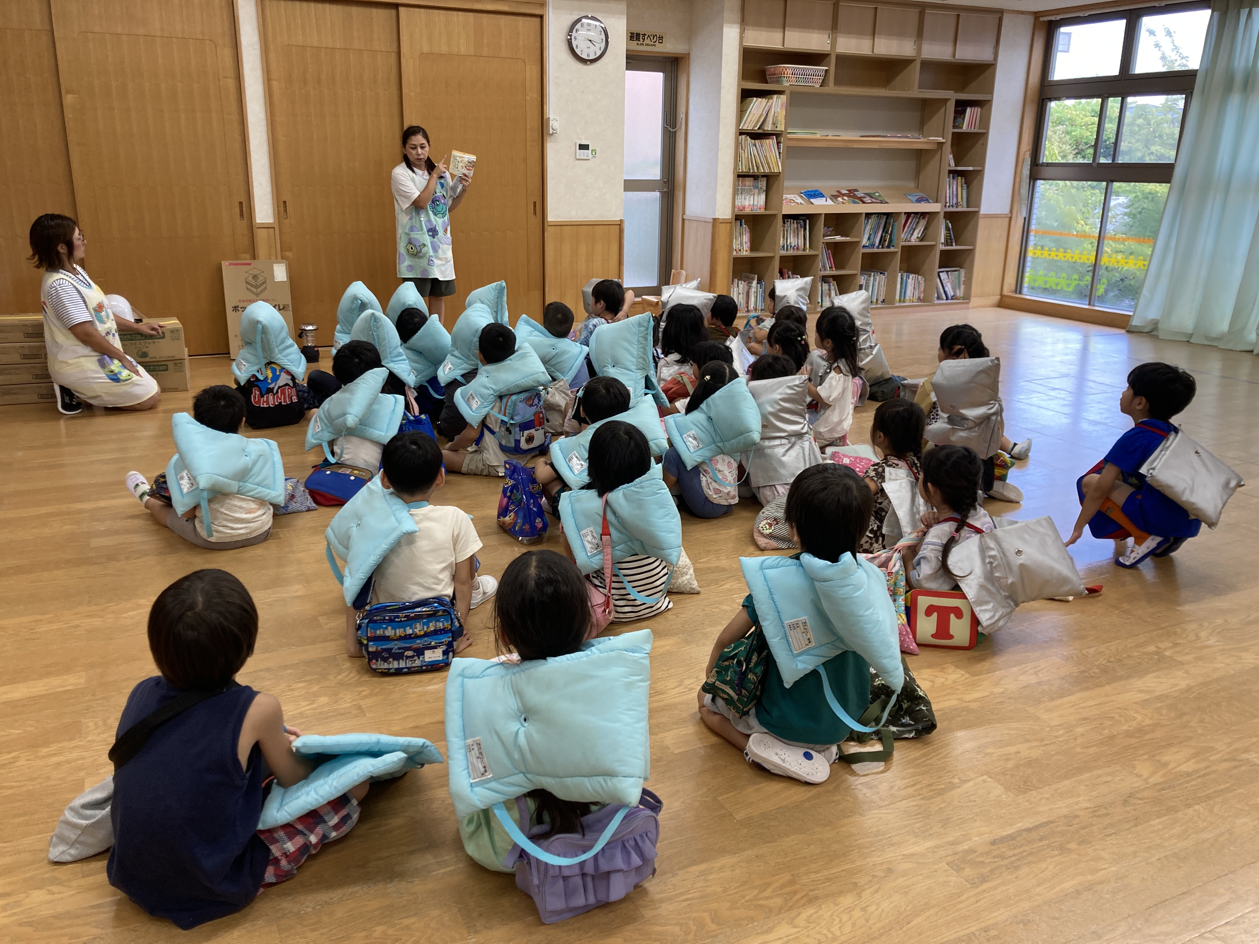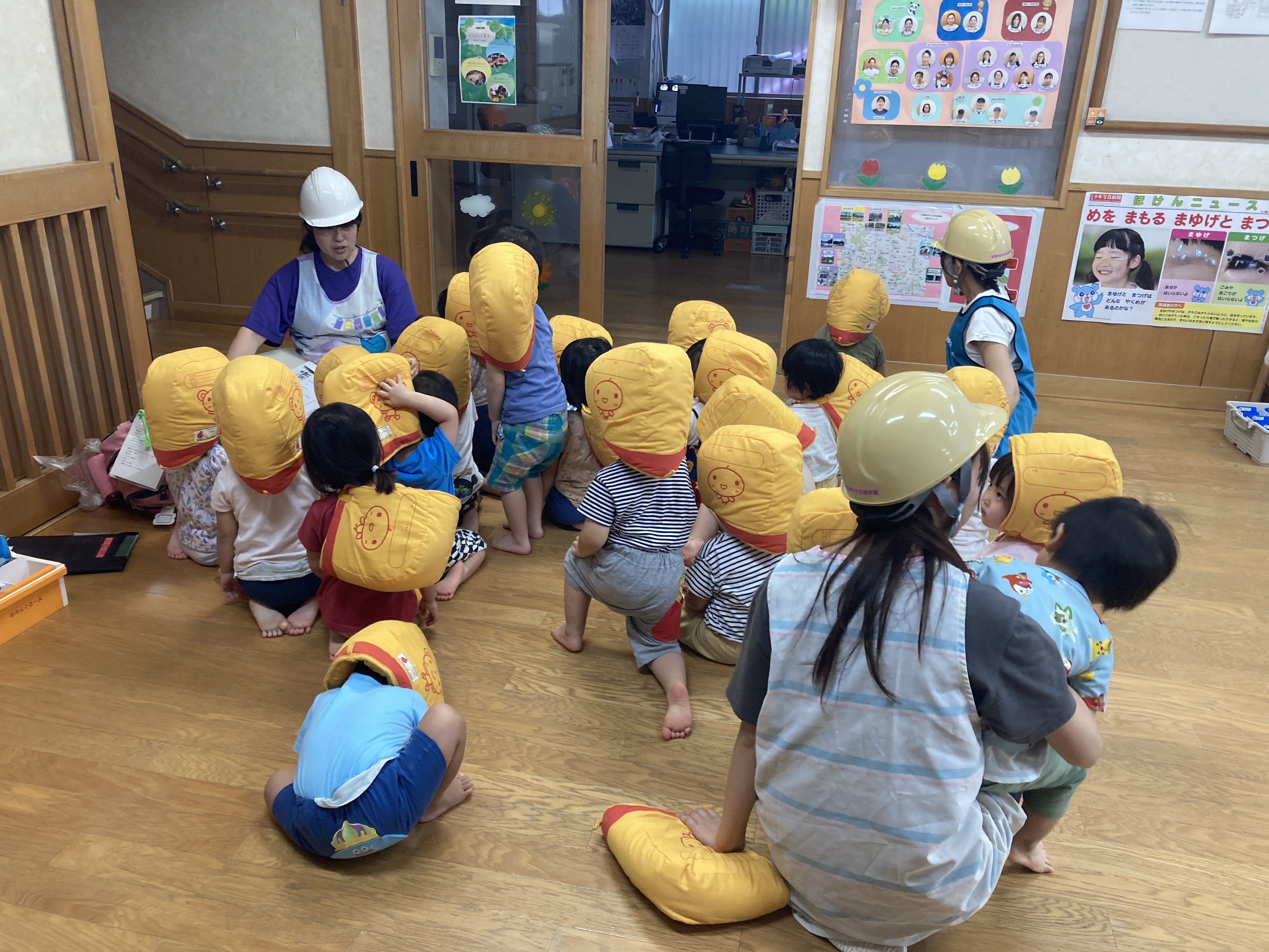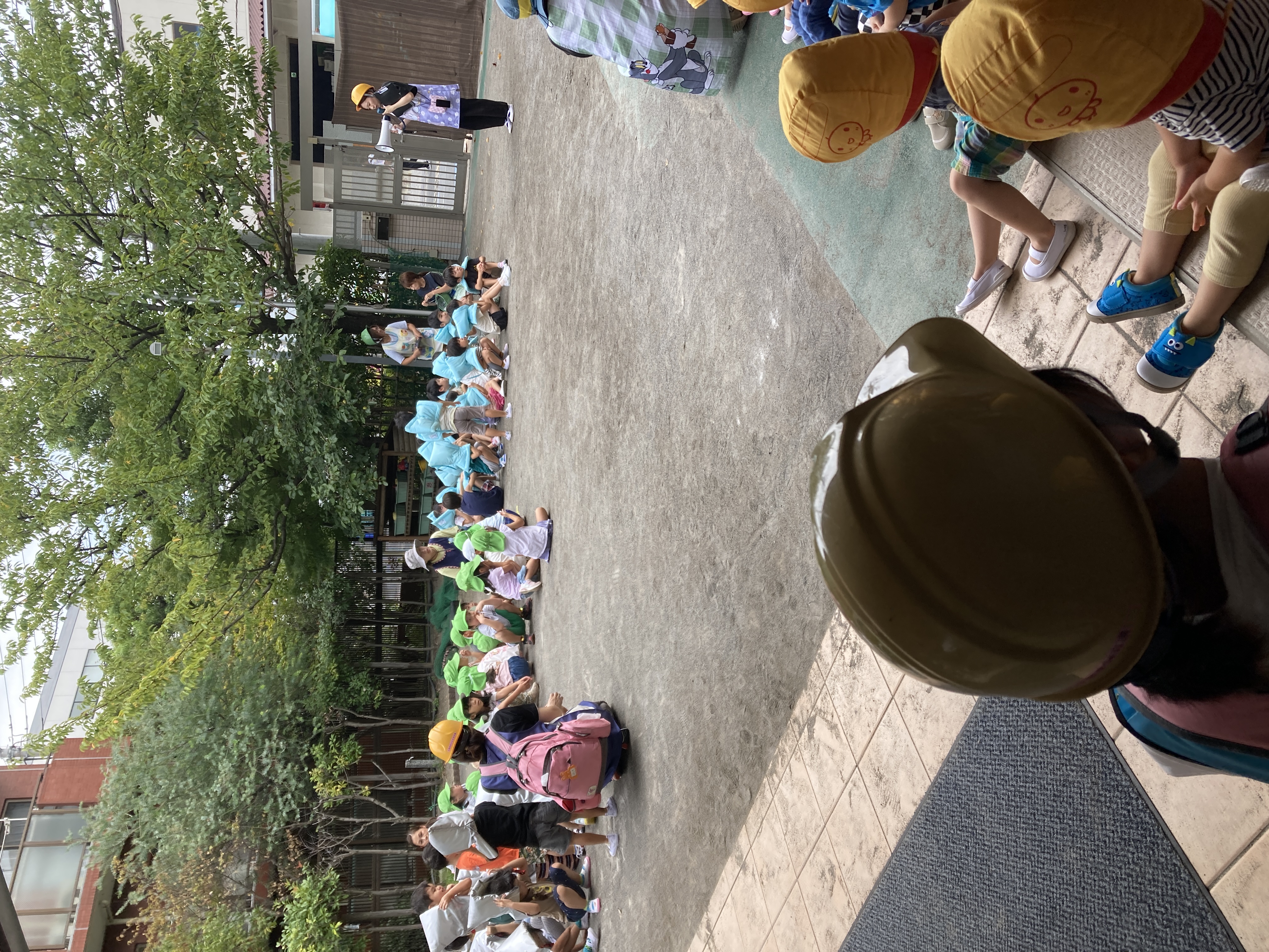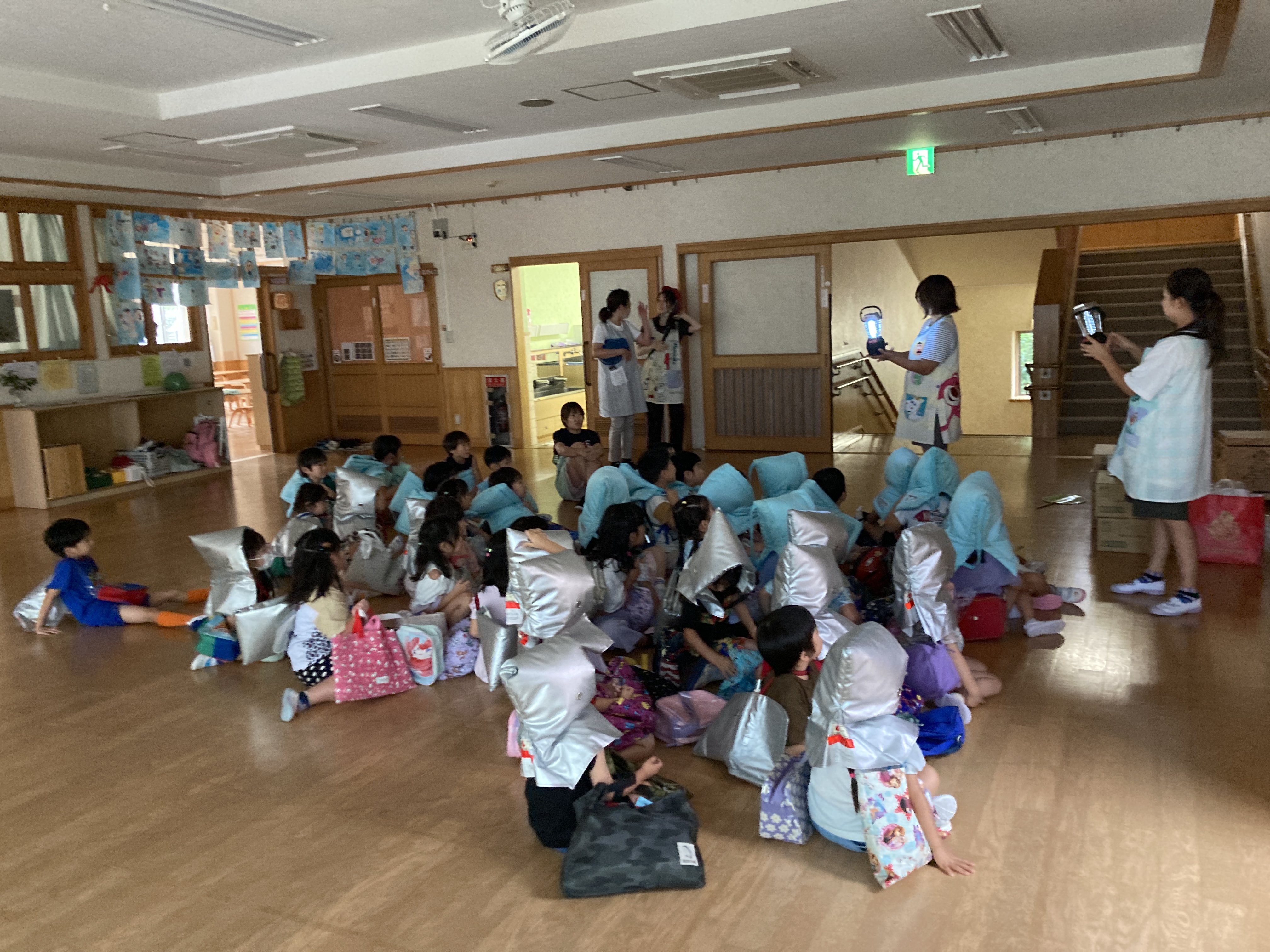 職員の話をしっかりと聞き、上手に避難することが出来ました。避難してから、子ども達に避難訓練の『お・か・し・も』の約束の話をすると、しっかりと答えることが出来ていました。