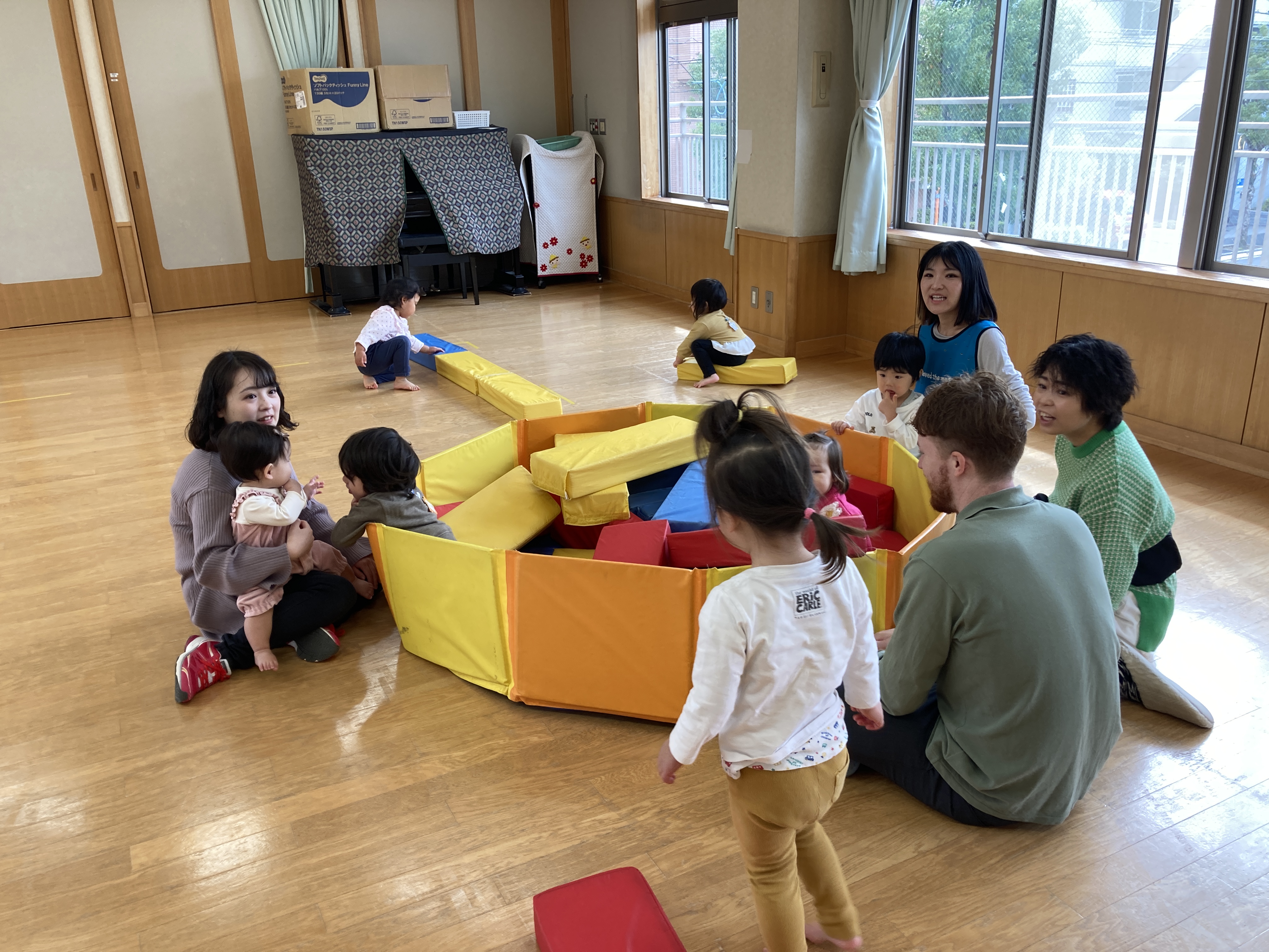 皆が大好きソフトブロックのプールでは、子育て広場に参加してくれたお友達も一緒に入ってブロックの中を歩いてみたり、気になるようで覗きに来てくれて、自分たちよりも小さい子が好きな2歳児さんたちが、笑顔で楽しさをアピールしてくれていました。